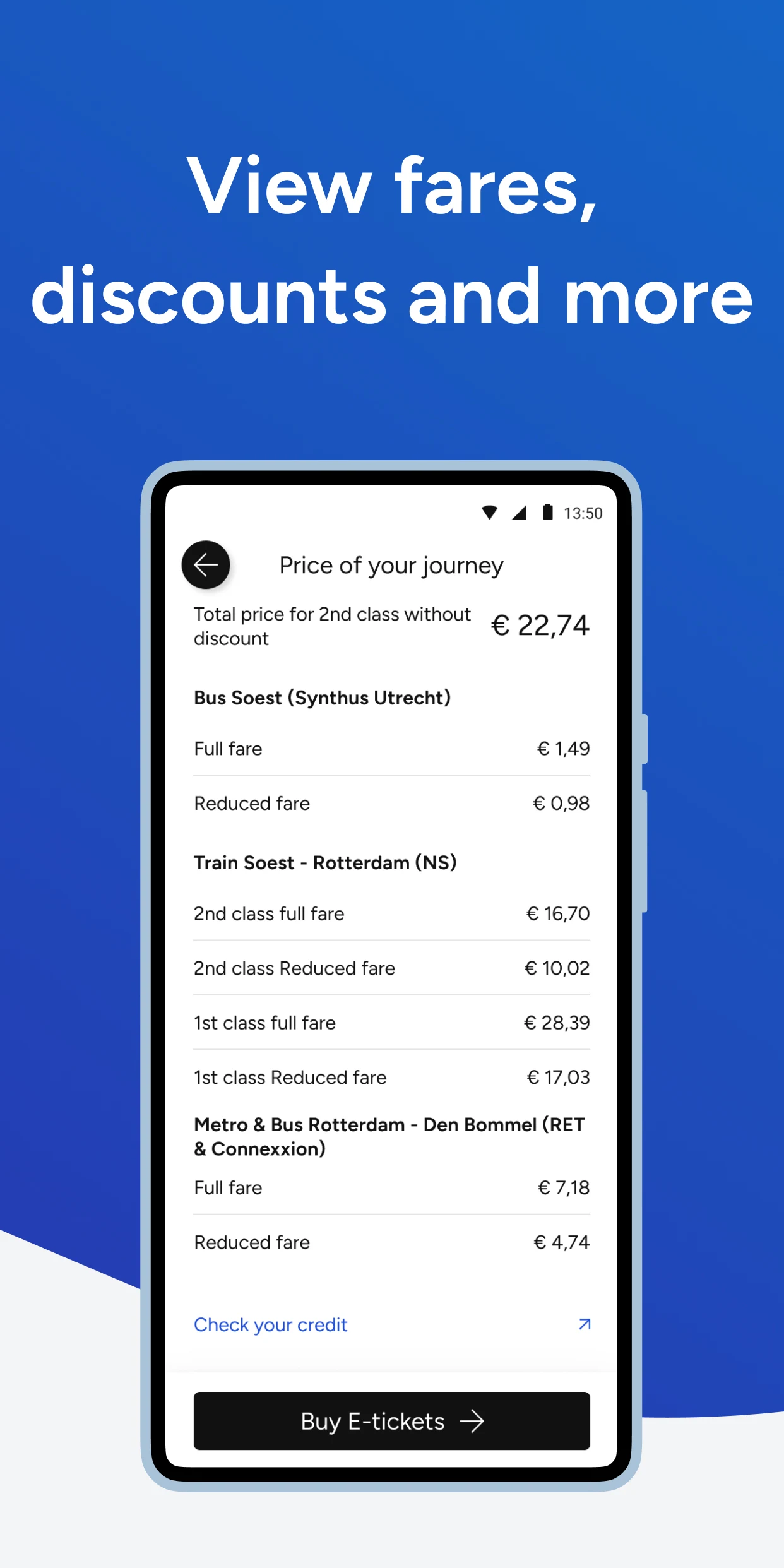 Purchase e-tickets directly from the travel recommendations within the 9292 app. Affiliated public transport services for buses, trams, metros, and ferries include Arriva, Breng, Connexxion, EBS, Hermes, HTM, Keolis, RET, U-OV, and Waterbus. National train services like NS, Blauwnet, Qbuzz, Connexxion, Arriva, and Keolis are also supported.