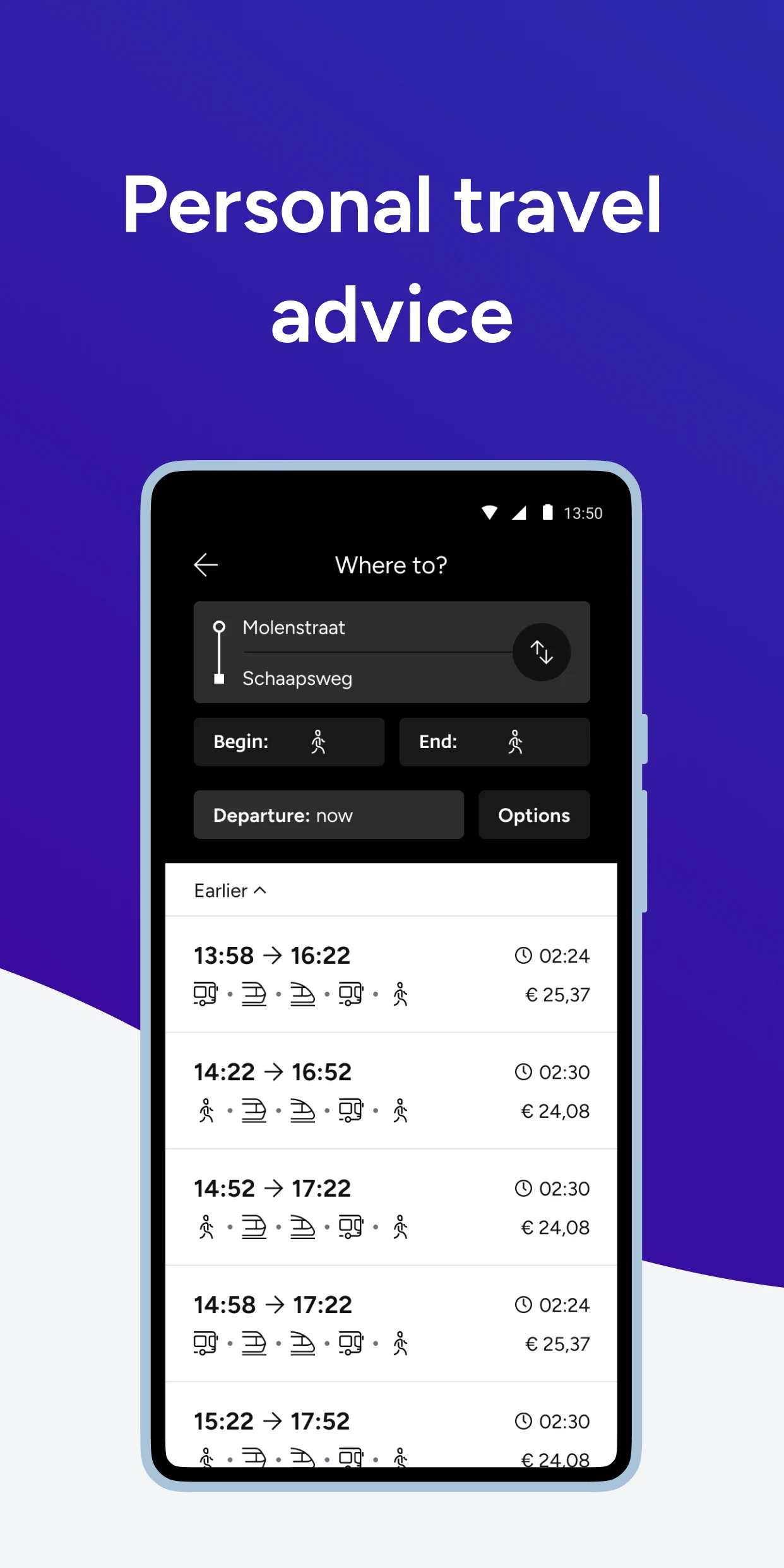 With the 9292 travel planner, you can seamlessly plan your journeys throughout the Netherlands using trains, buses, metros, trams, and ferries. Need to include biking, e-bikes/scooters, or rental bikes in your itinerary? We've got you covered. Simply input your starting point and destination, and we will provide you with real-time travel information for all forms of public transport in the Netherlands. The app also supports Flex-OV services such as the watertaxi in Rotterdam, and in case of any disruptions, we offer alternative routes. Stay updated with live public transport information from NS, Arriva, Connexxion, Breng, Hermes, Keolis, RRReis, Qbuzz, EBS, U-OV, RET, HTM, GVB, and Waterbus.