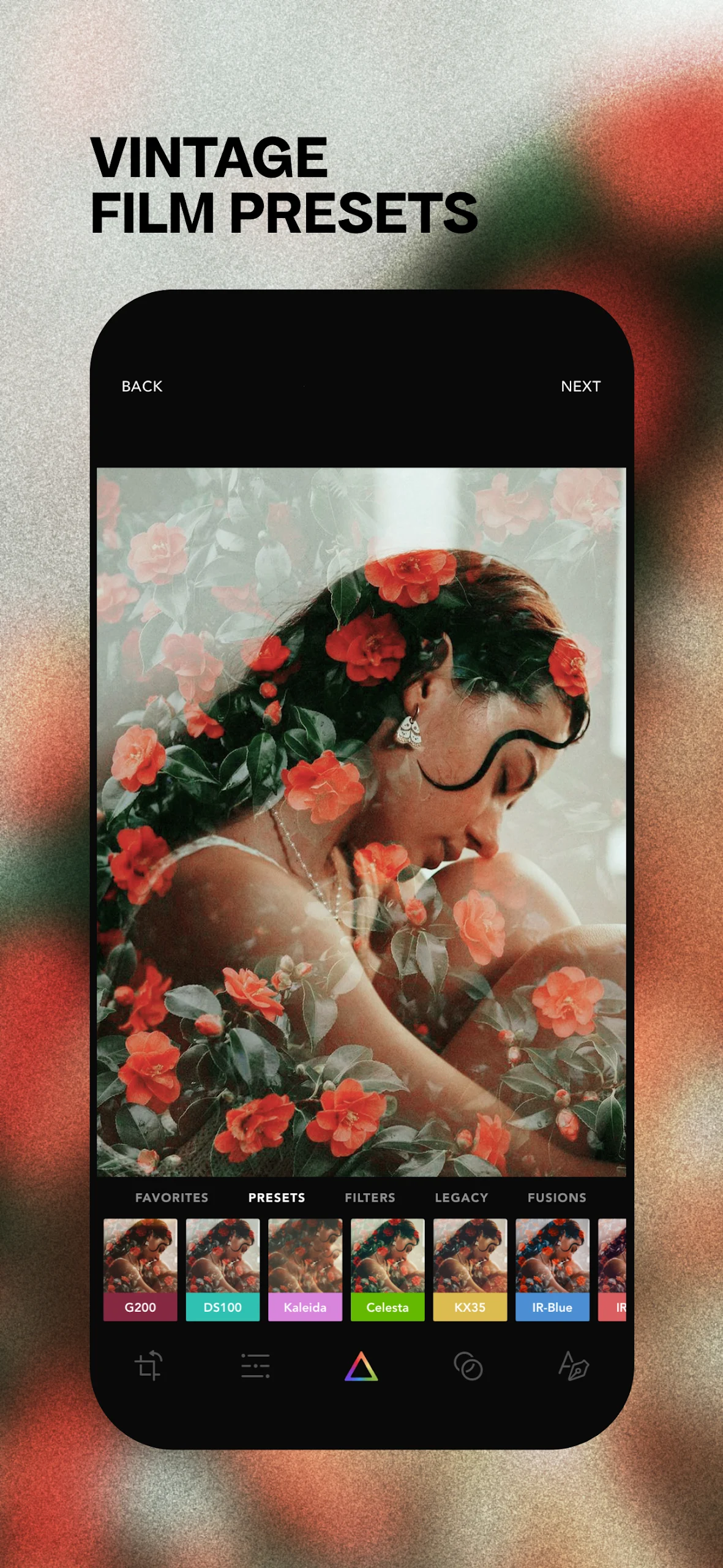 Dive into our collection of Film Presets with just a simple tap, inspired by authentic film photography. Just one tap allows for a complete Preset edit, with an additional tap generating randomized effects such as real Light Leaks, Dust textures, and more.