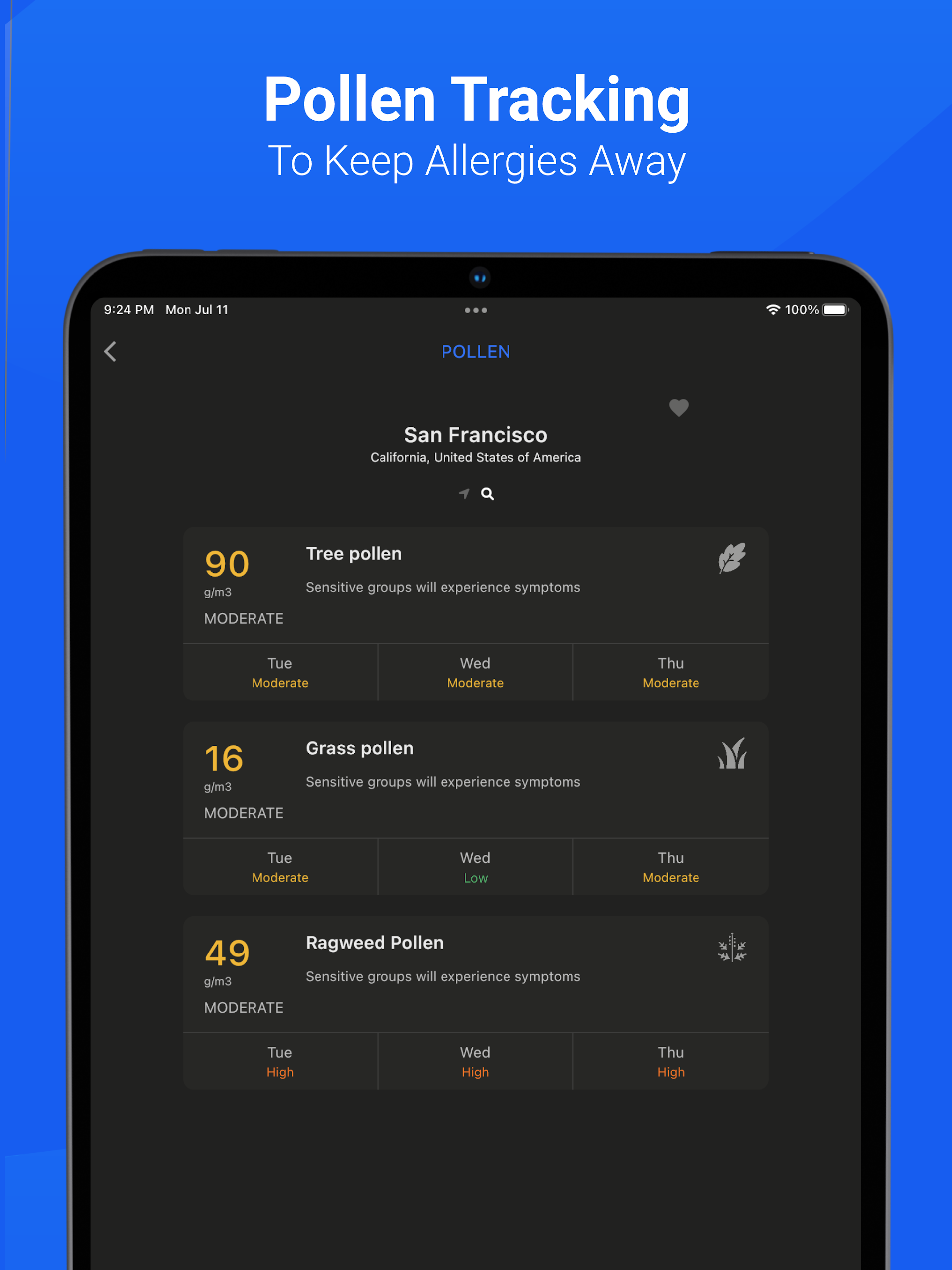 - Pollen Monitoring and Forecasts: Minimize allergic reactions by tracking three forms of pollen in the US and Europe (Tree, Grass, and Weed Pollen).