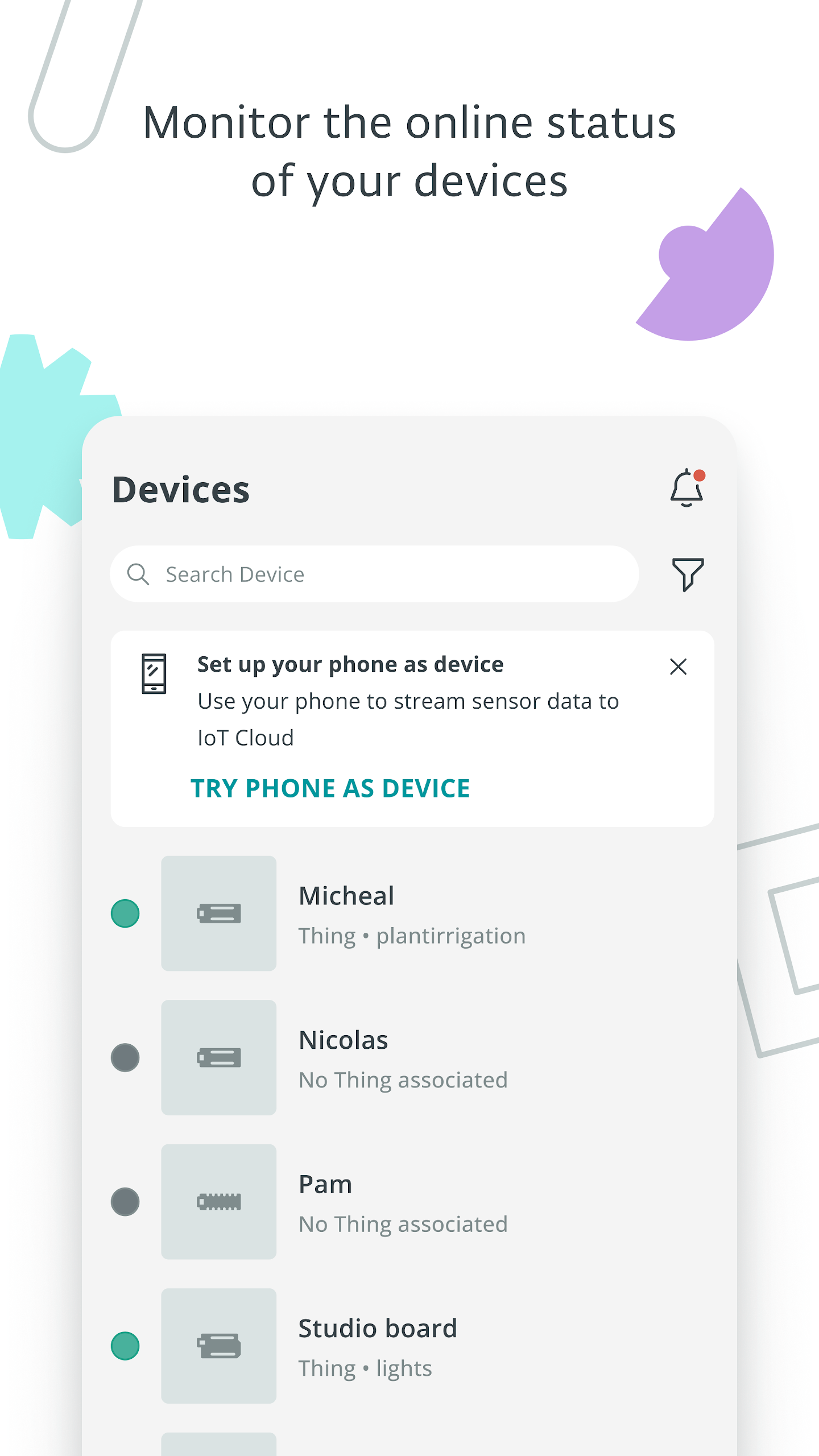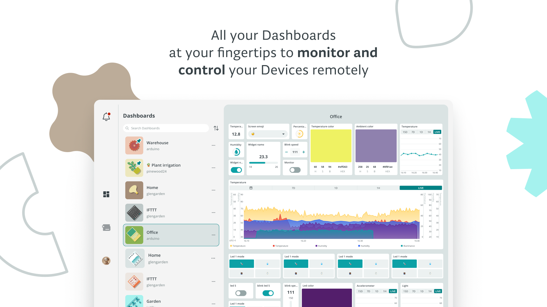 Design your dashboards using your computer or tablet, and manage them via IoT Cloud Remote on your smartphone. By developing your dashboards on the Arduino IoT Cloud, you can associate your widgets with various IoT projects for enhanced adaptability.