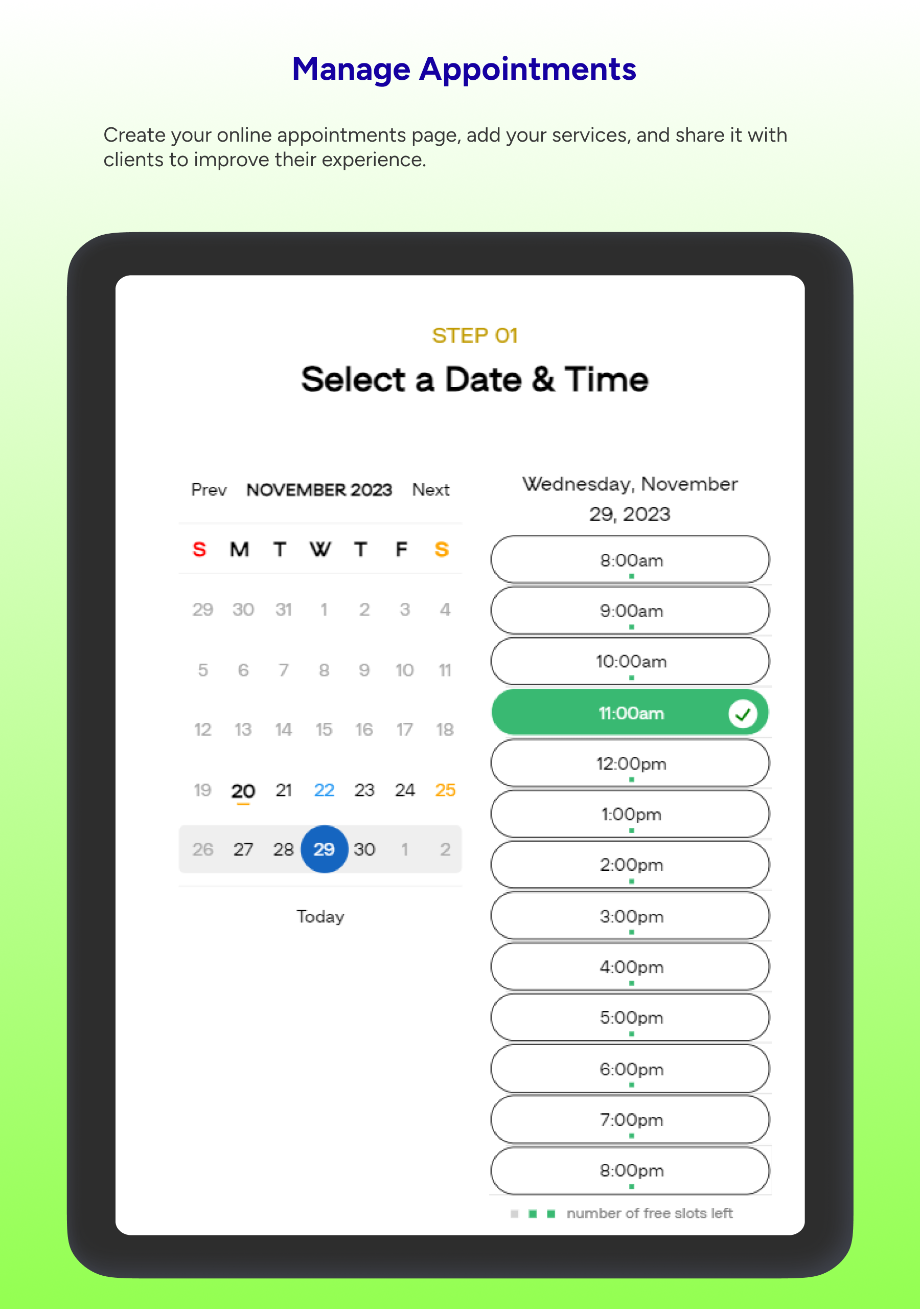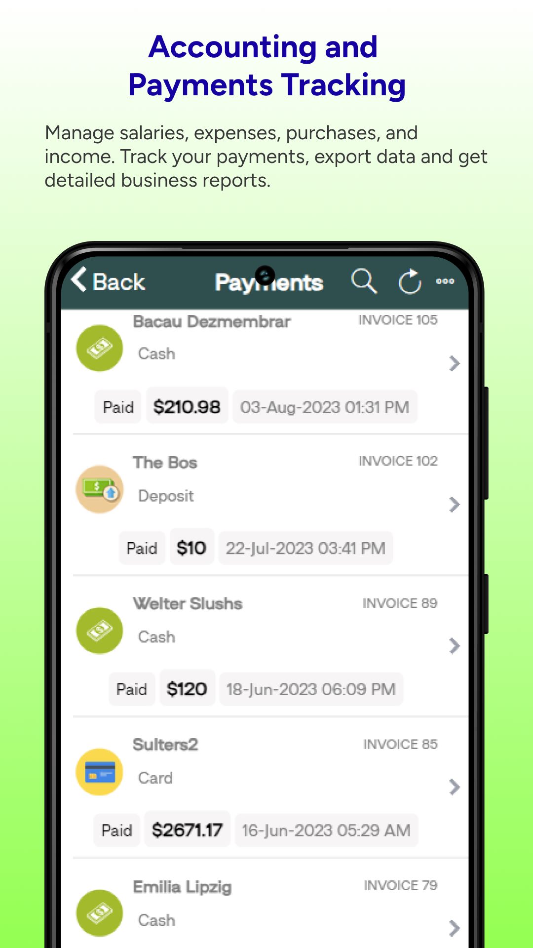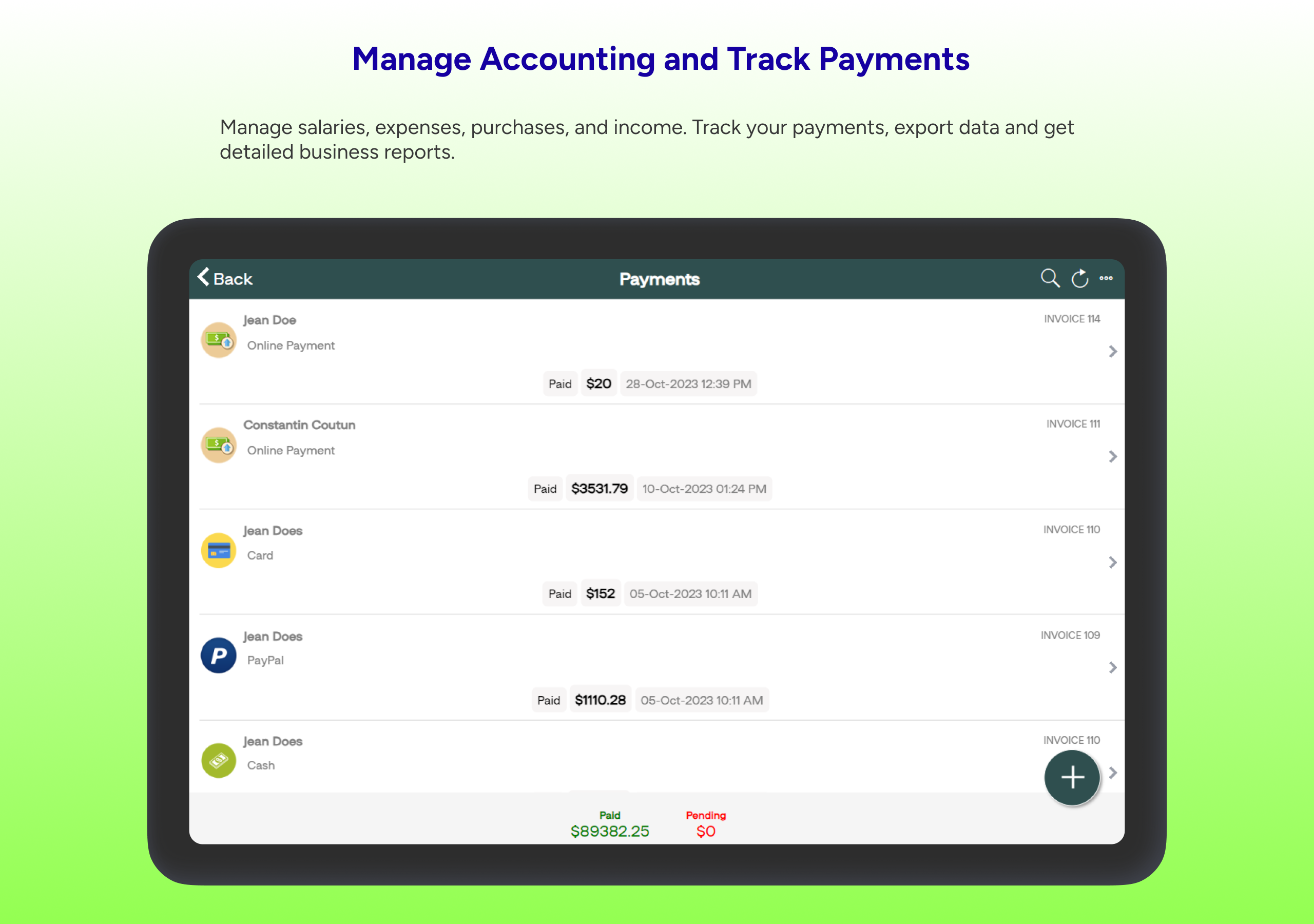 The application accommodates various payment options such as cash, check, credit card, and digital payments. You can accept payments from clients right away.