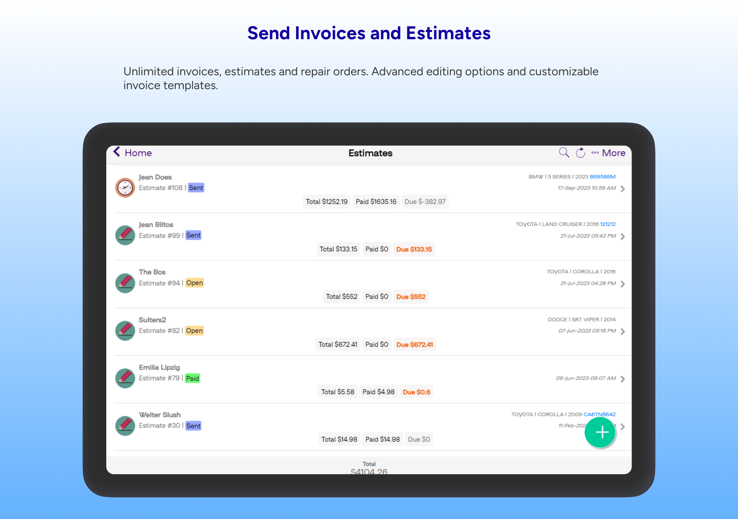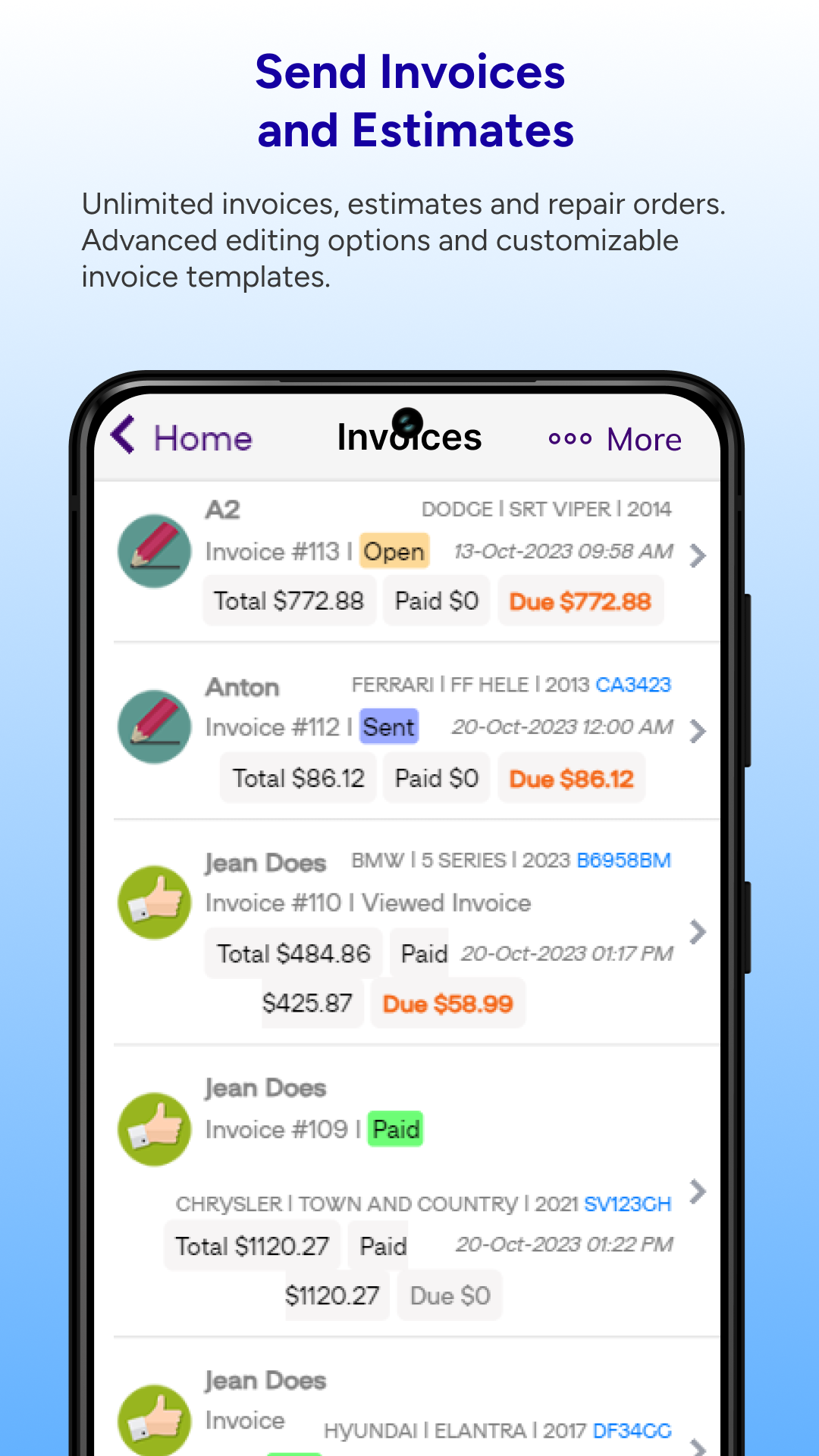 Effortlessly keep a record of all vehicle owners who visit your shop. Instantly create billing statements, assign vehicles, and generate invoices and estimates for your customers.