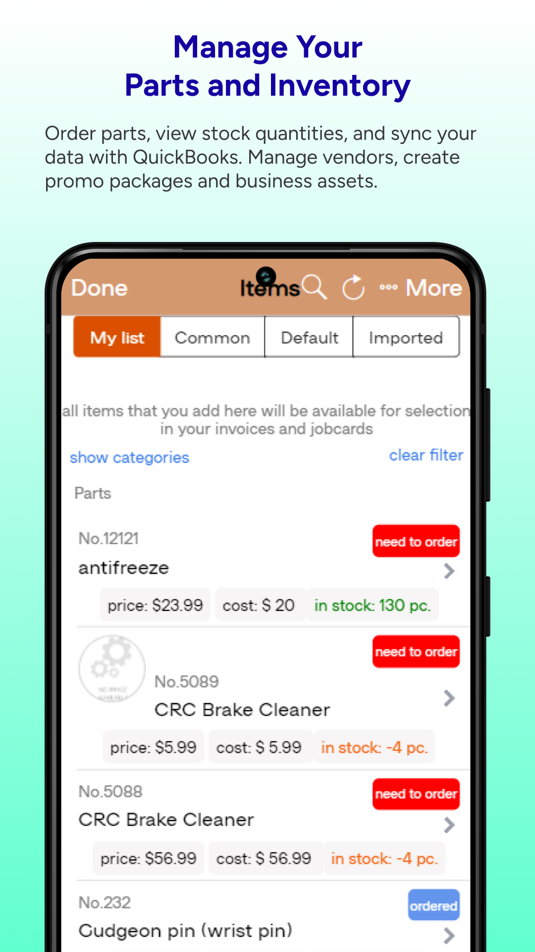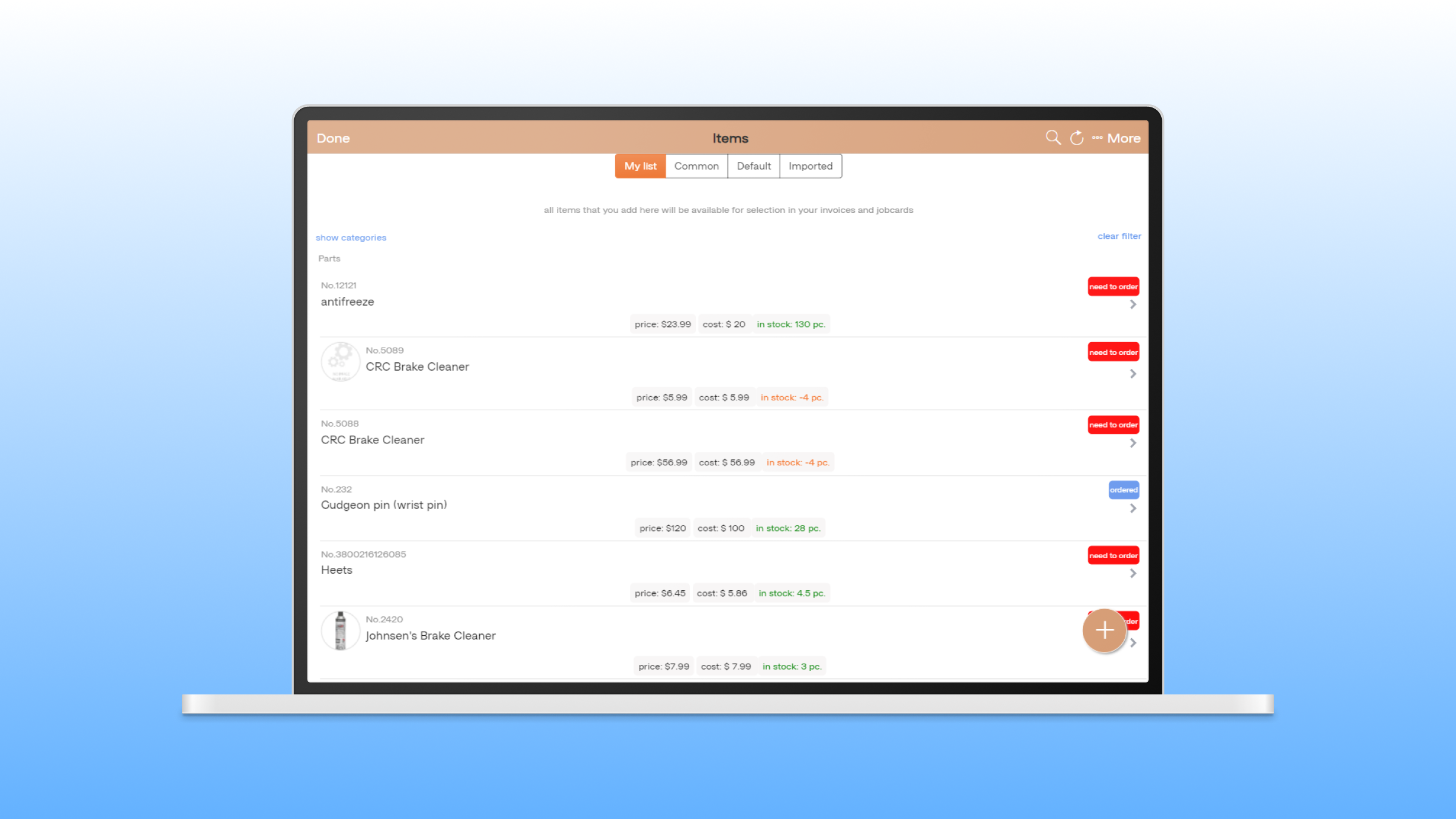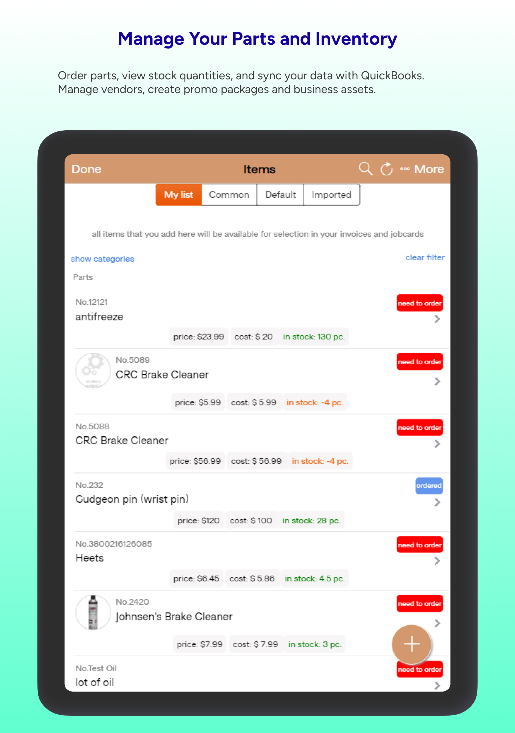 - Parts: monitor part numbers and stock levels. Employ a barcode scanner for adding, modifying, or removing items from your inventory;