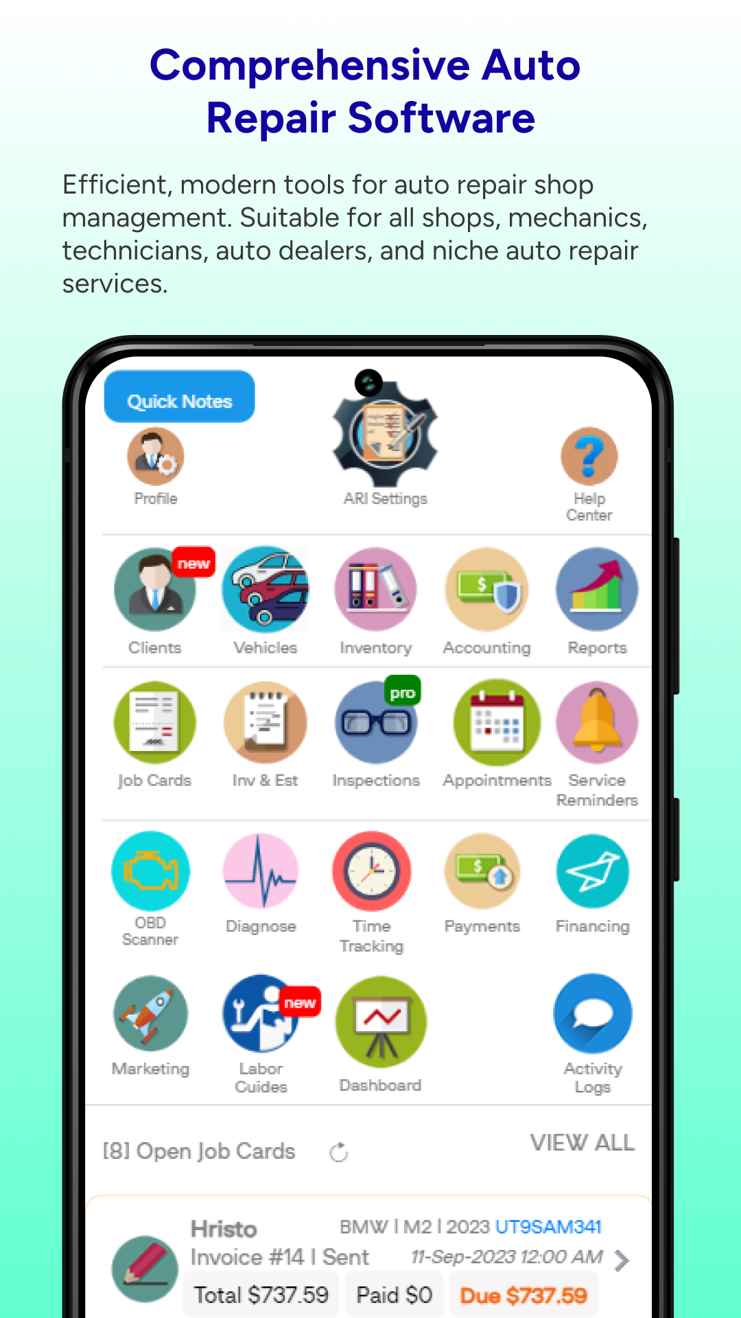 ARI is regarded as one of the top auto repair software solutions available in the automotive industry. A multitude of mechanics and shop owners rely on ARI for their everyday operations and repair tasks. This application encompasses a wide array of functionalities, from managing clients and tracking inventory to diagnosing vehicles, invoicing, and processing payments, providing all the necessary tools to operate your shop efficiently and confidently.