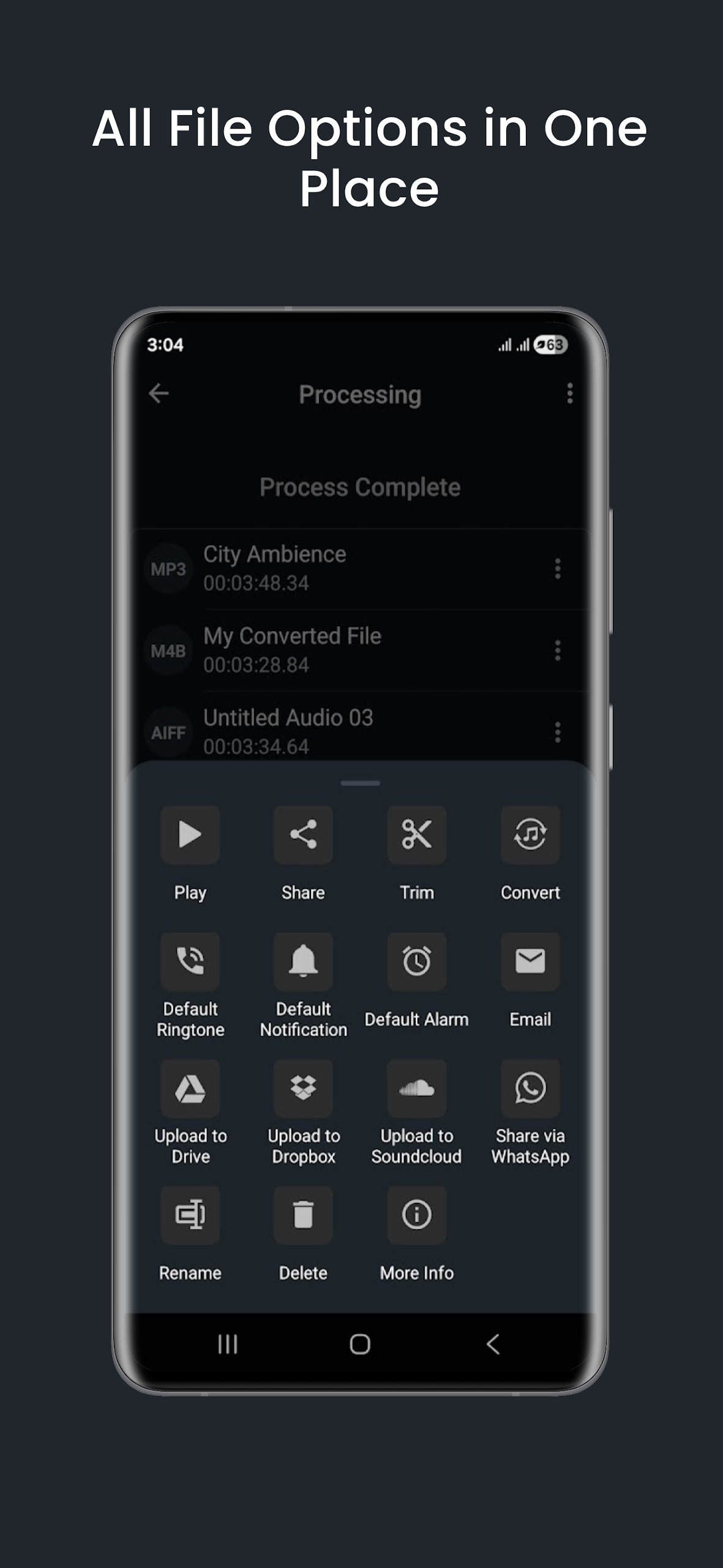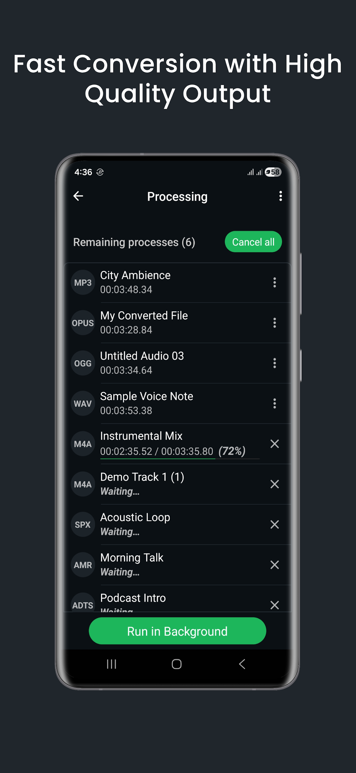 - Convert unsupported audio formats like OPUS, WMA to Android-supported formats like MP3, M4A, while maintaining original quality.