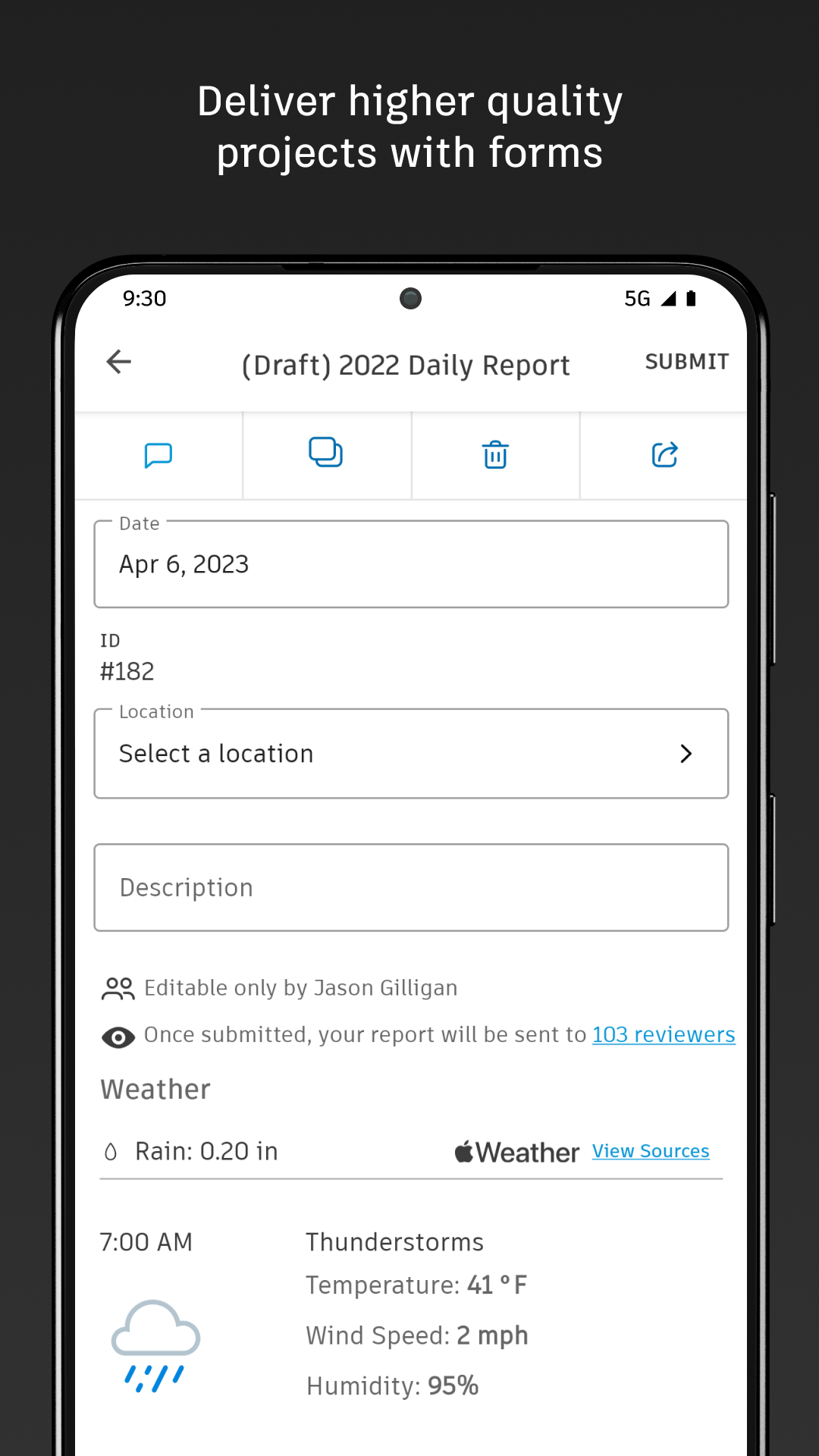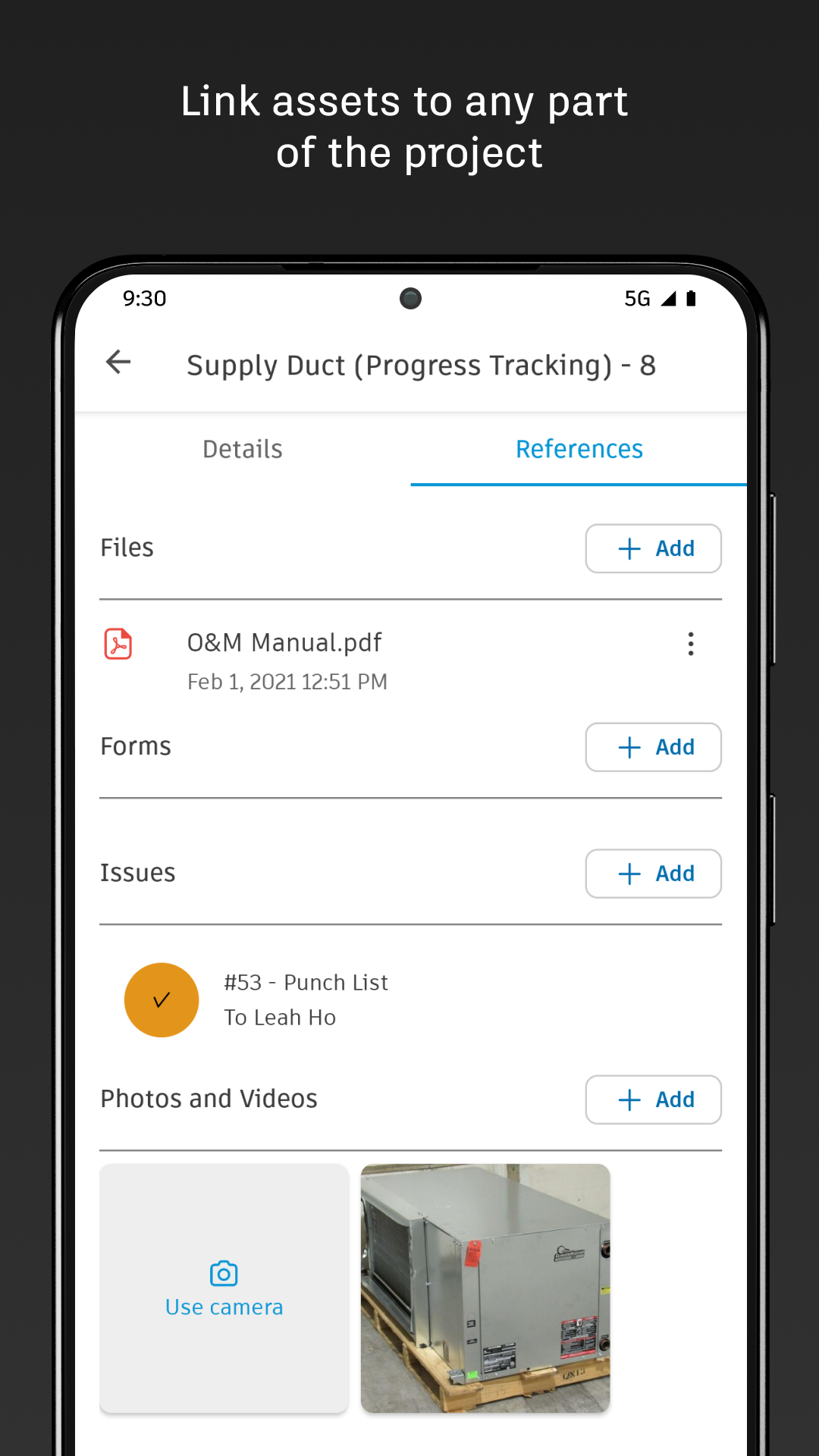 Efficiently track issues from design until handover all in one centralized system. Expedite resolutions by assigning due dates, responsible individuals, and easily referencing photos, related documents, and RFIs.