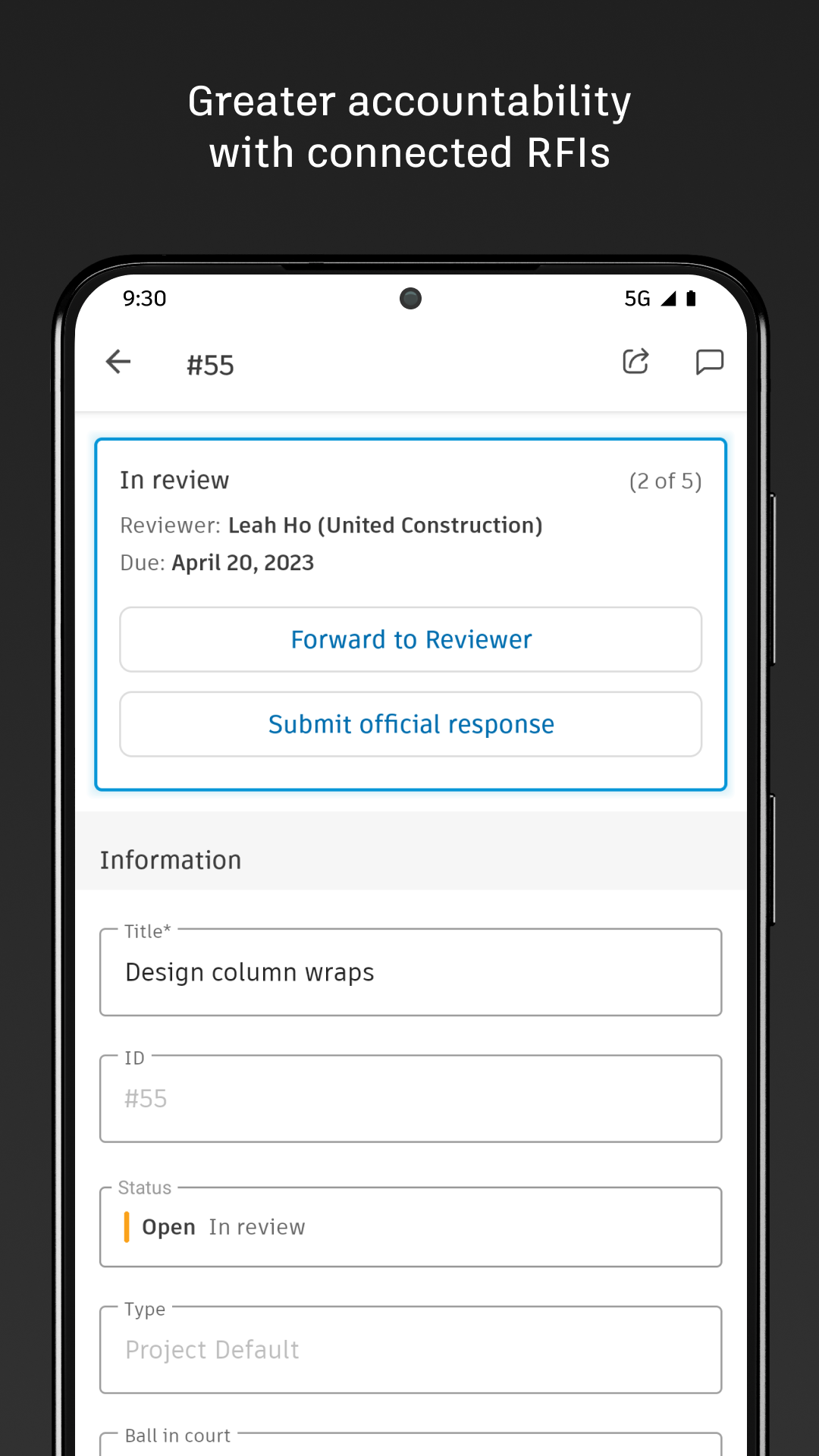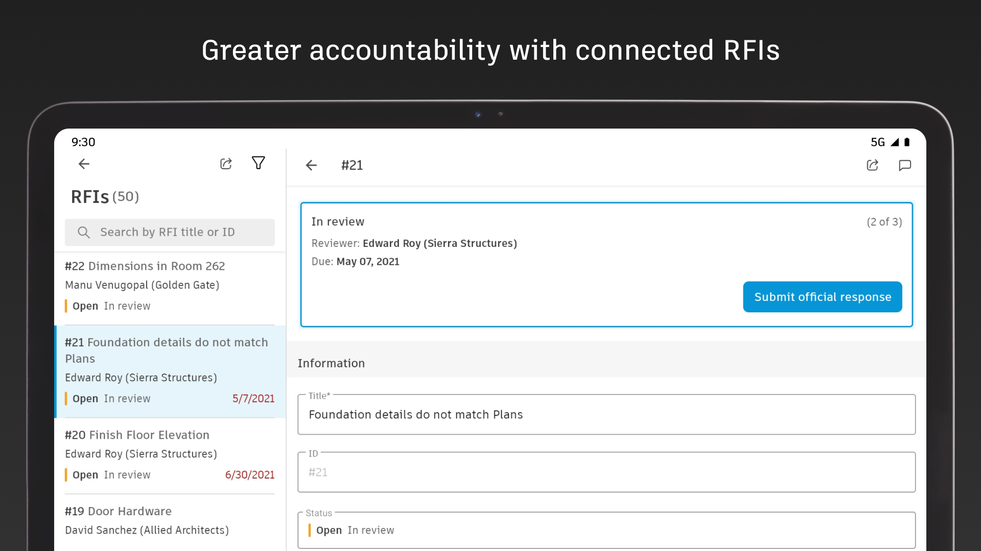 “I’m enthusiastic about the ability to seamlessly tag a drawing snippet onto an RFI and immediately assign responsibilities to track how the project team addresses specific issues or RFIs. Real-time issue tracking helps us deal with roadblocks right away.”
