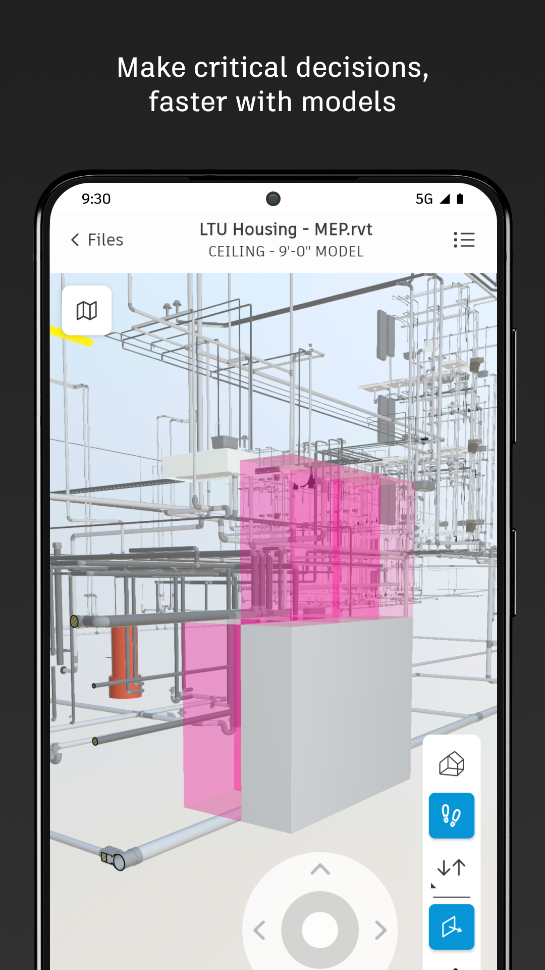 Make informed decisions swiftly with access to 3D models in the field. Inspect installation specifics and navigate both single and multi-trade models confidently. Supports multiple file formats such as Revit and AutoCAD, alongside others like RVT, DWG, NWC, IFC, NWD.