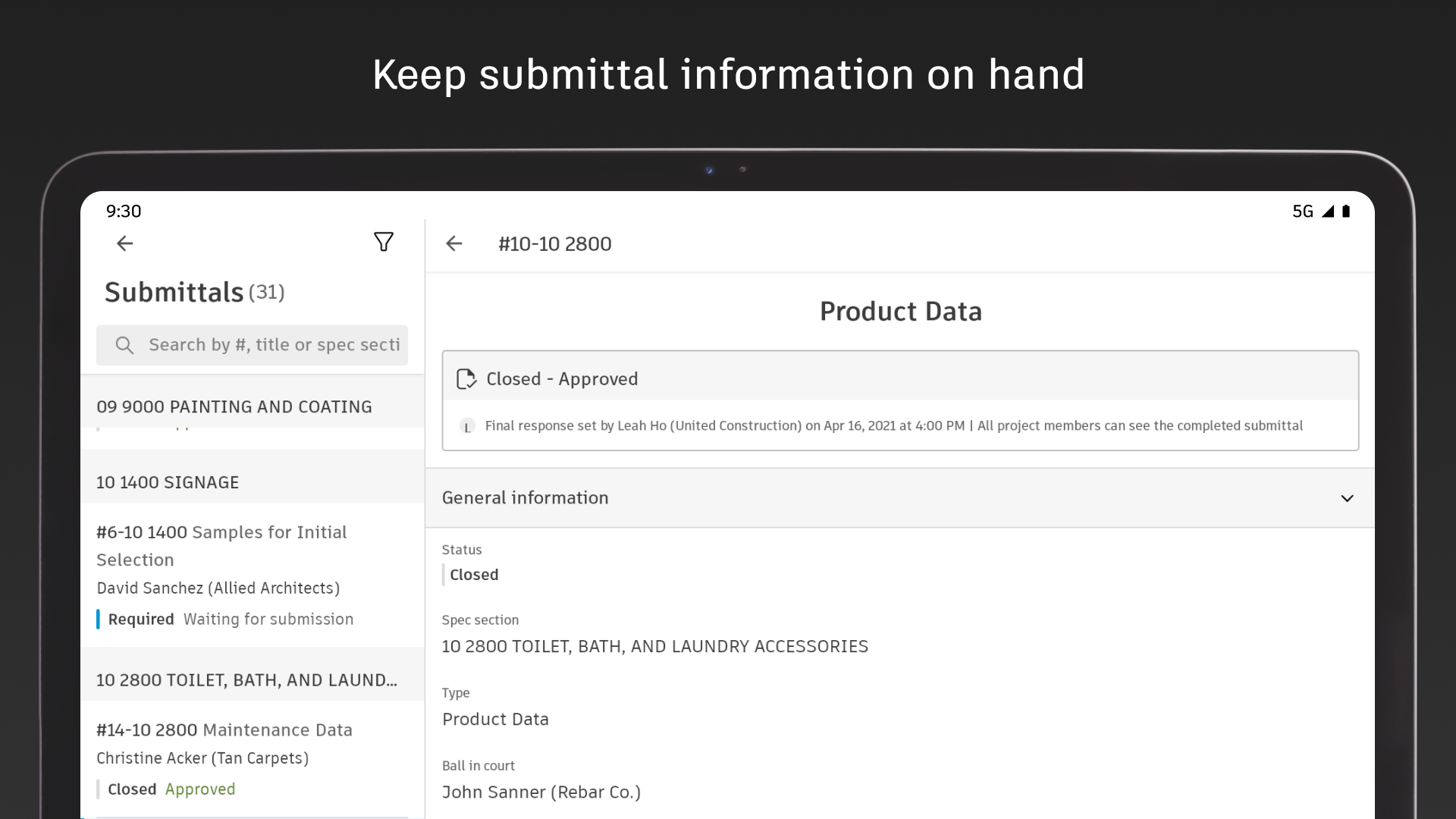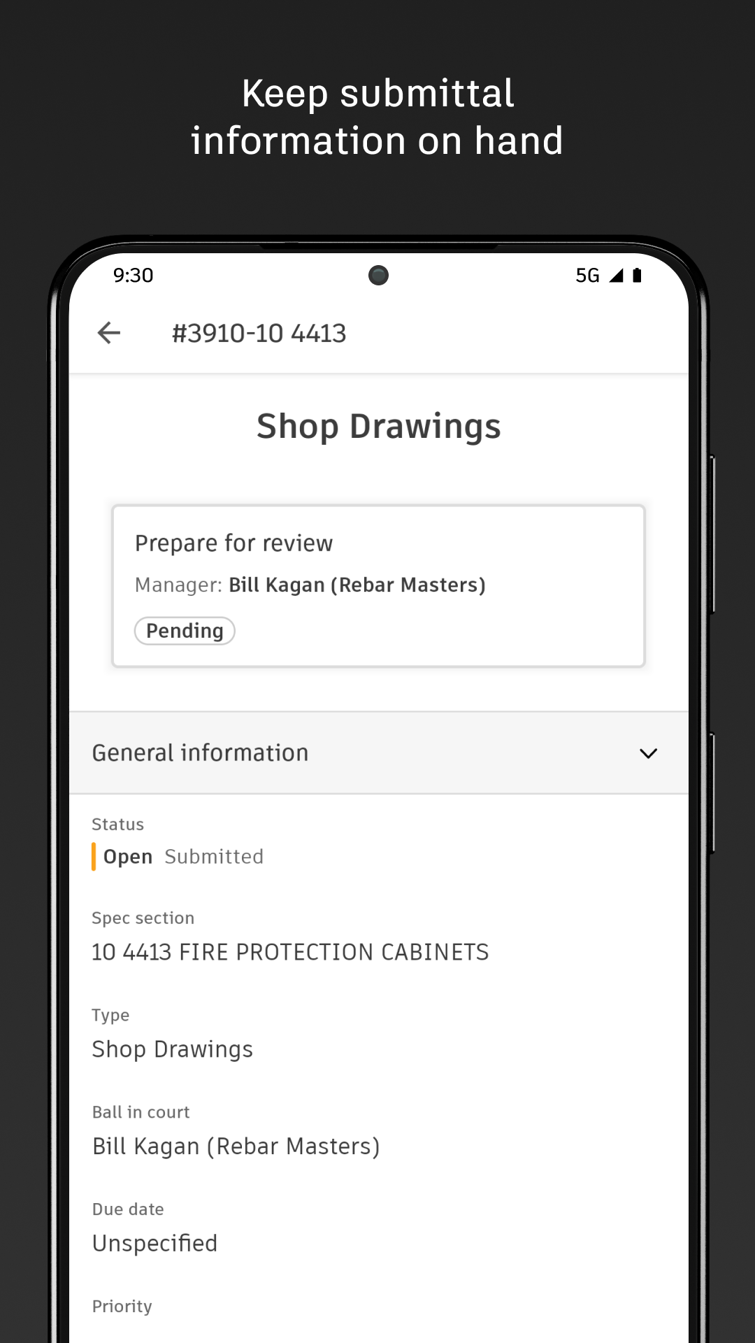 Ensure access to all pertinent submittal information. Quickly locate required submittals with search functions to monitor progress and outline next steps.