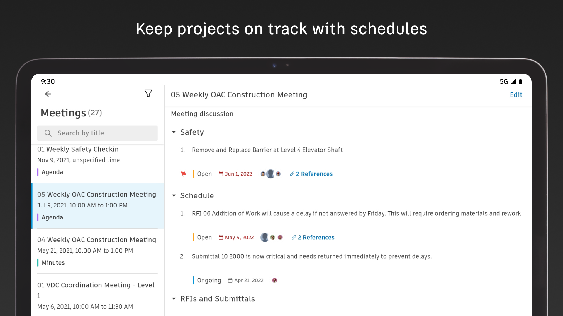 Prepare for upcoming meetings by setting up agendas and linking references like issues, models, RFIs, or photos. Review outstanding items and follow-up directly from the field.