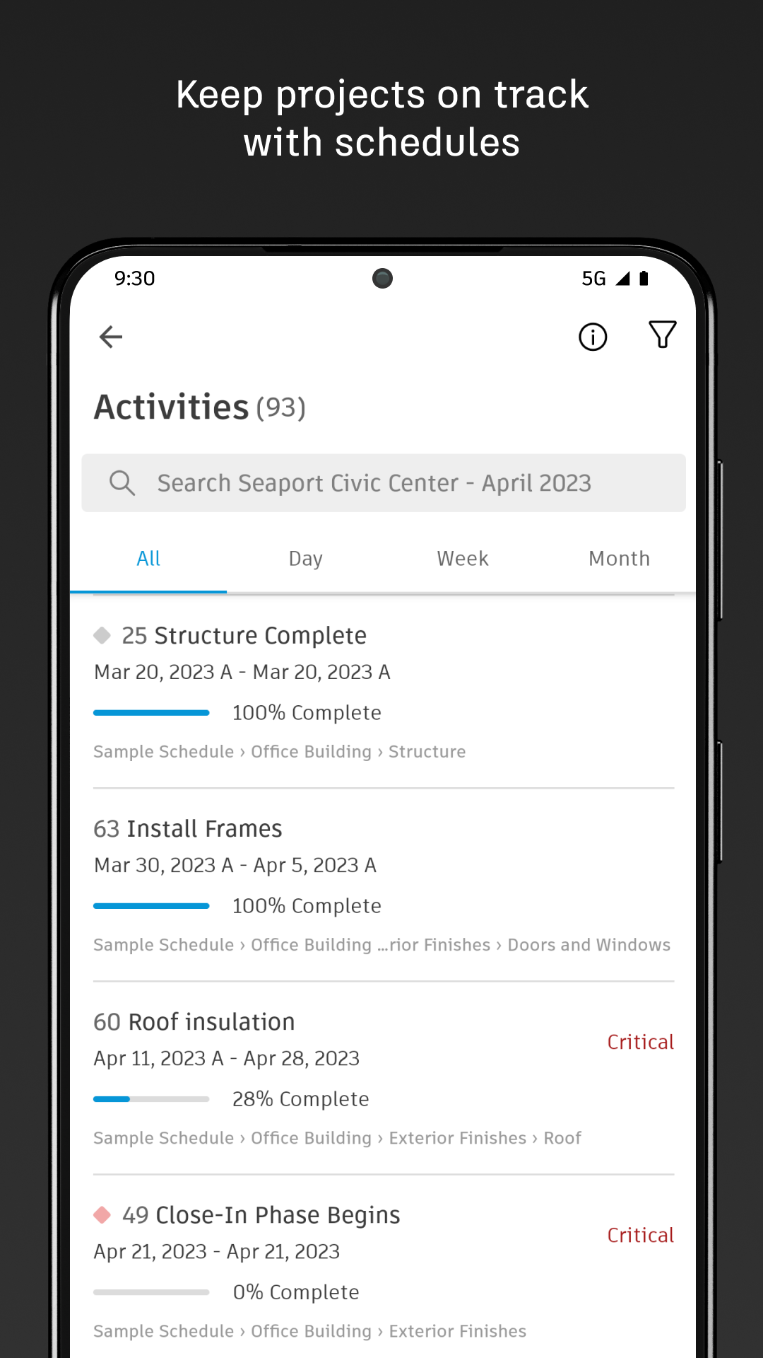 Maintain project timelines with a unified schedule. View schedules across various durations or filter critical items, review dependencies, and evaluate schedule recommendations.