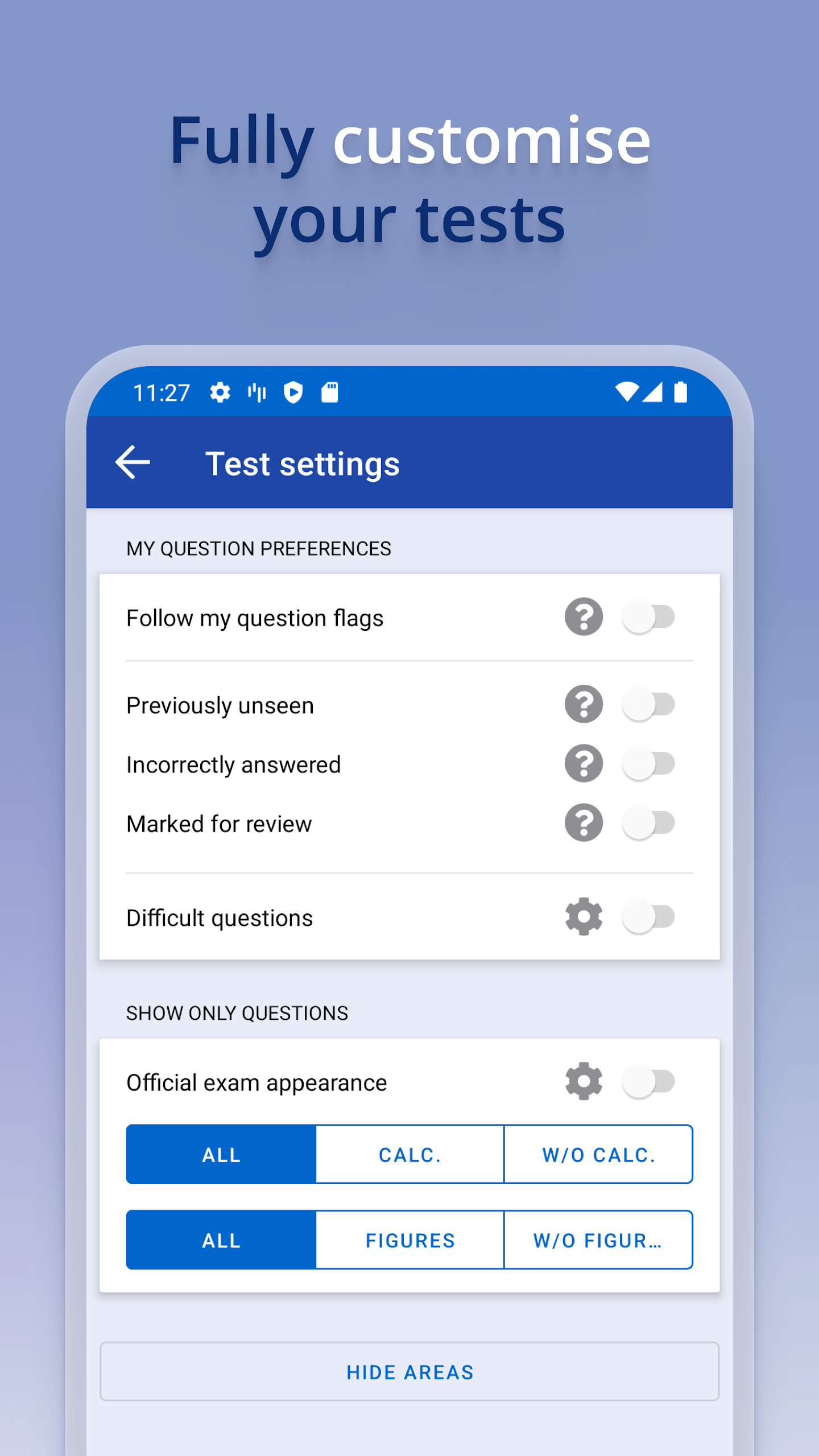 • A variety of filters for customizing your tests, such as Official Exam Appearance, Last Seen, and Challenging Questions, among others