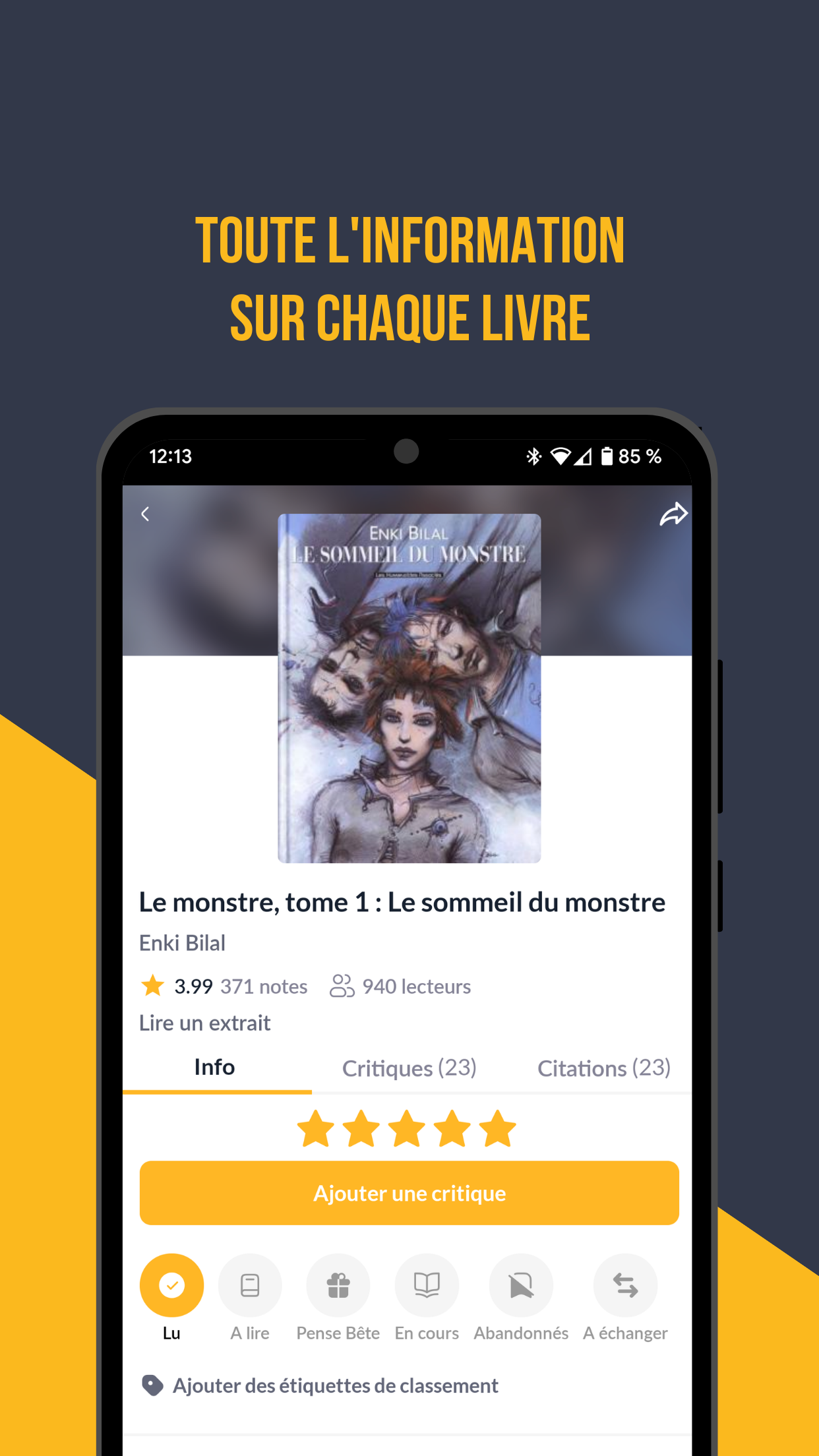 If you're seeking more information about a title seen in bookstores or one you've heard of before, Babelio features millions of referenced books: simply search by title, author, or ISBN to access detailed information on any book, including its various editions and the ratings given by readers. For added convenience, you can scan the barcode located on the back of the book to quickly find it.