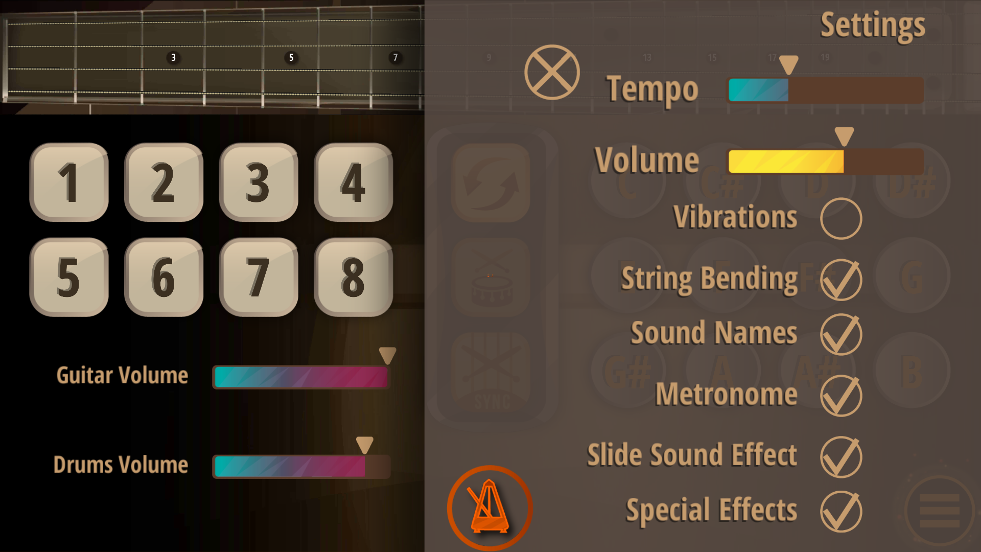 Yes—effects like slide, bending, palm muting, and visual effects; also tempo control via metronome.