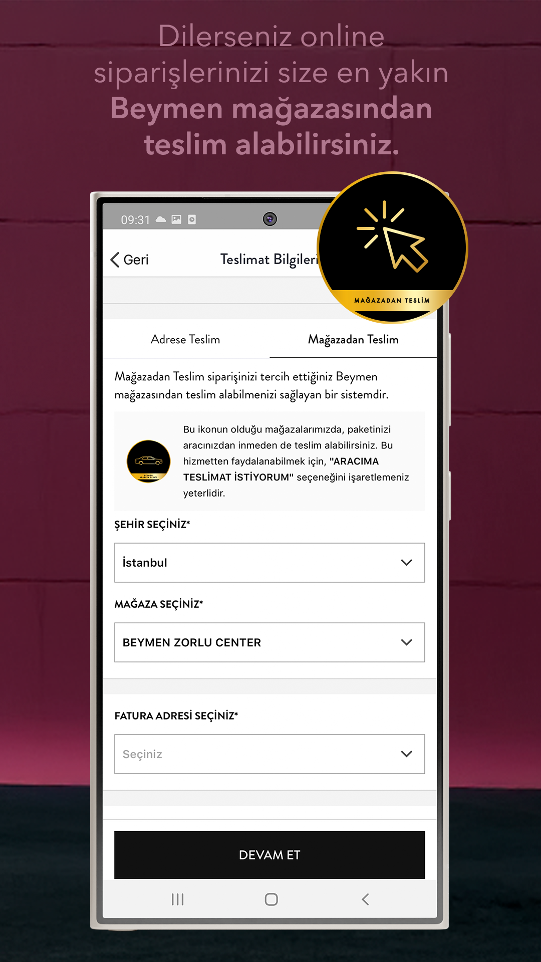 You can pay remotely in the store using the Beymen mobile application or you can safely complete your purchase by paying for your chosen products online from your home or from anywhere you want with a QR code with our sales consultants. You can also make your payment by reading your card from our contactless POS devices in our safes.