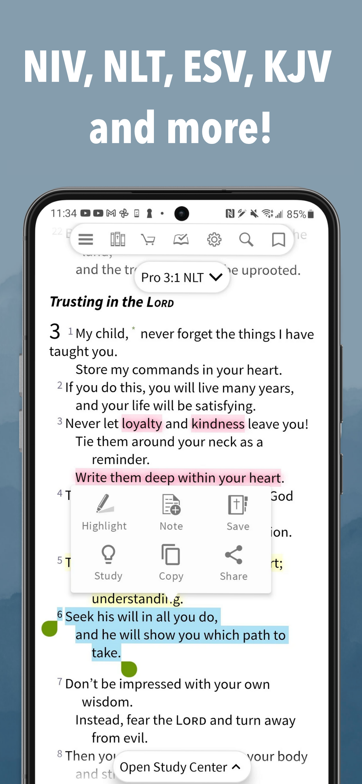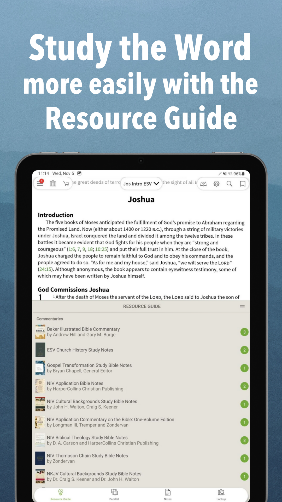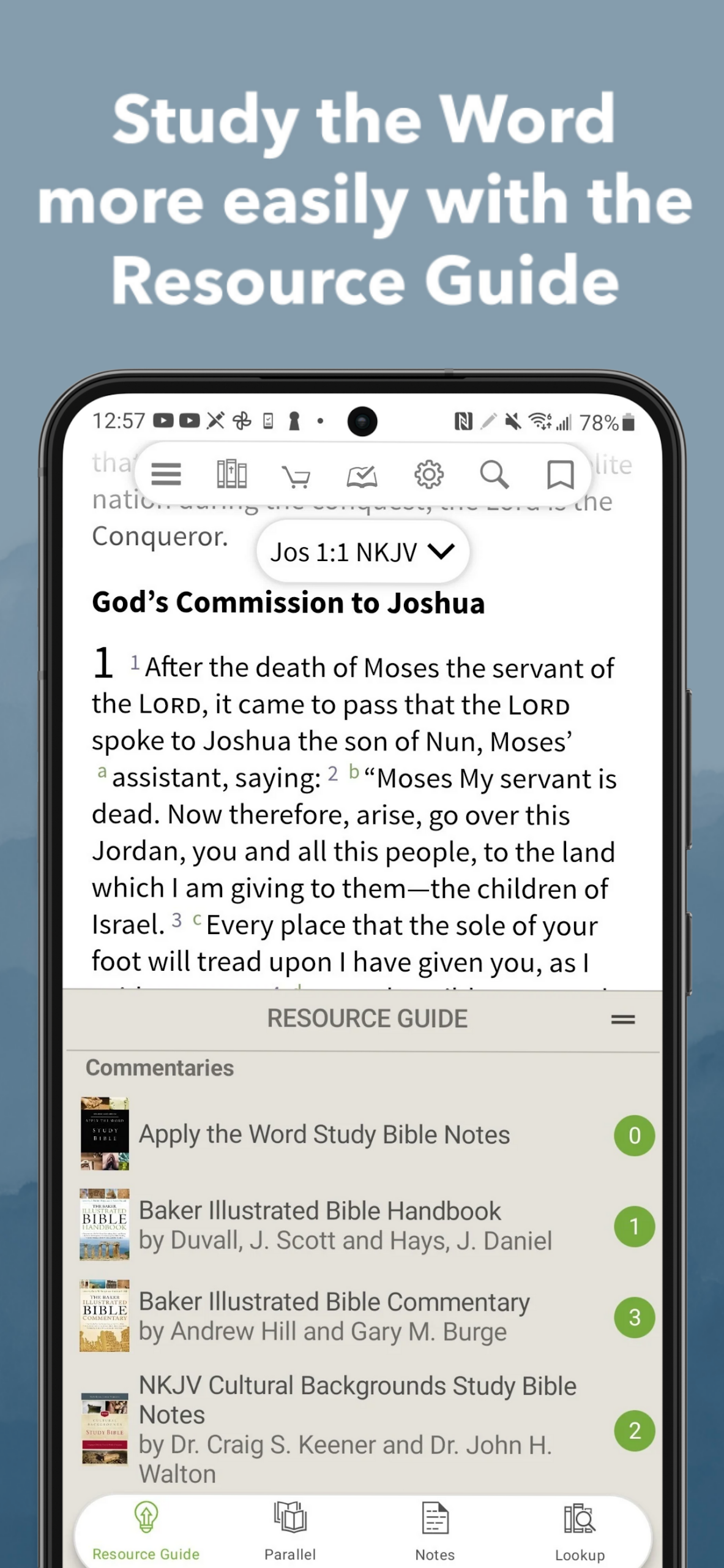 Access resources seamlessly with the Study Center and Resource Guide tab. The app facilitates tracking verse by verse alongside reading and studying from your preferred Bible choice.