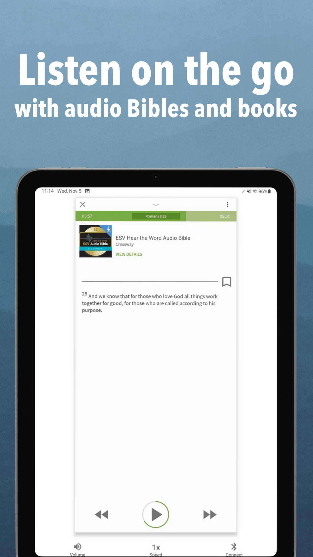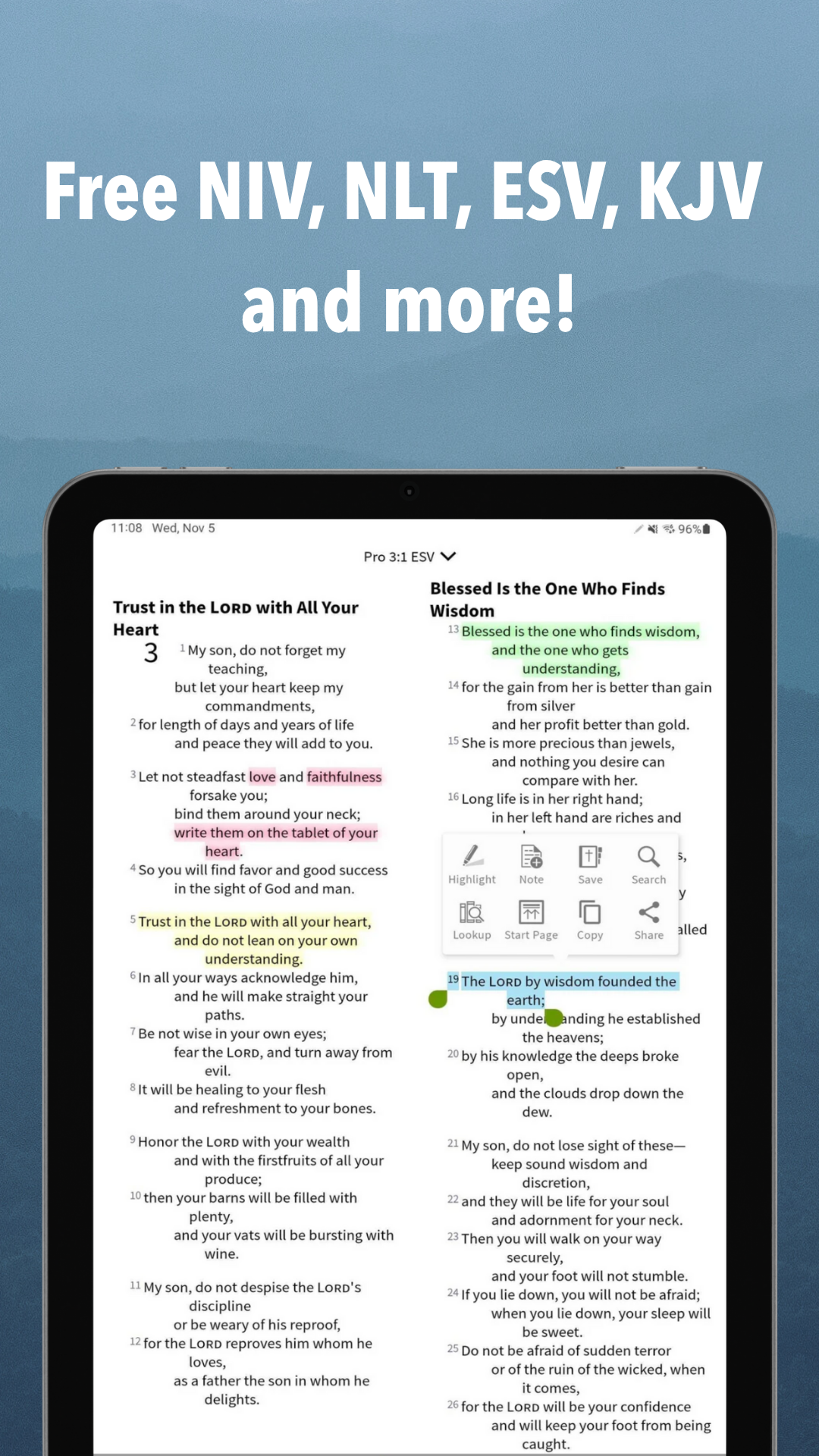 Customize your Bible experience by highlighting and saving favored passages, setting bookmarks, jotting down notes, adding tags, and receiving daily Bible verses. Your customized elements sync across devices.