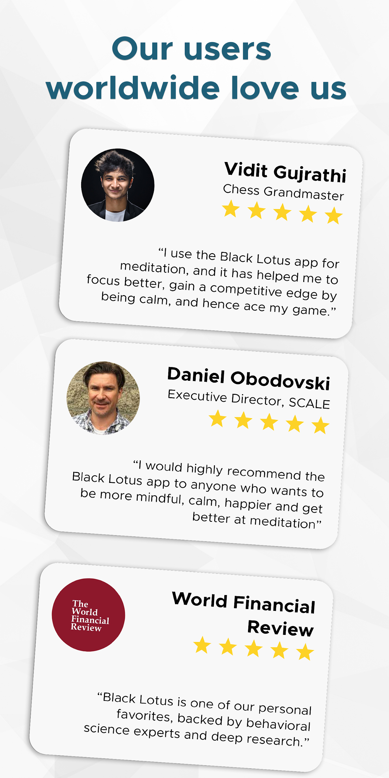 As the leading meditation app globally, Black Lotus is packed with high-quality meditation sessions, breathing exercises, meditation music, and a system designed to help you tap into your potential.