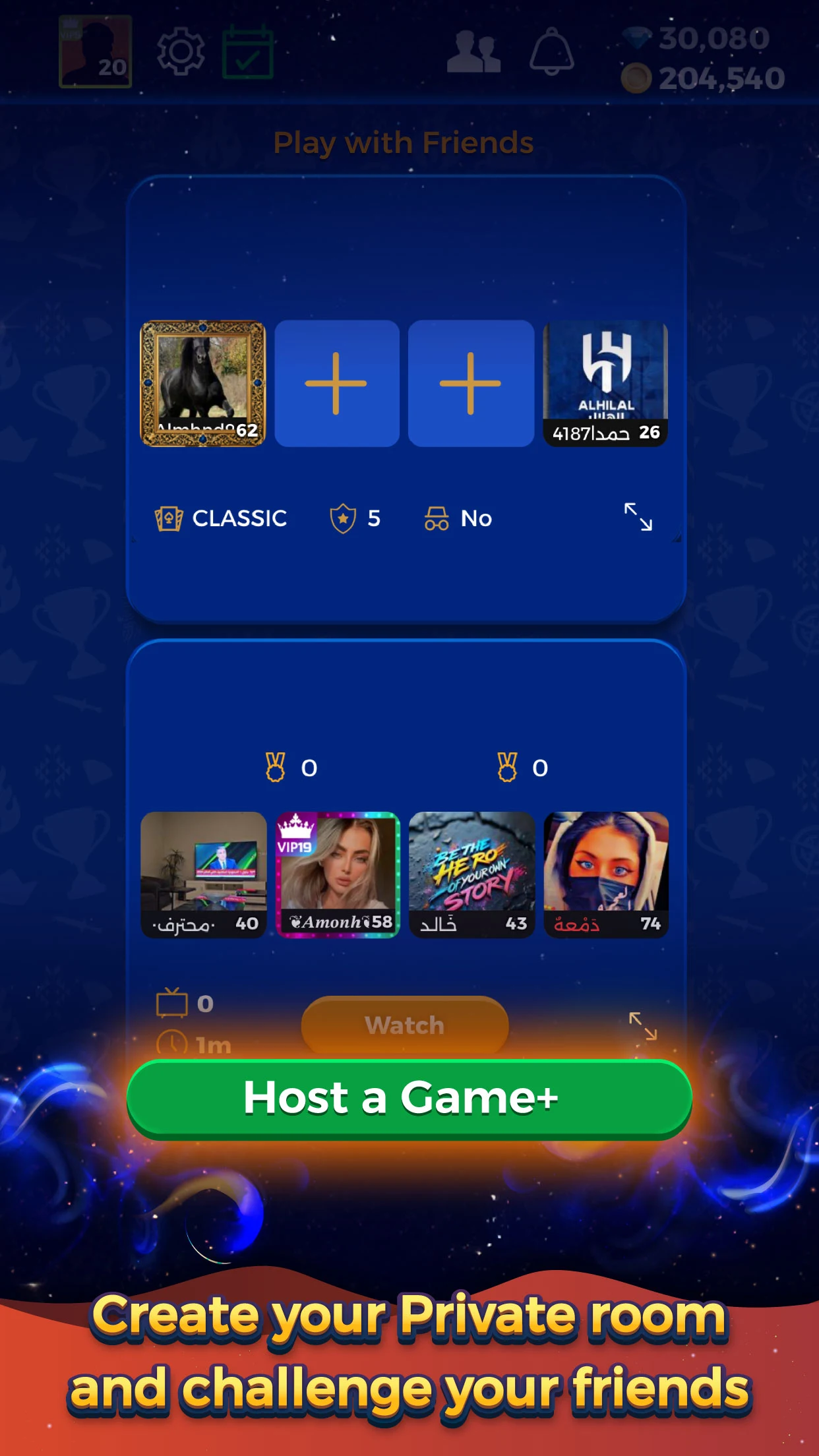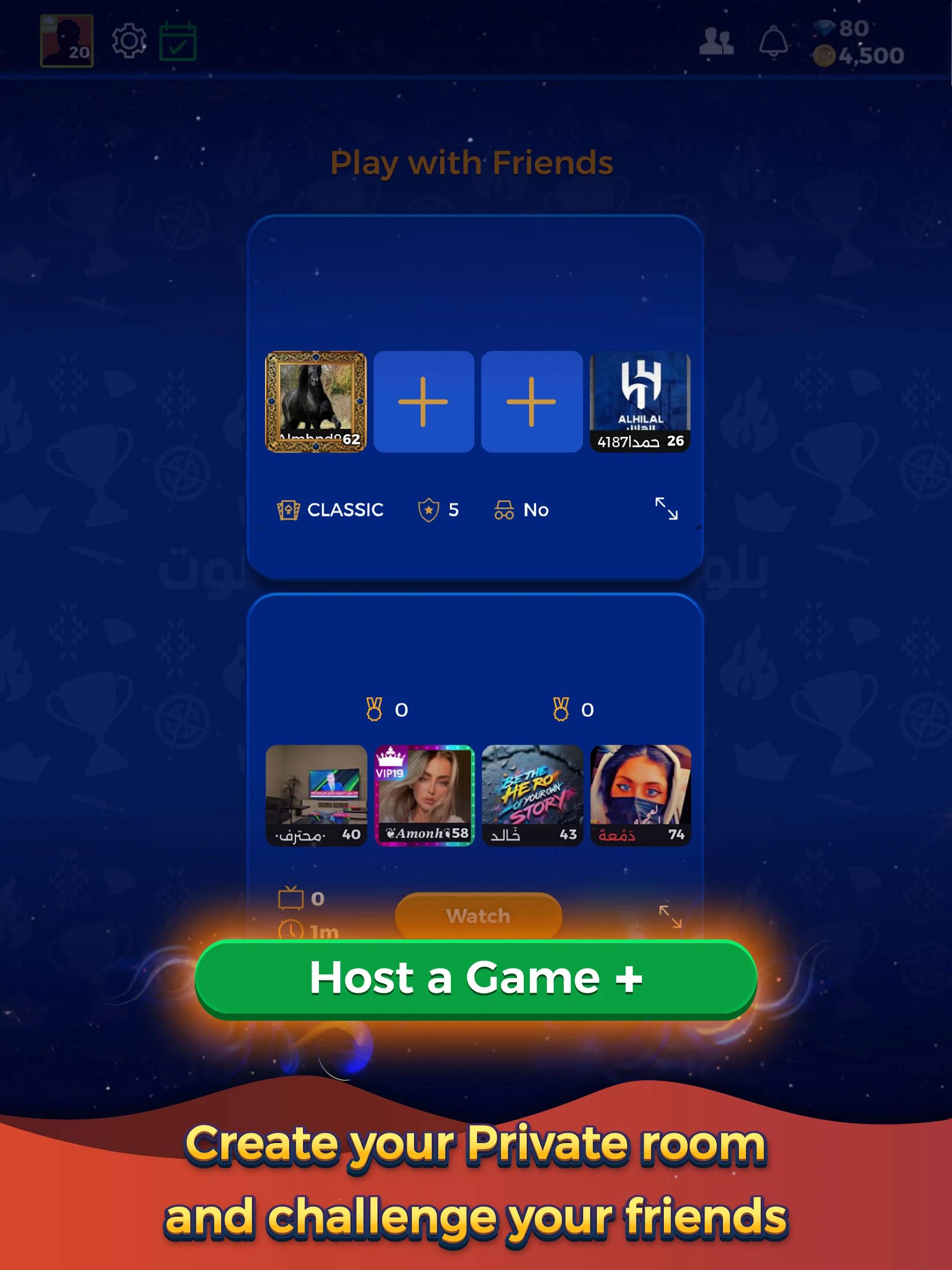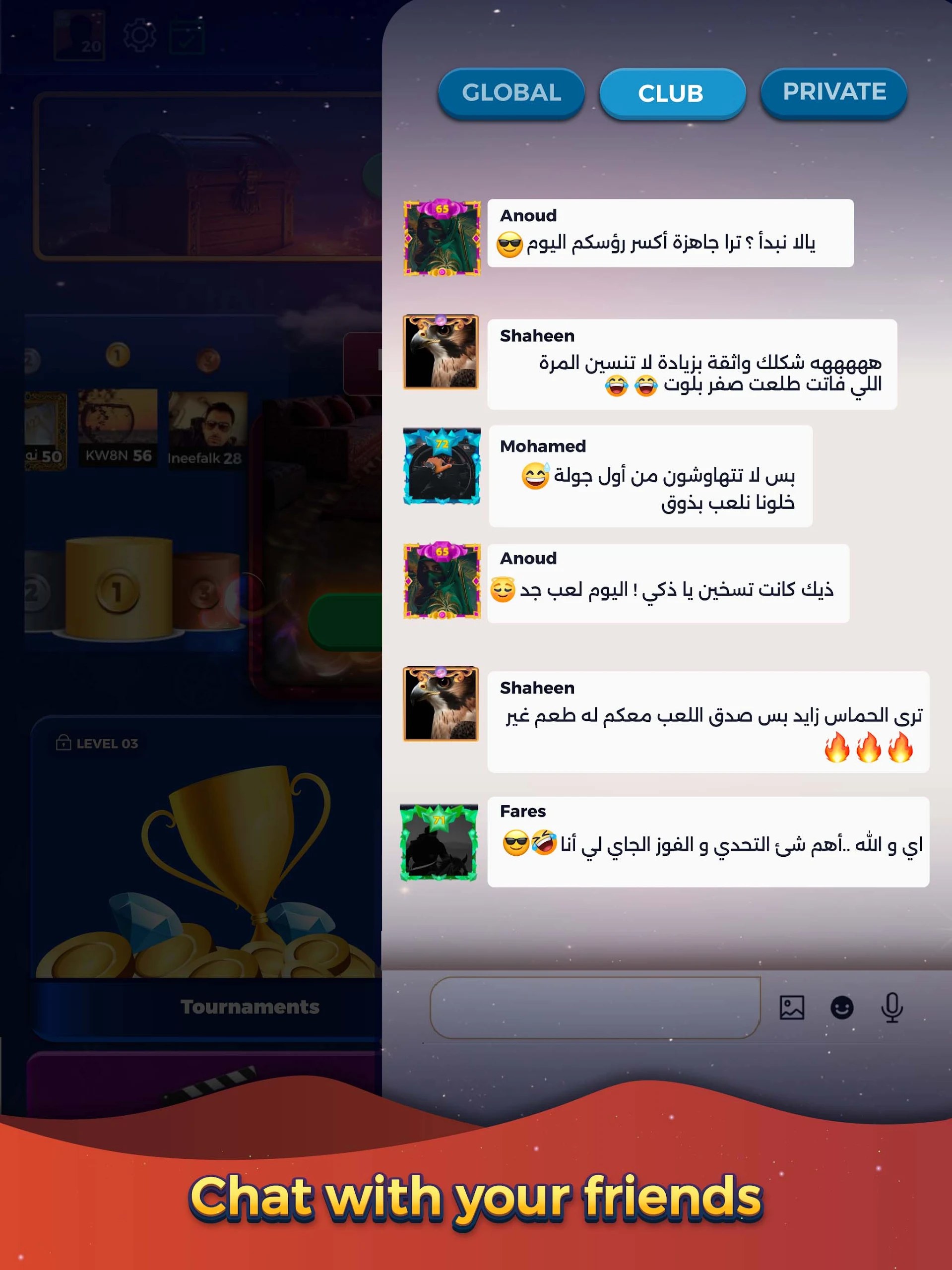 Baloot is not just a game; it's a lively, strategic, and inclusive community where top Baloot players gather, and it's further enhanced on VIP Baloot with its exclusive social features! Connect with individuals from all over the world while engaging in the most favored online multiplayer game in the Arab region.