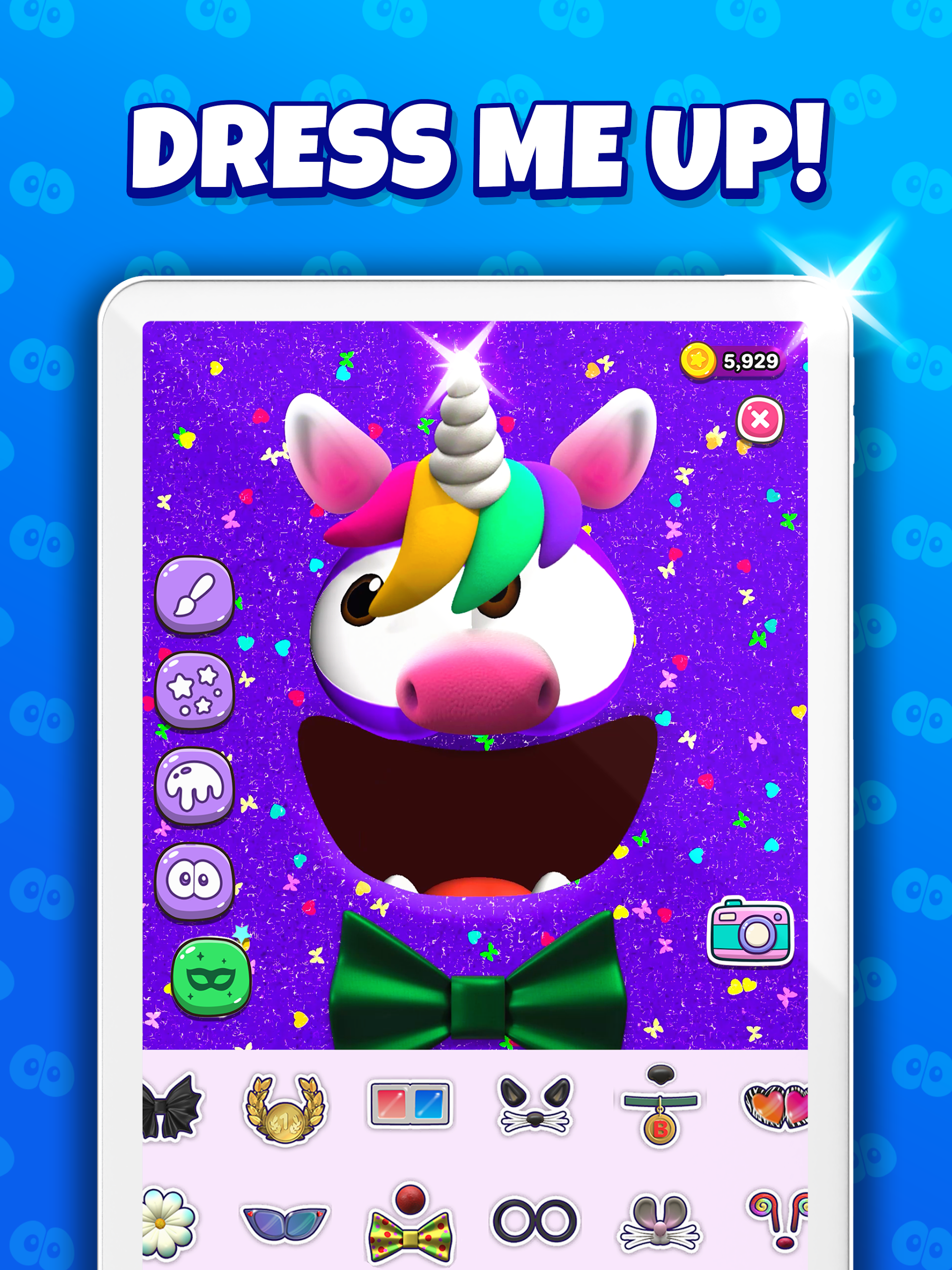 Bruno loves to eat! Spoil your slime buddy with delicious snacks from the in-app food store - cakes, candy, fruits, pizza, burgers, ice cream, and more, each triggering humorous responses.