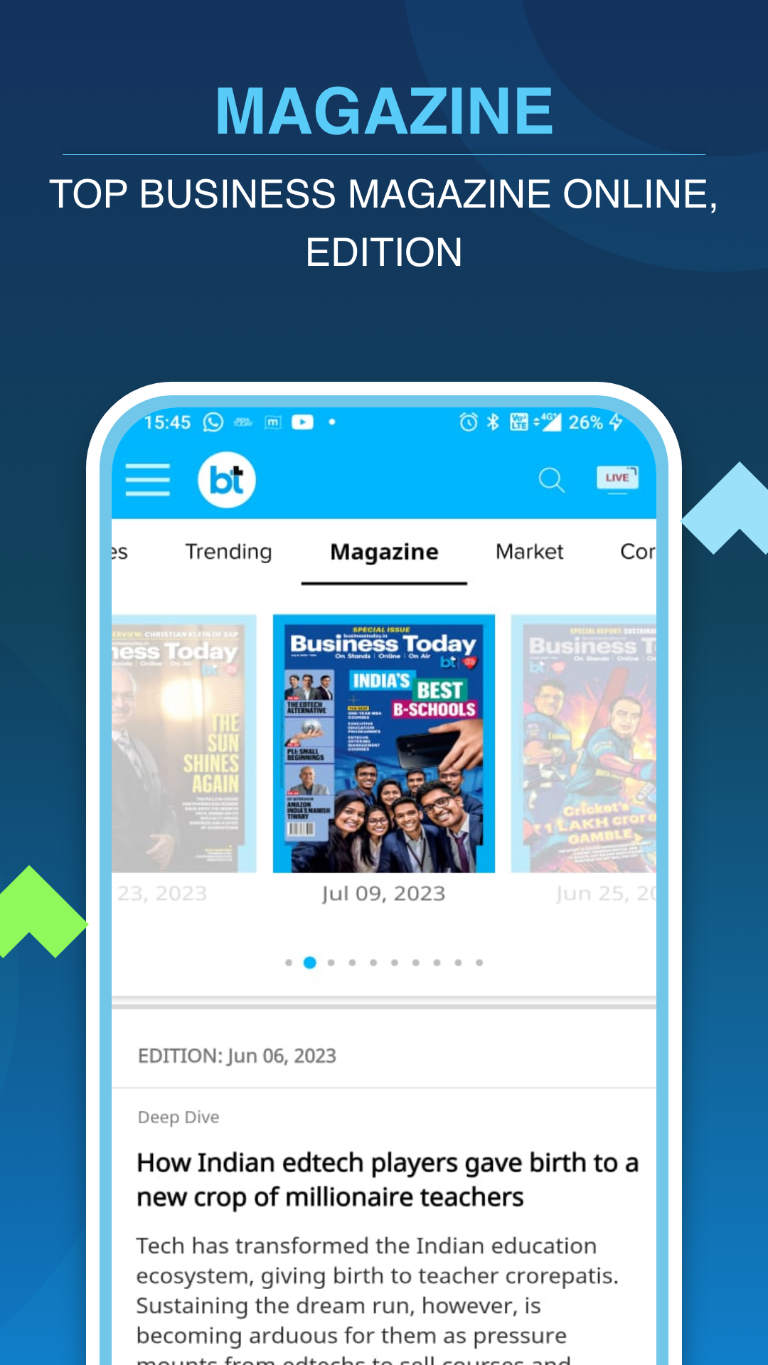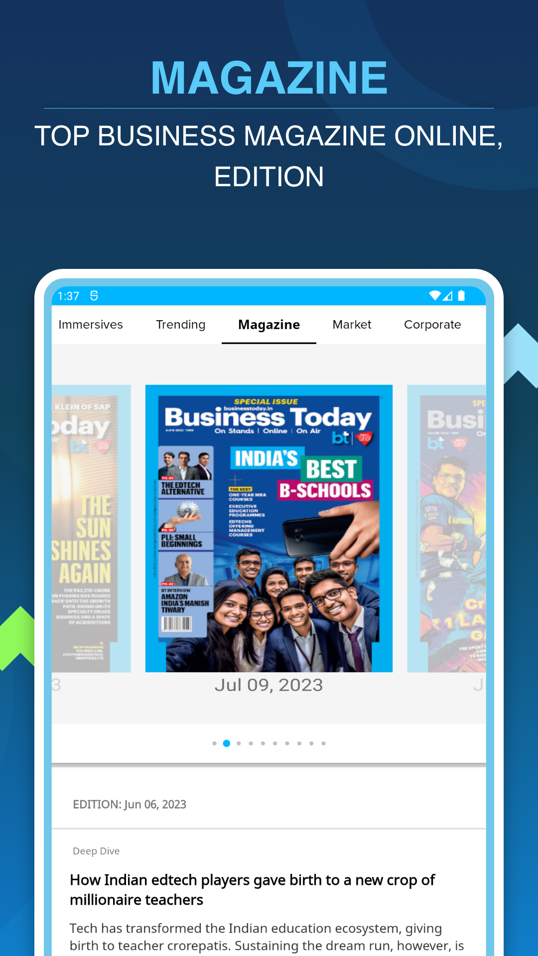 Corporate: Access exclusive features that delve into top corporations like Infosys, Wipro, TCS, Tata Group, and Reliance Industries, crafted by the award-winning journalists from Business Today magazine.