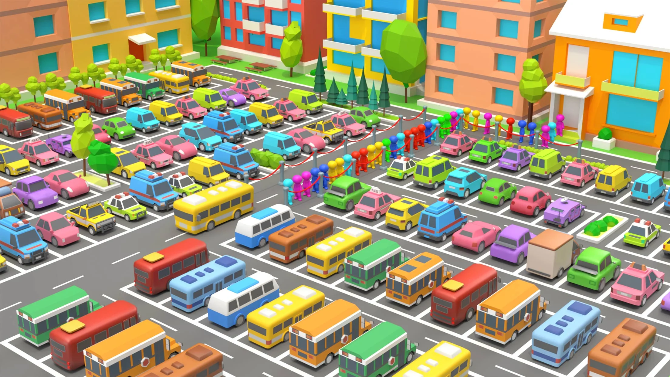 In this parking mode, there are too many cars in the parking spot during peak hours. Your task is to collect three cars of the same color to remove them from the parking lot. When all the cars are removed from the parking lot, you win!