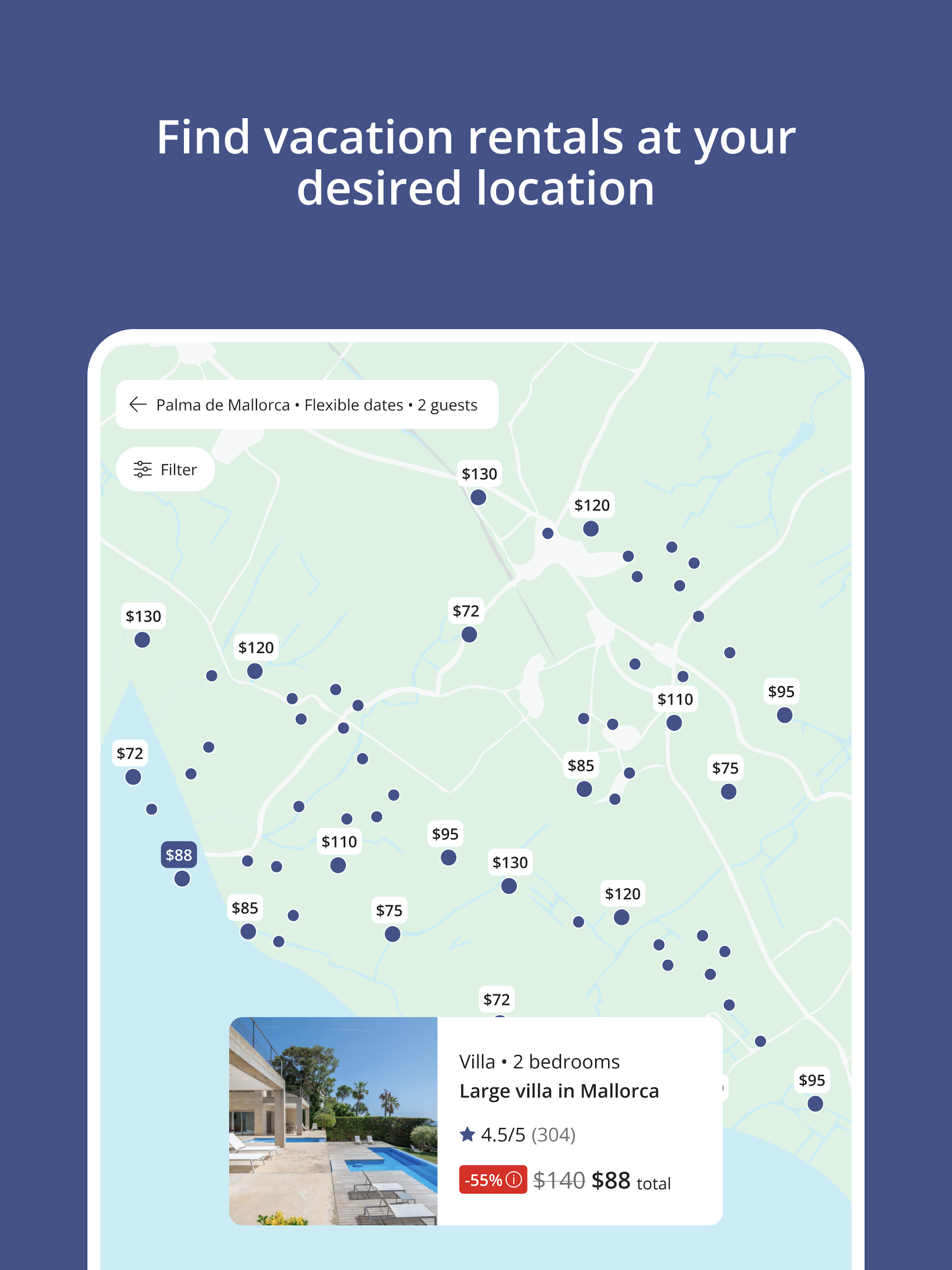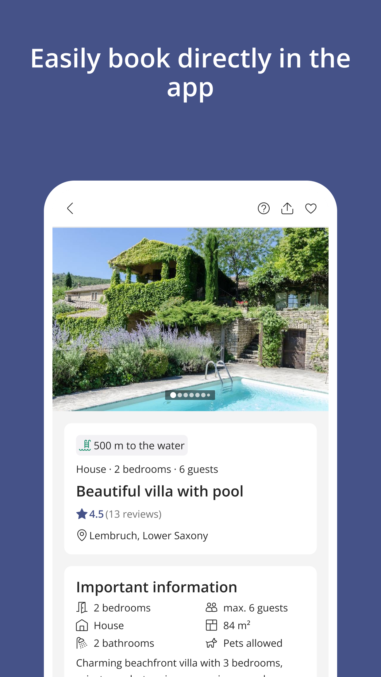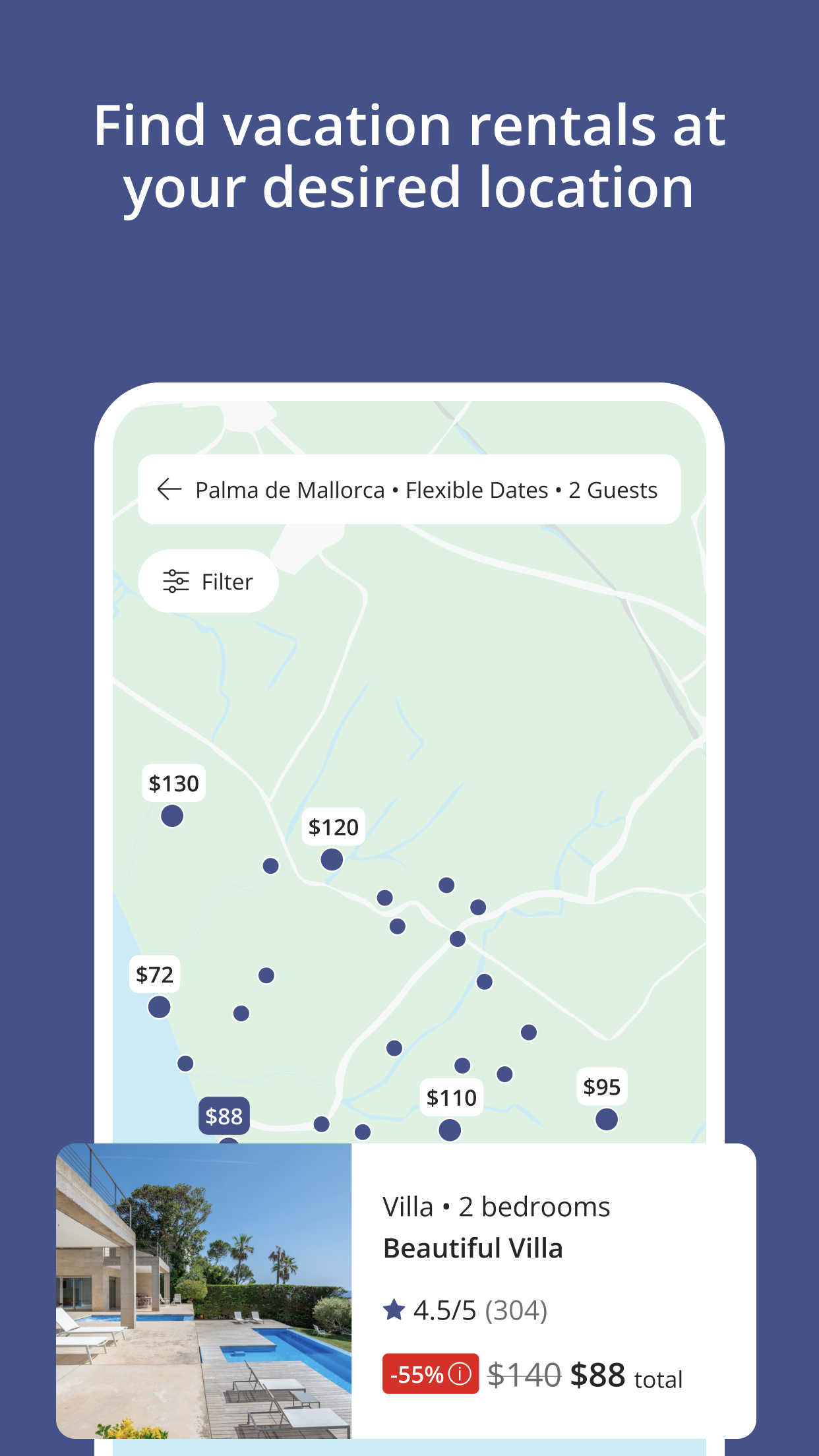Discover vacation rentals effortlessly, compare options, and book securely with just a few taps on your smartphone.
