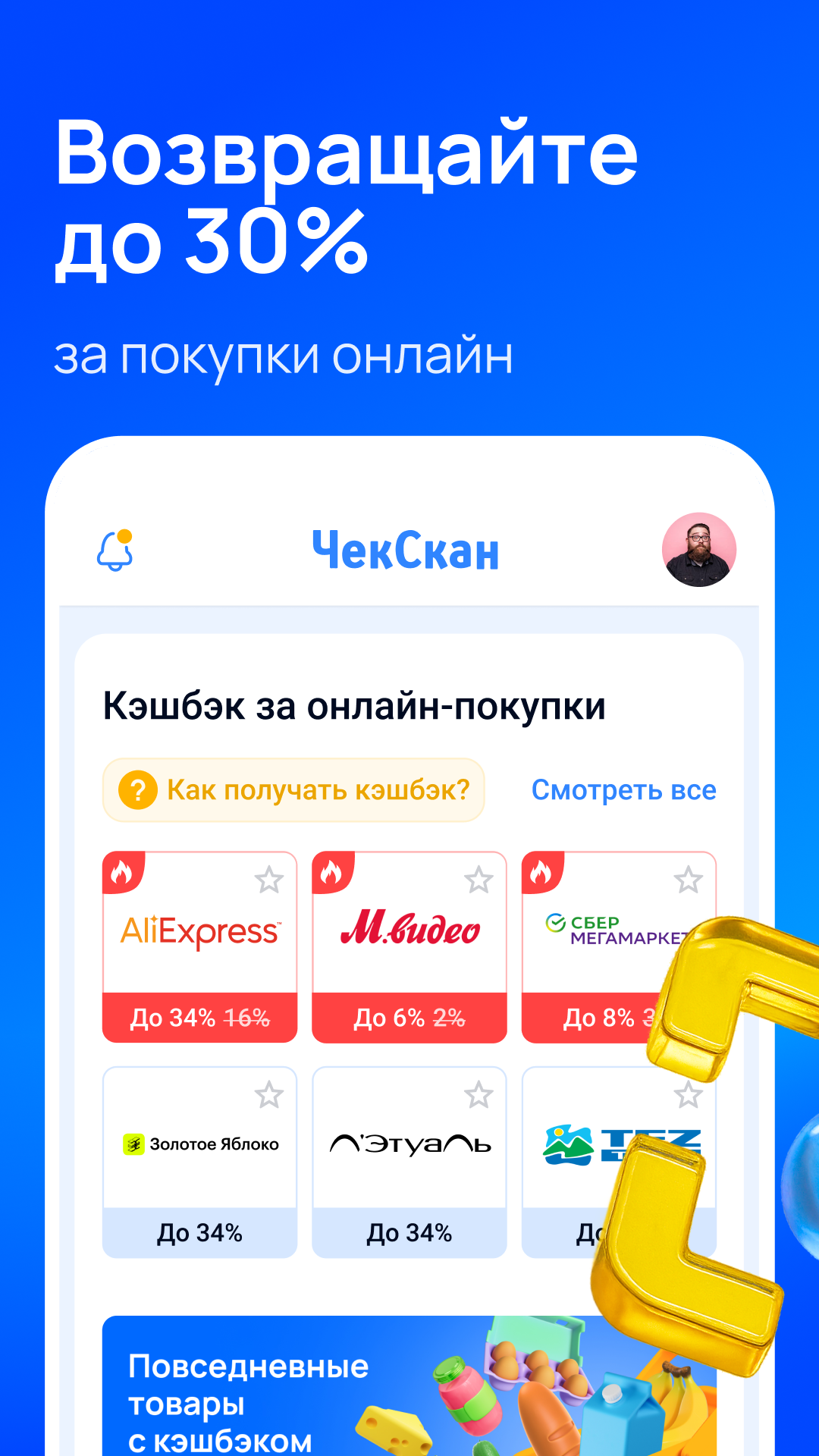 Get cashback by scanning QR codes from receipts obtained from grocery stores, pharmacies, and online retailers. For instance, receive cashback from places like Pyaterochka, Magnit, MTS, Perekrestok, VkusVill, Red&White, Auchan, Bristol, Metro Cash & Carry, Azbuka Vkusa, Be Healthy, and Rigla Pharmacy.