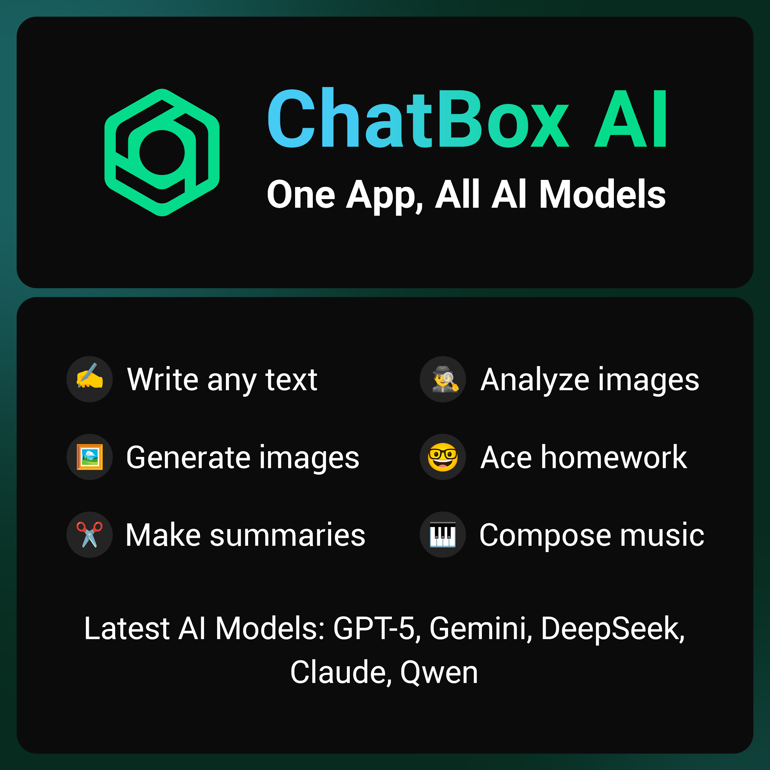 ChatBox utilizes advanced AI tech to deliver exceptional assistance. Be it addressing intricate queries, generating images, or providing in-depth explanations, this AI chatbot, fueled by ChatGPT, GPT-4o, Gemini, and Claude, is your trusted AI sidekick for a myriad of tasks.