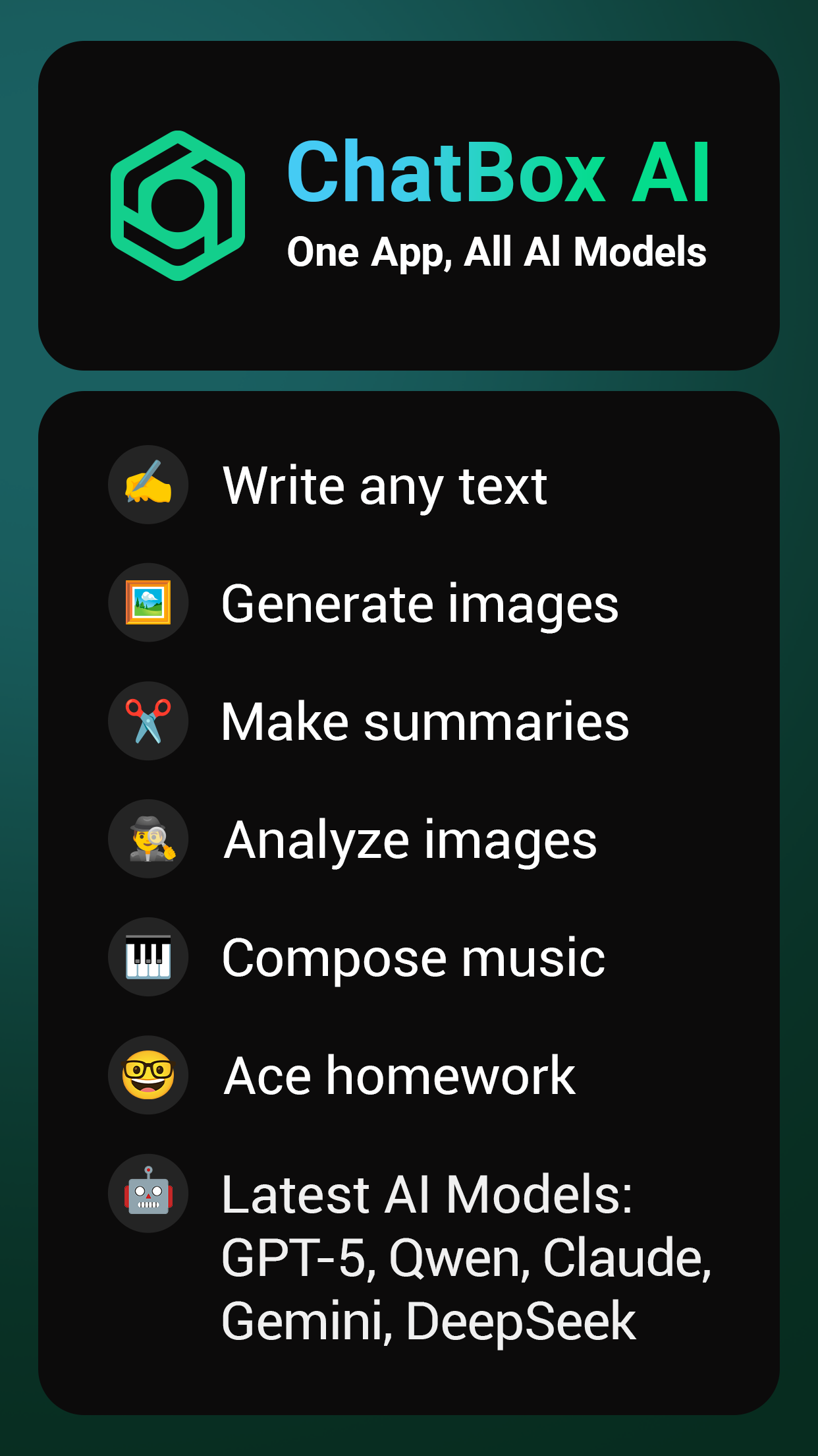 What Can ChatBox Do? Anything you desire! Crafted using ChatGPT, GPT-4o, Gemini, and Claude, our AI chat application can transform into your: