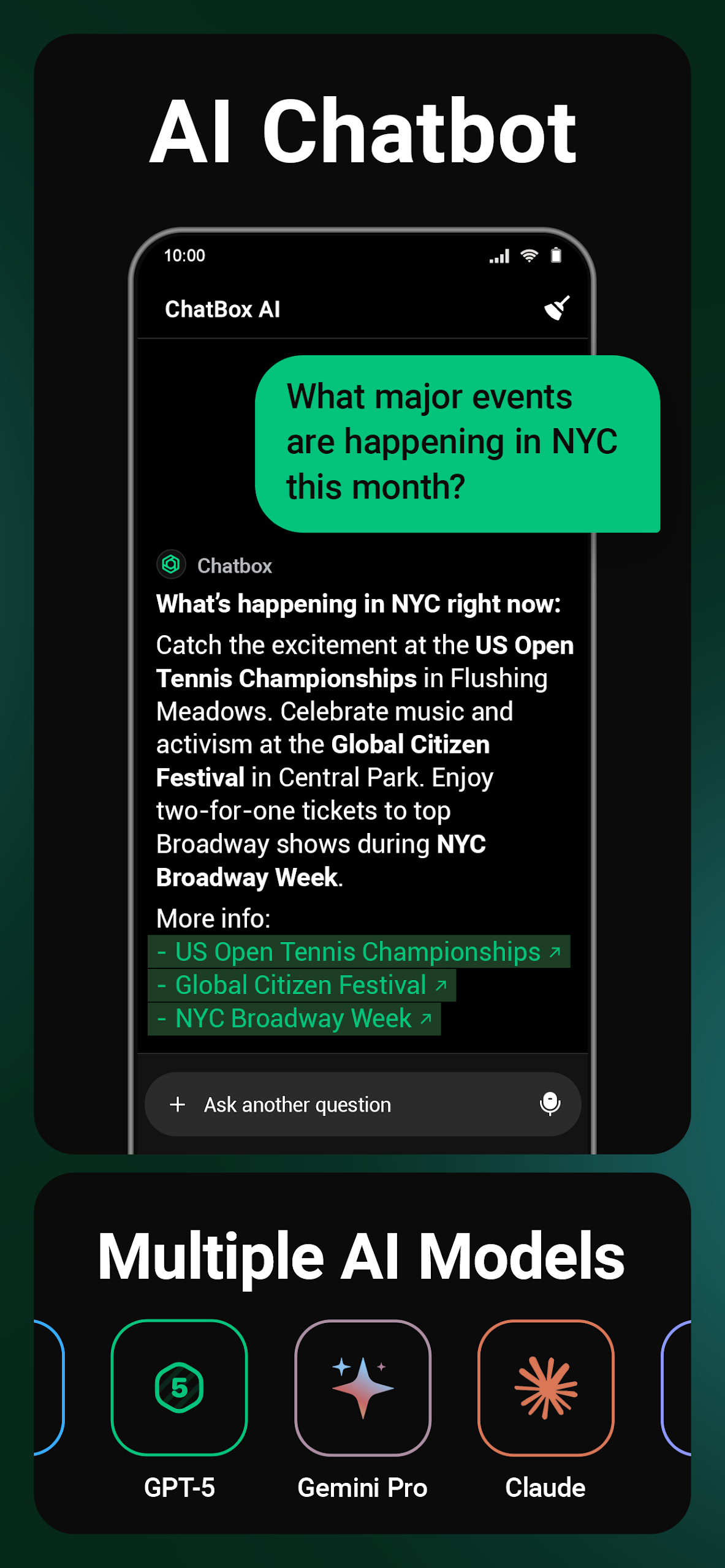 Welcome to ChatBox, your state-of-the-art AI chat companion and virtual assistant infused with the power of ChatGPT, GPT-4o, Gemini, and Claude. Tailored to seamlessly blend into your everyday routine, this AI chatbot harnesses cutting-edge machine learning technologies to amp up efficiency and provide instant solutions.