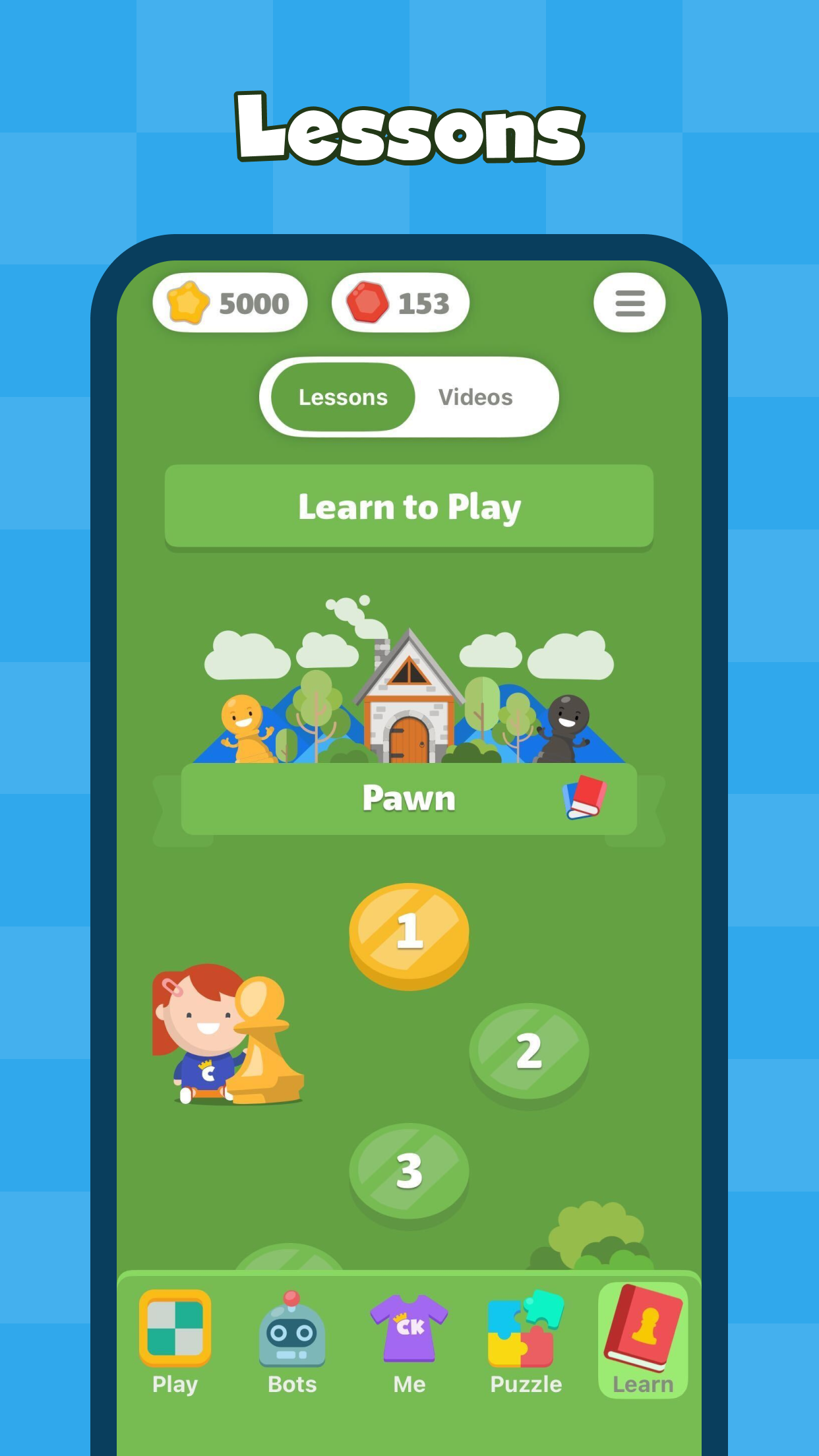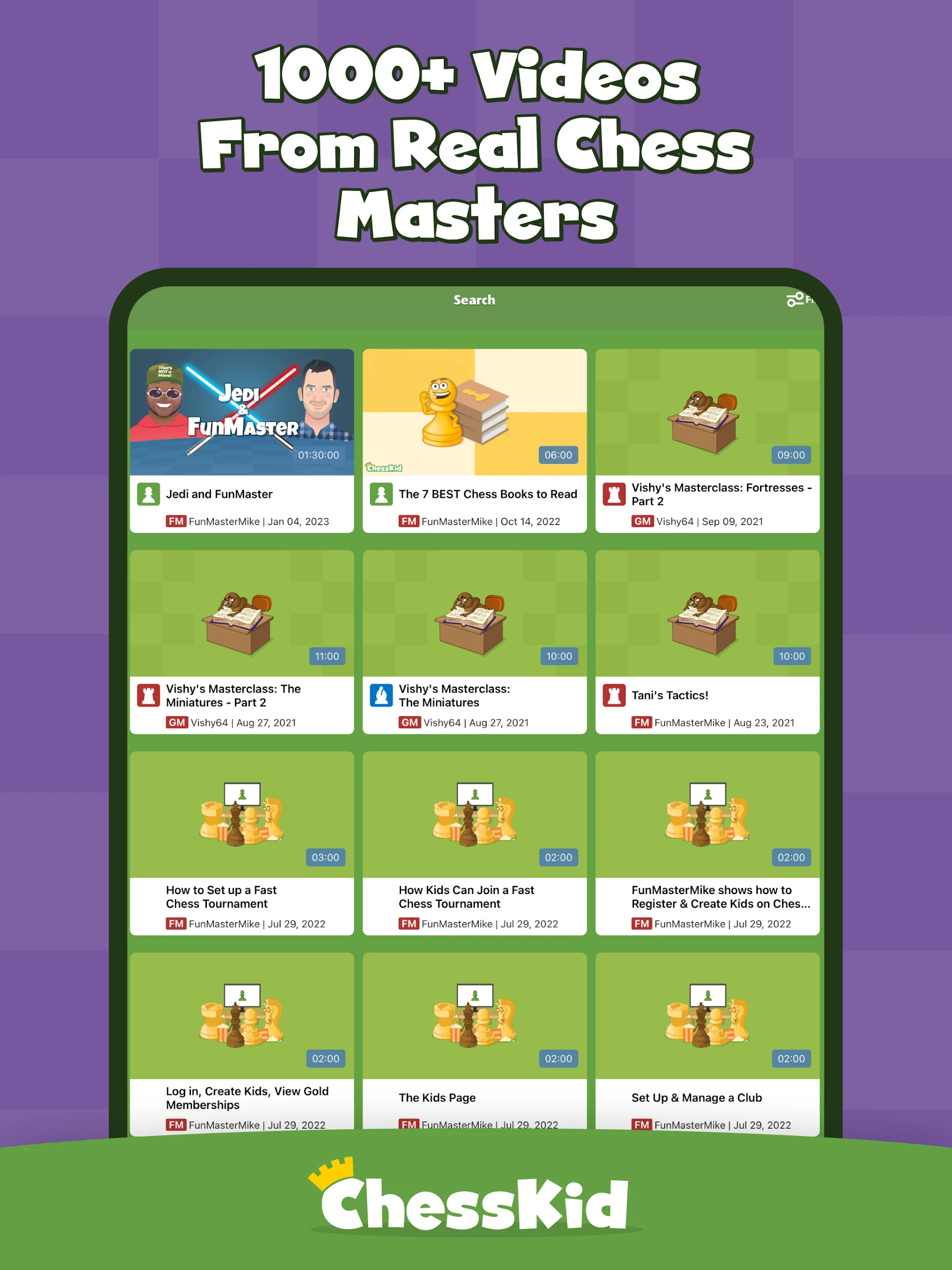- Access kid-friendly coaching videos covering rules, strategy, tactics, openings, and more.