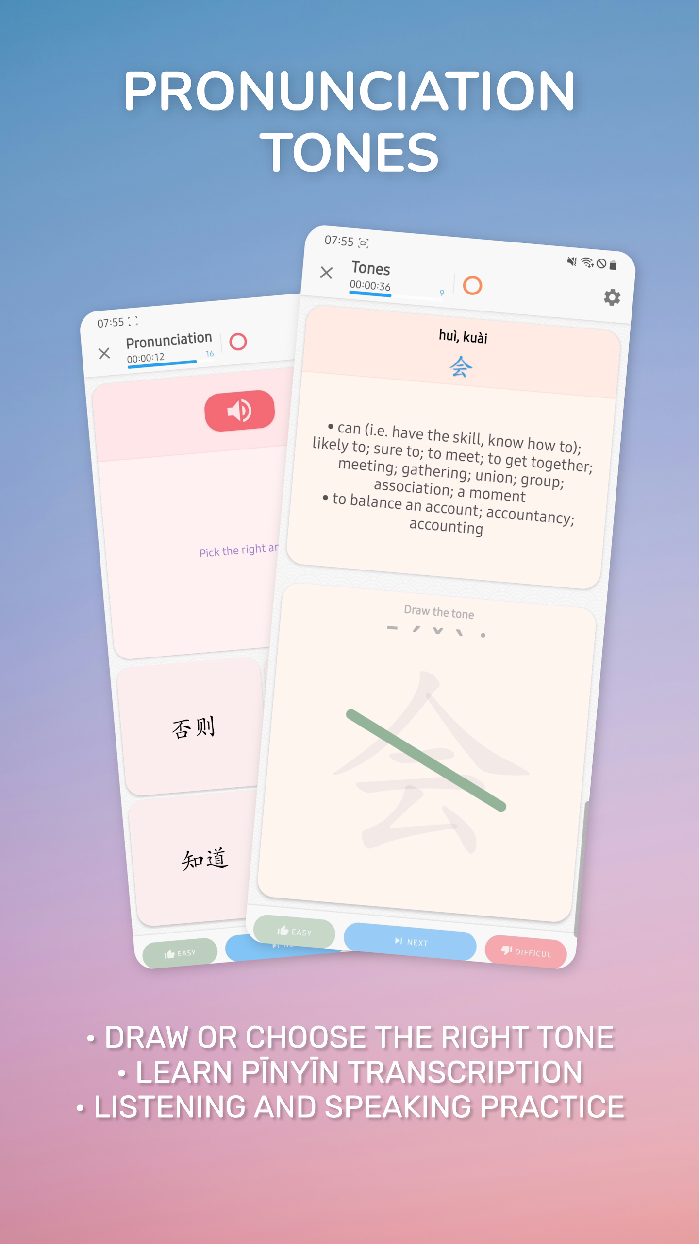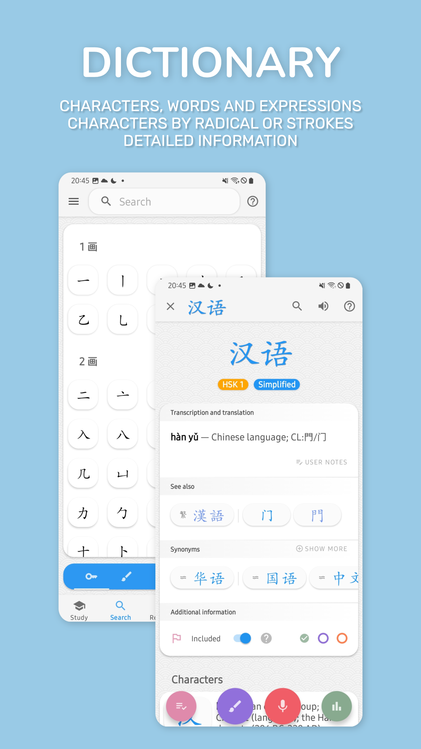 Chinese Guru focuses on building real character knowledge. You practice writing with guided strokes, drill translations both directions, and internalize tones and pronunciation through targeted exercises. A large dictionary powers radical and stroke-based lookups, while pinyin/zhuyin audio and classifier references round out the toolkit. Study plans use spaced-repetition so difficult items resurface at the right time, and smart lists make it easy to organize vocabulary or export writing sheets. With exam labels for HSK/TOCFL and support for simplified or traditional forms, the app is designed to help beginners and advanced learners keep steady progress in one place.