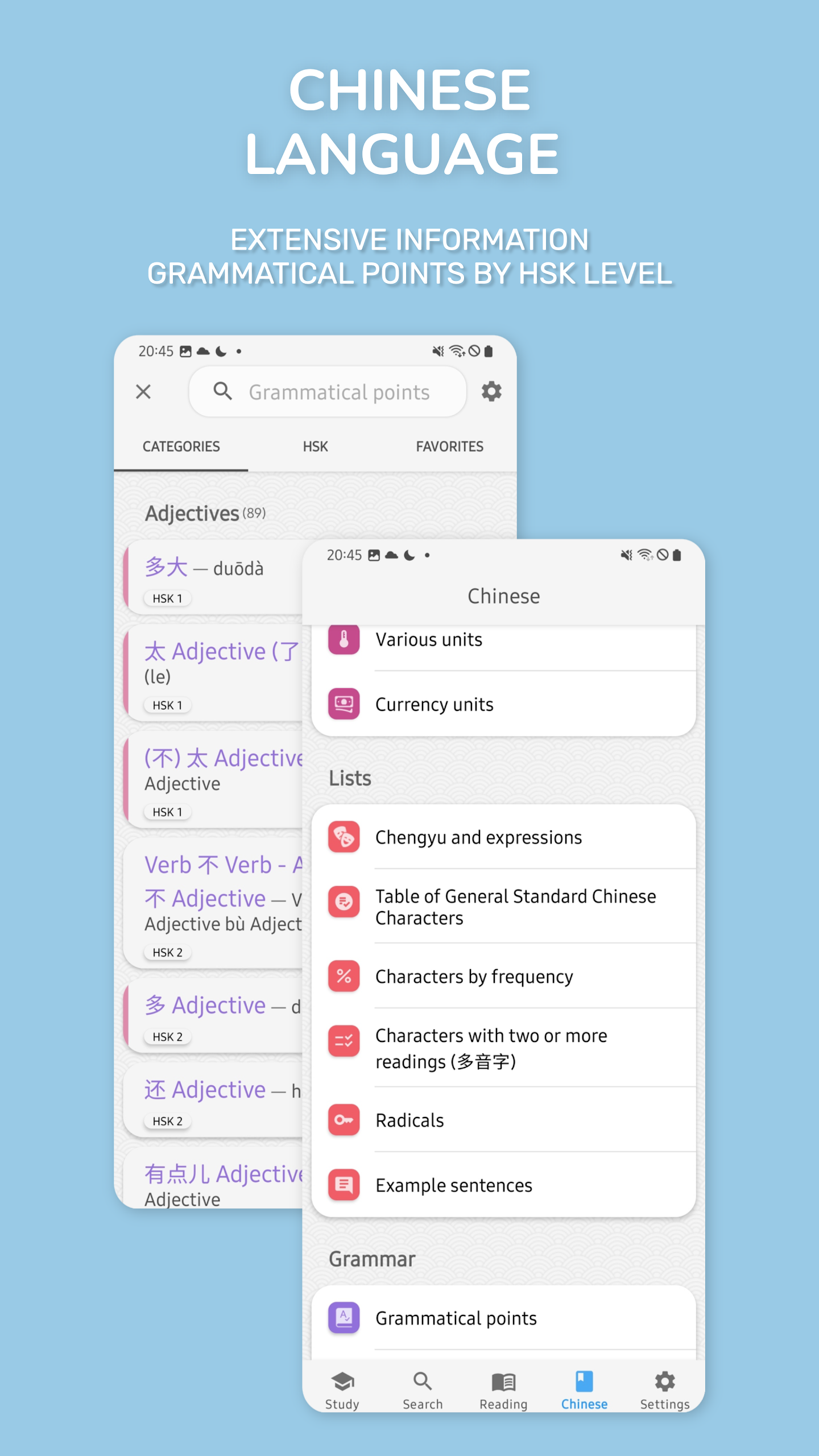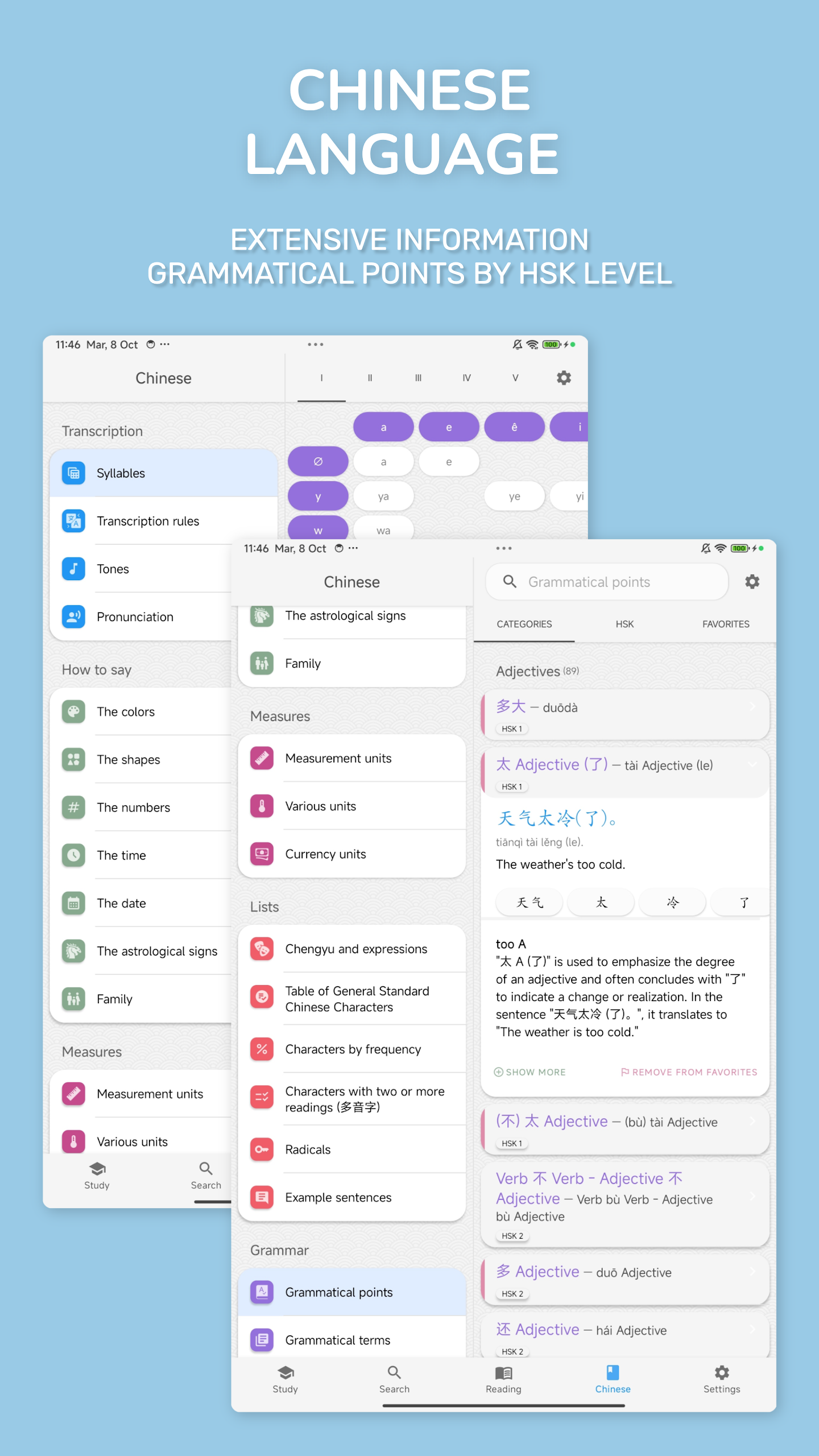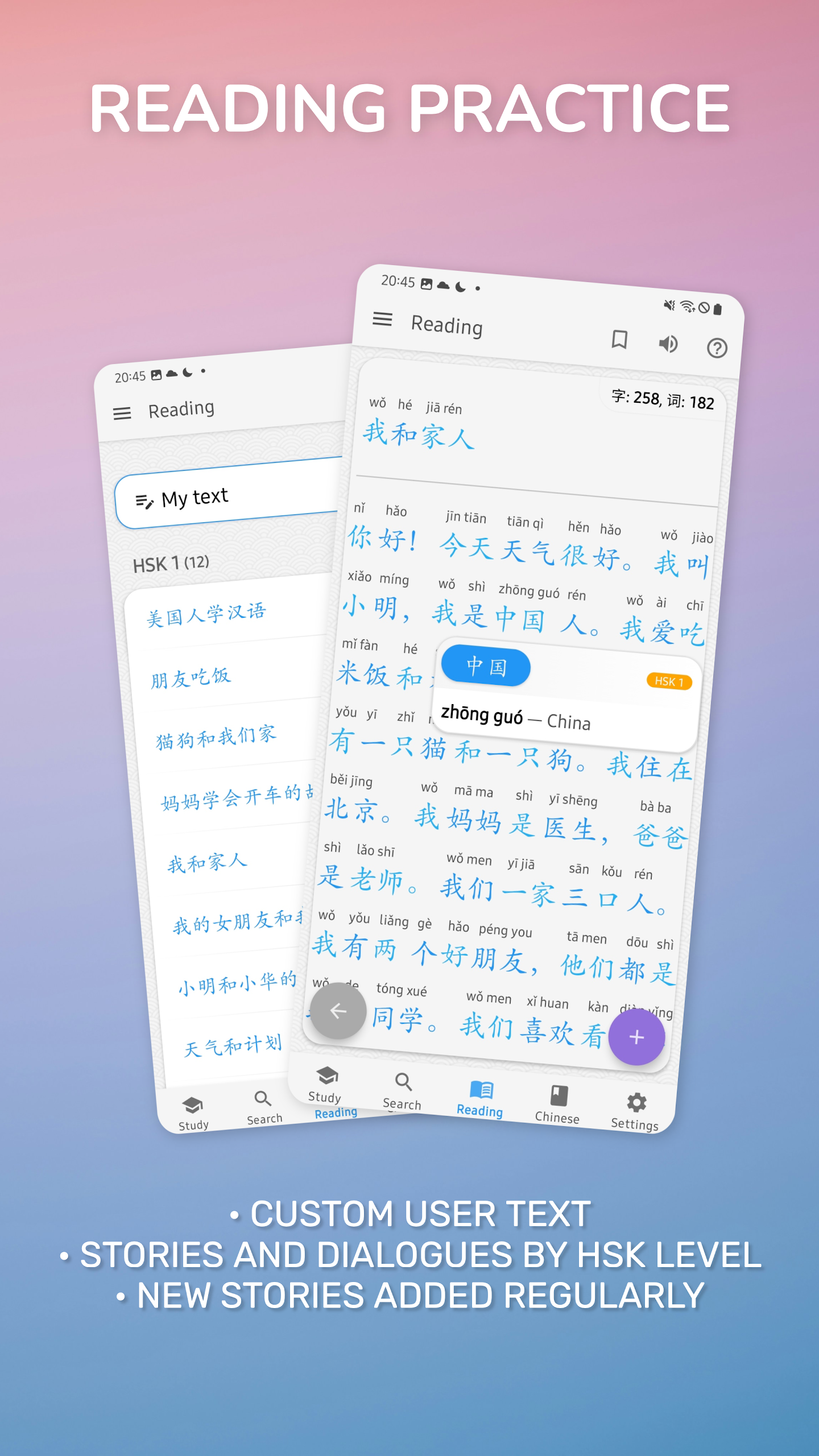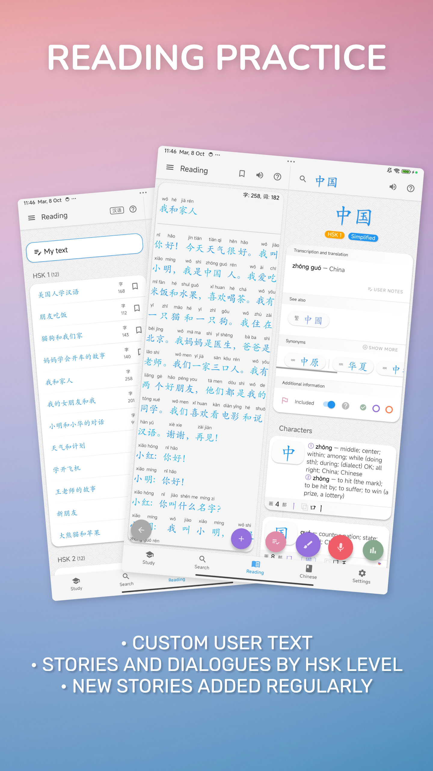 • Reading is a crucial aspect of language acquisition, and various texts tailored to each HSK level are available. New content is added regularly.