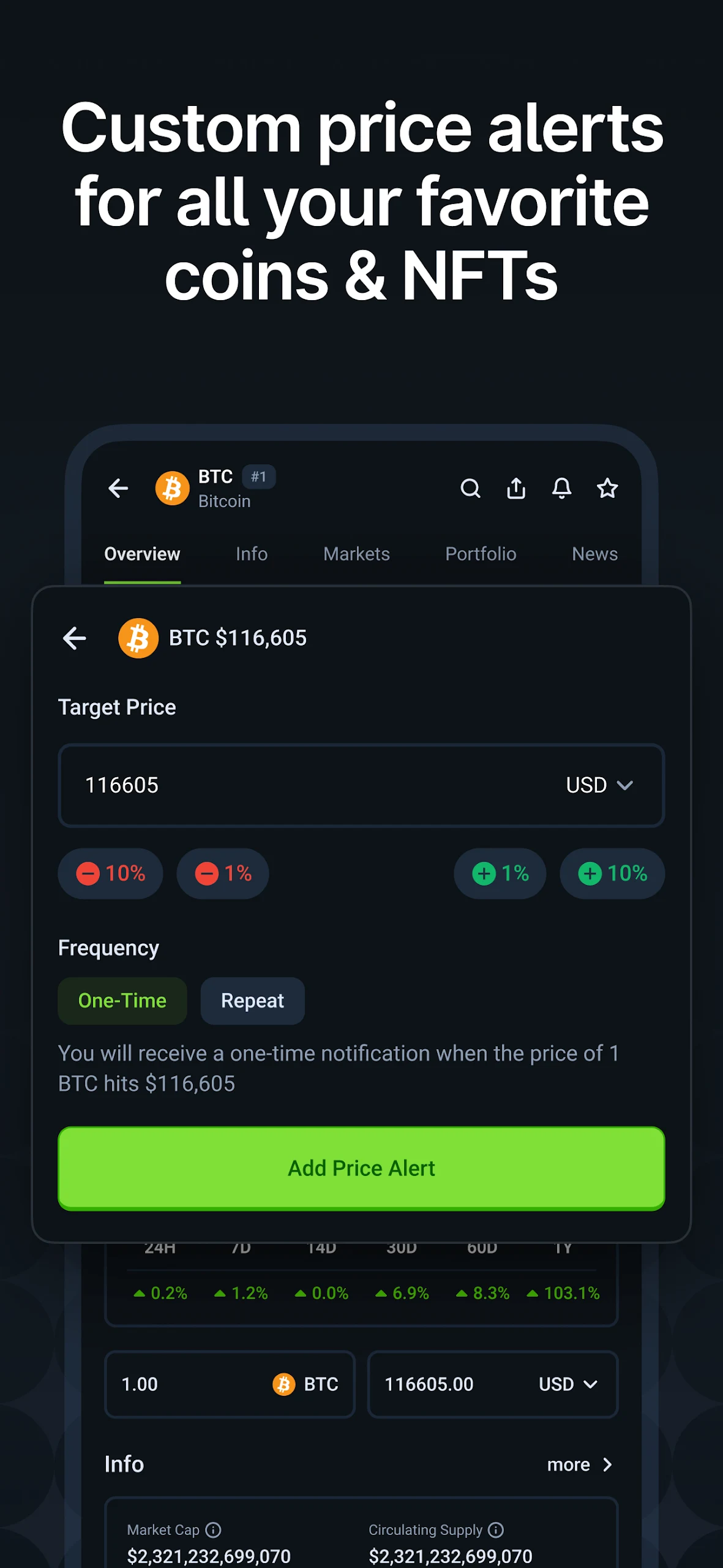 🚀 Set custom price alerts including alerts for significant market movements.
