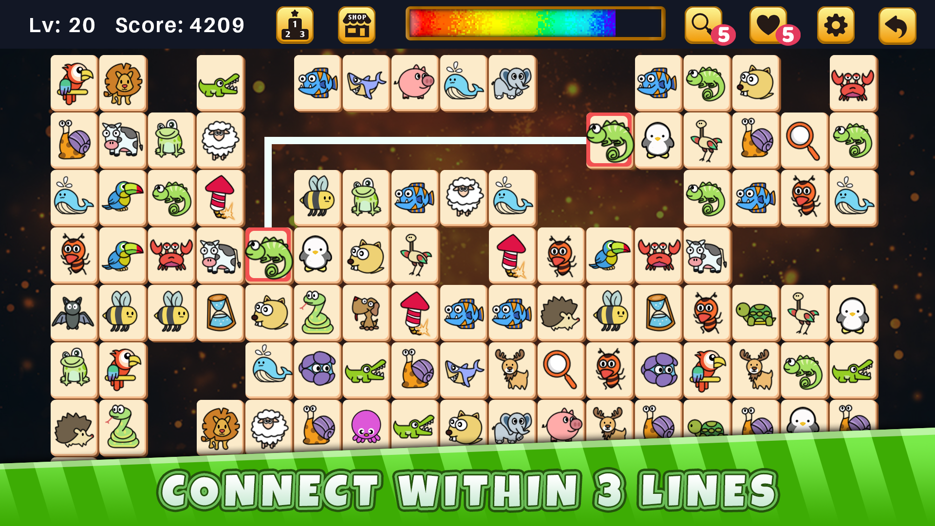 ★ Match two identical animals that can be connected in three lines.