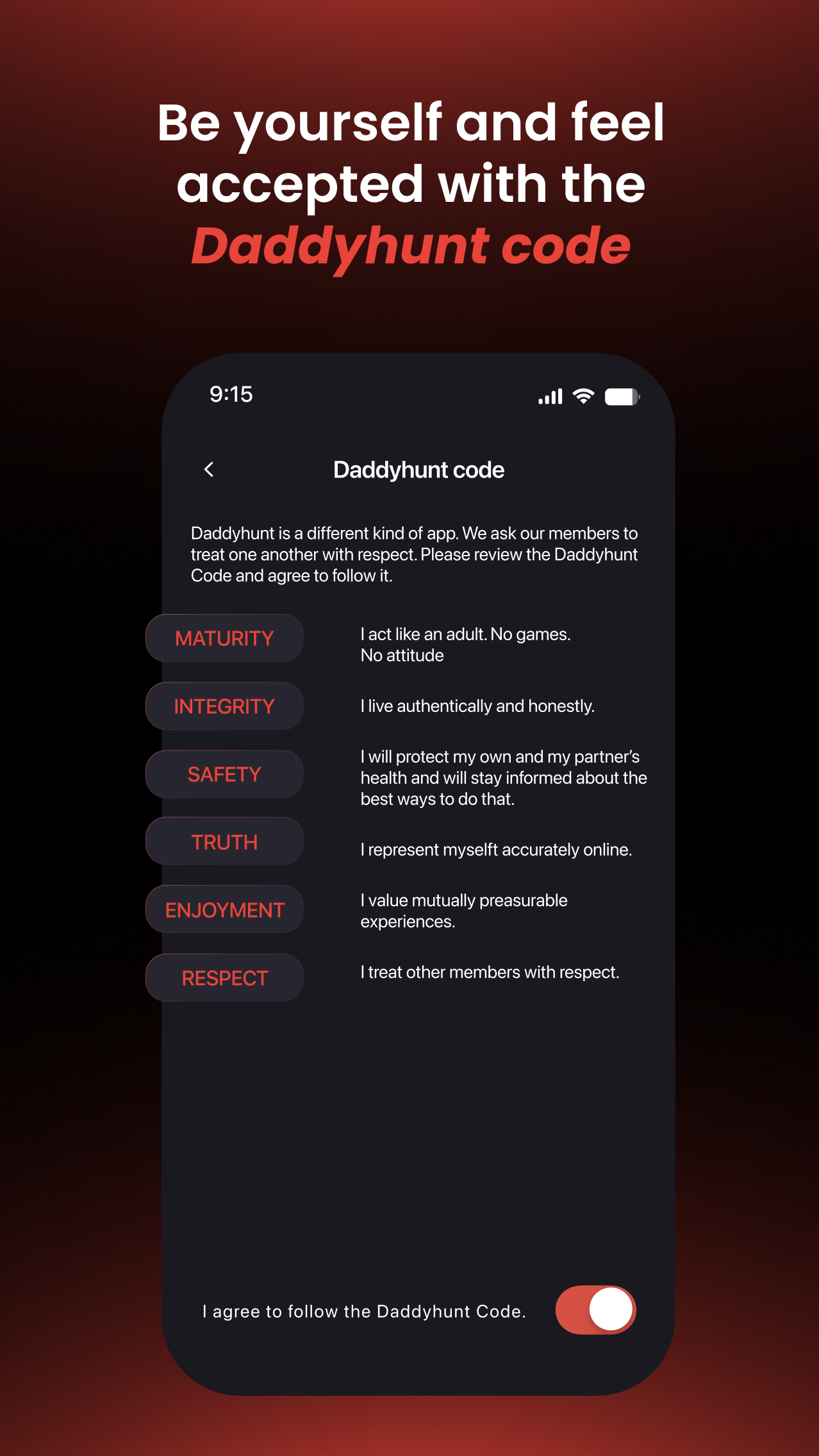 Daddyhunt is also the only gay dating app that allows members to sign a code of mutual respect. Ours is a friendly community that doesn't tolerate any kind of shade, in any shape or form. EXPERIENCE MATTERS and it shows on Daddy-hunt.