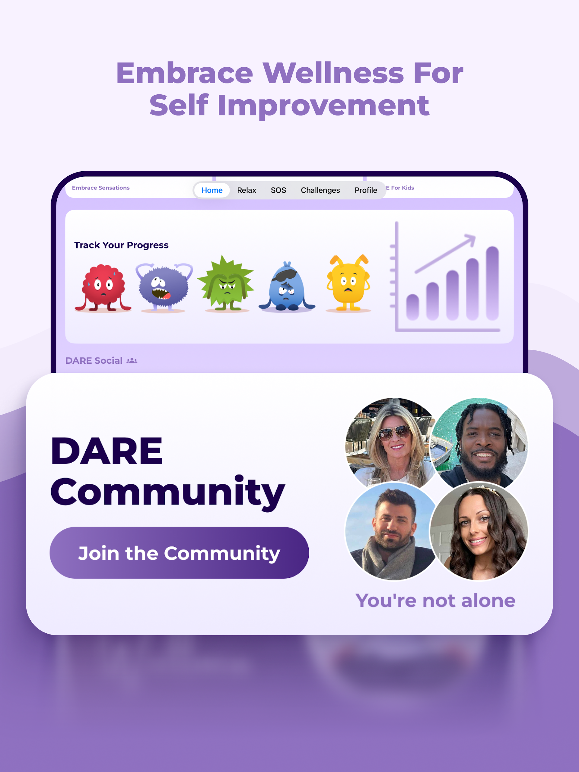 Members also connect with supportive DARE buddy groups, take part in two live group Zoom sessions each month with our expert DARE clinical team, receive Daily Dares, engage in guest master classes, and more!