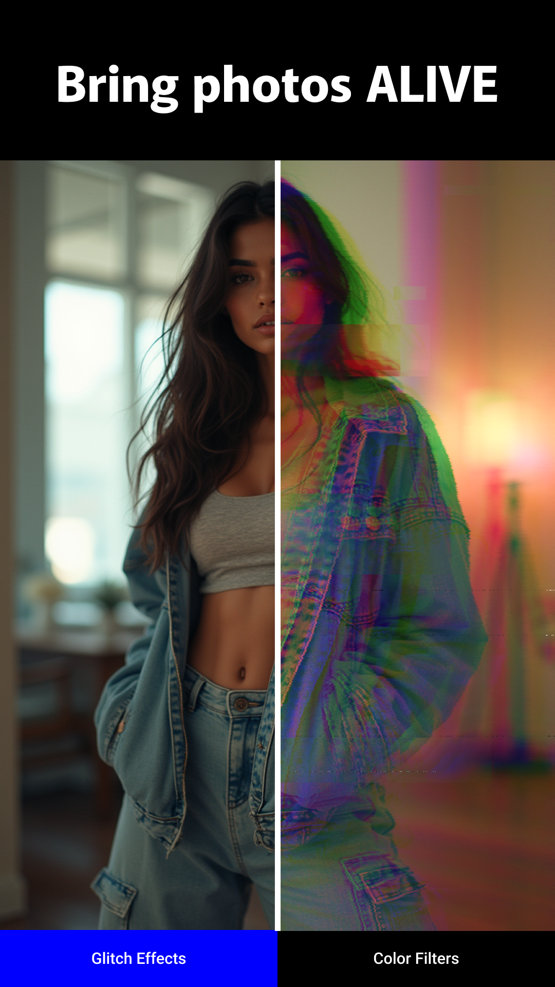 - Instantly transform plain photos into striking glitch masterpieces with one tap