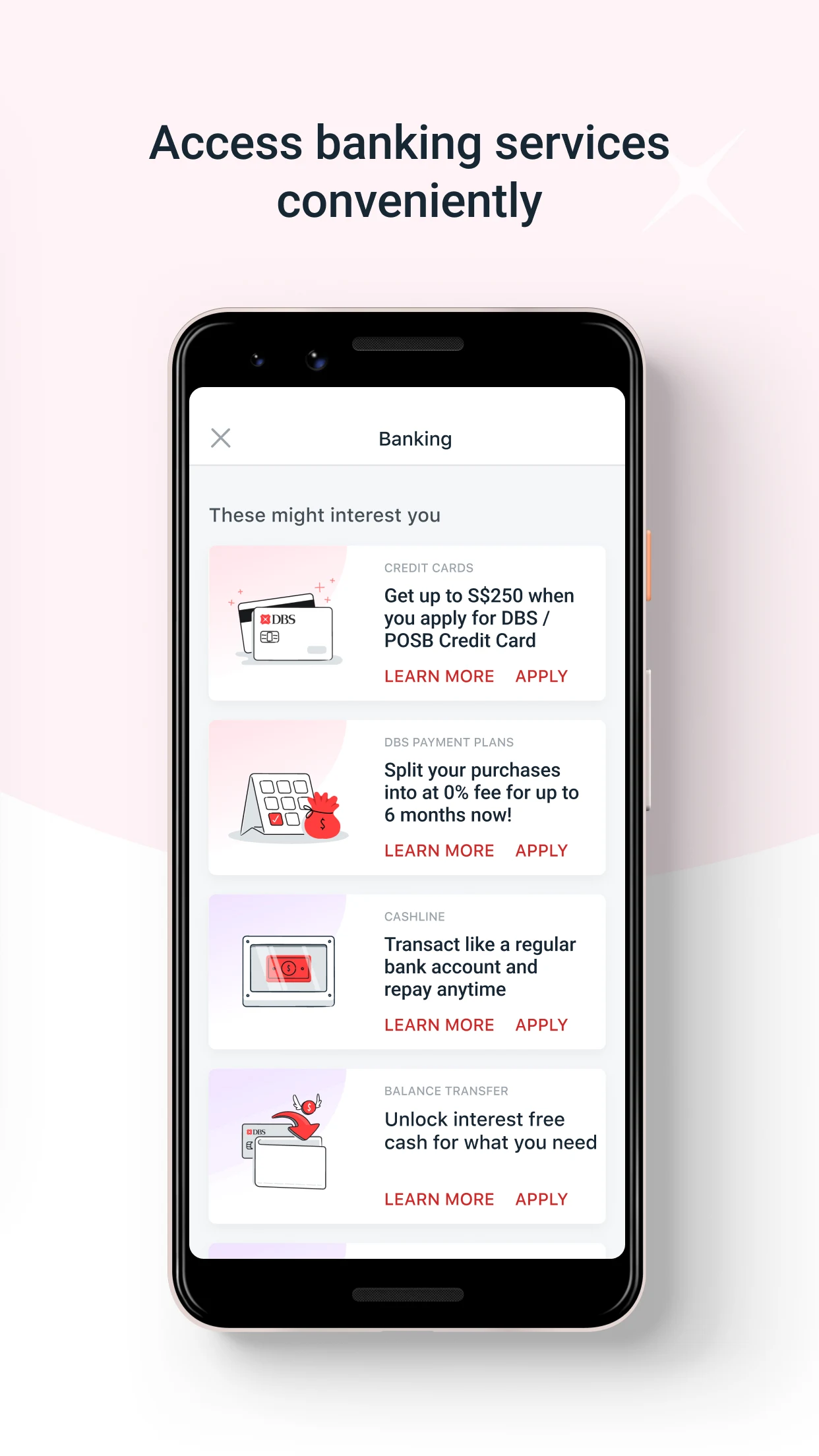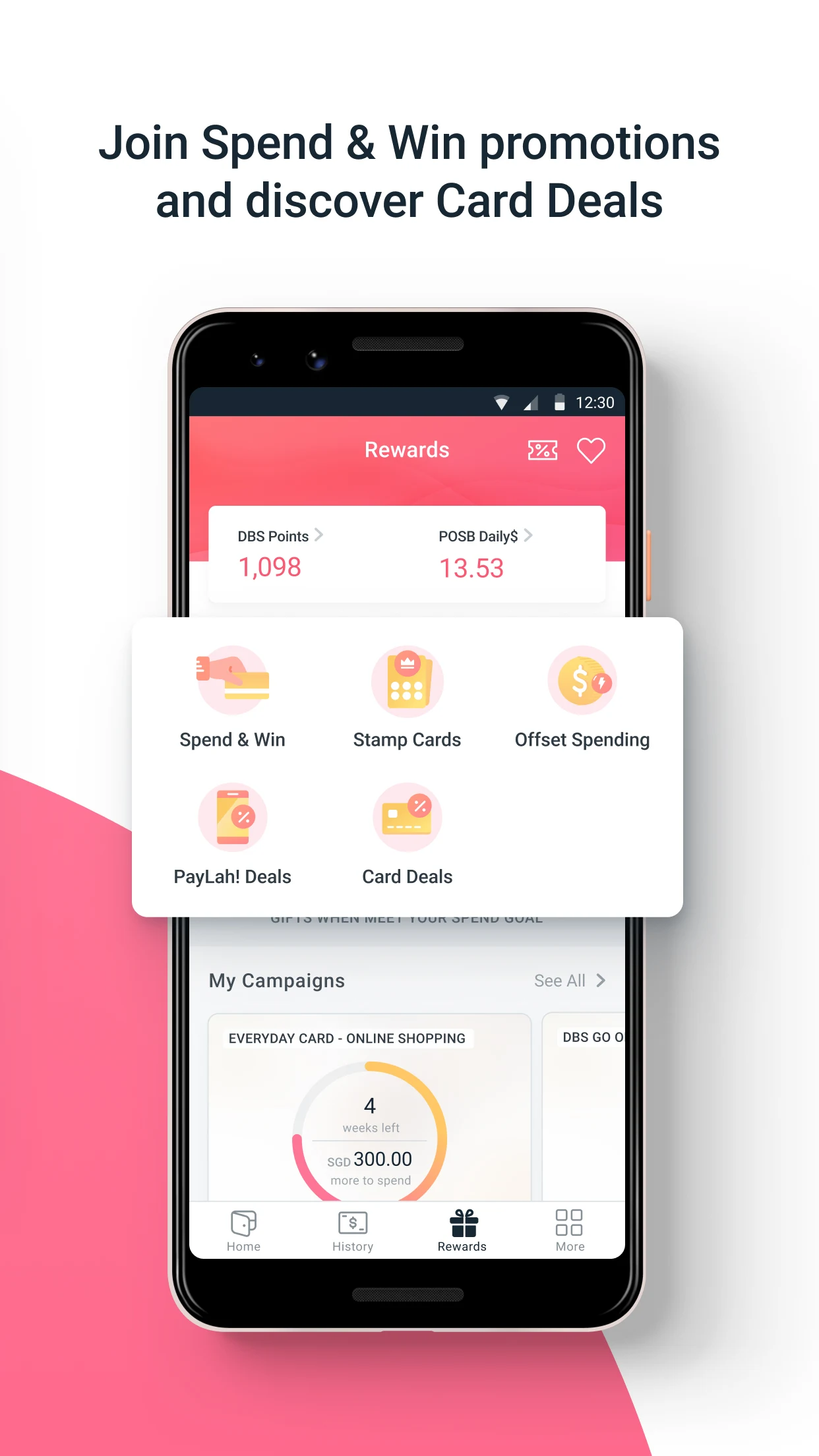 - Card Rewards: Track and redeem your card reward points (DBS Points and POSB Daily$), view personalized card deals, and participate in Spend & Win promotions for sure-win prizes.