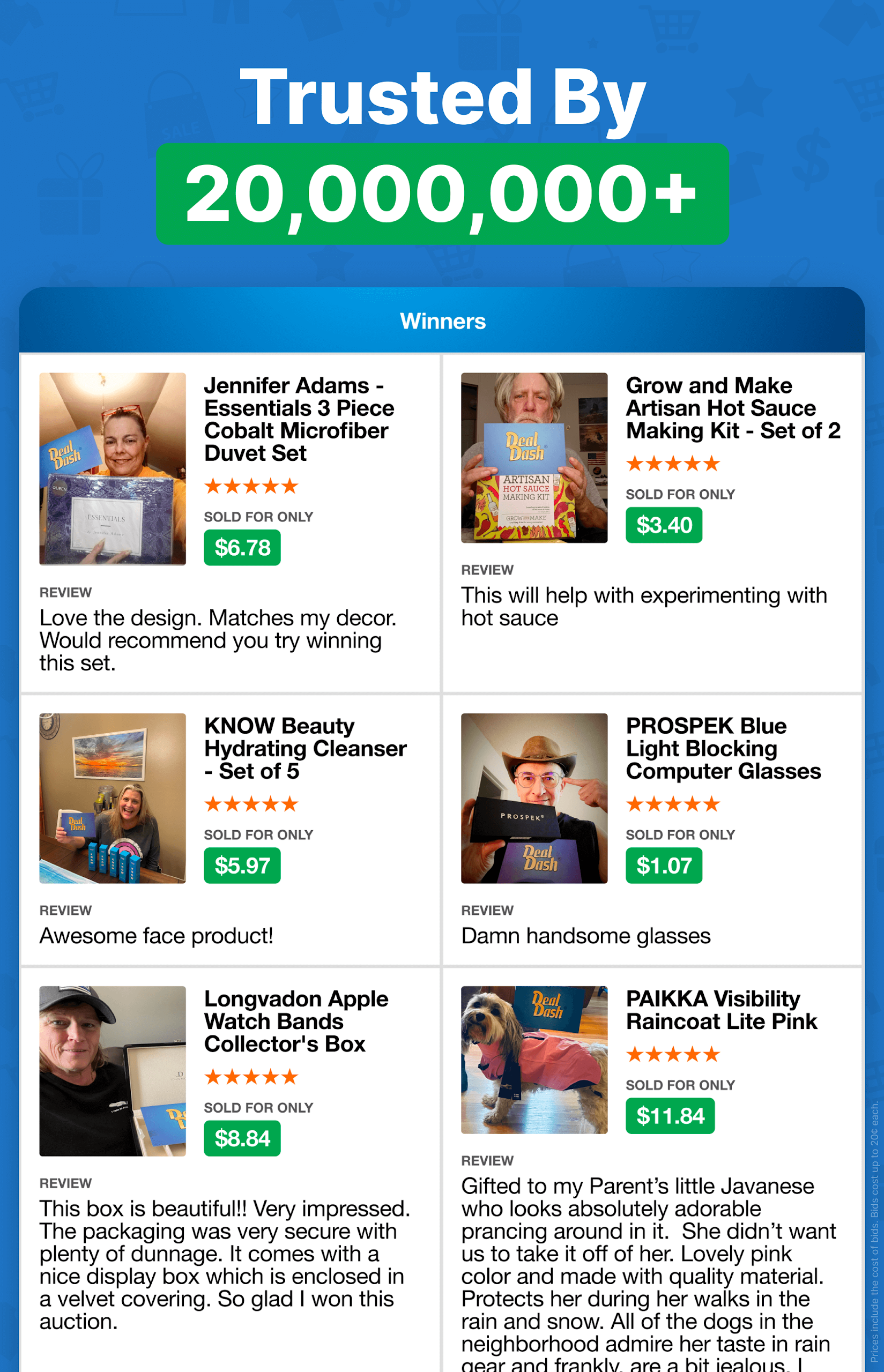 - With over a decade of experience, DealDash has earned the trust of more than 20,000,000 registered users and boasts an A+ rating from the Better Business Bureau.