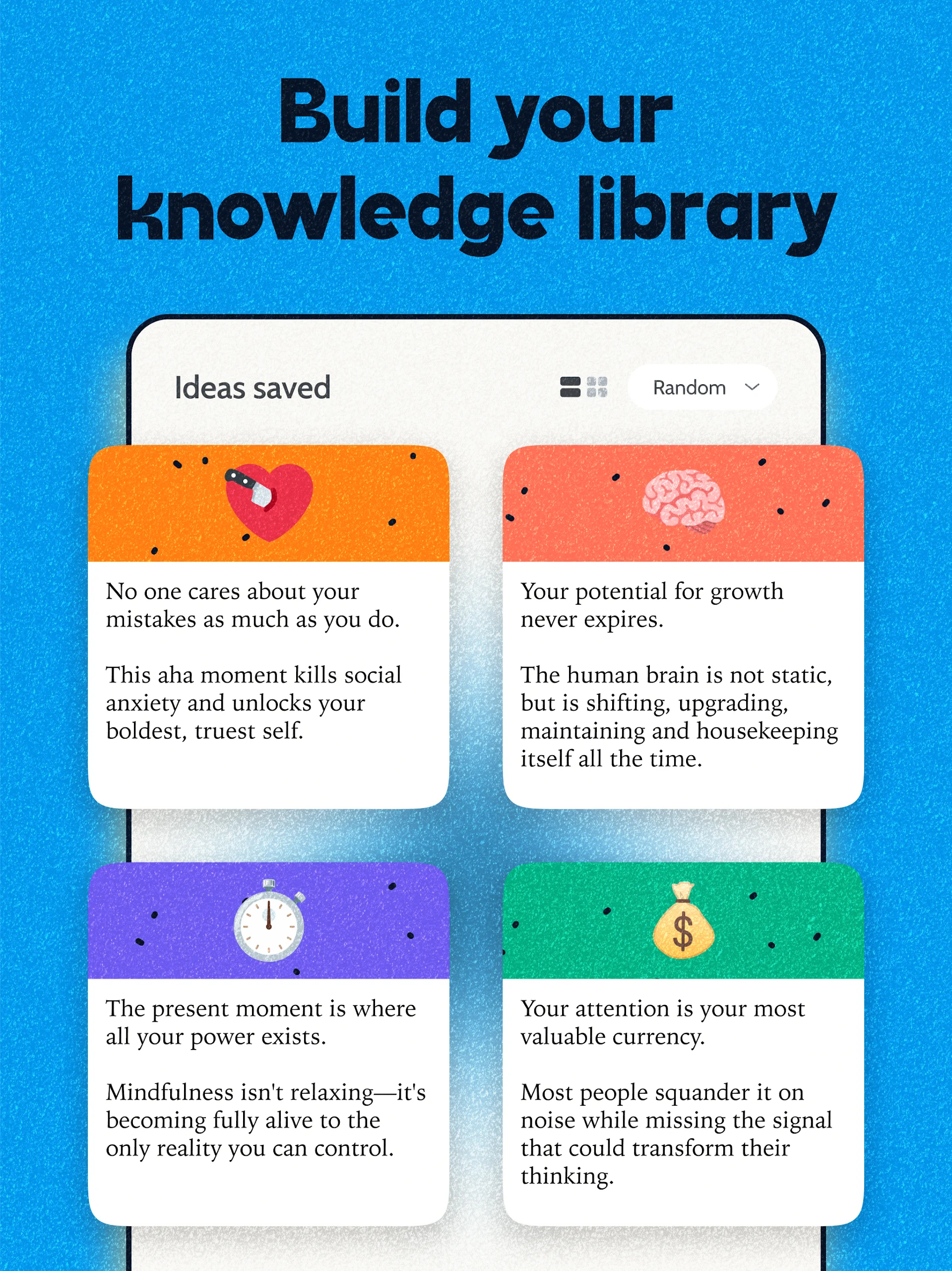 Users like you contribute to the platform by sharing ideas they find valuable from various sources. These ideas cover a wide range of topics from marketing and leadership to philosophy. By adding your own ideas or saving those of others, you continually build your knowledge base.