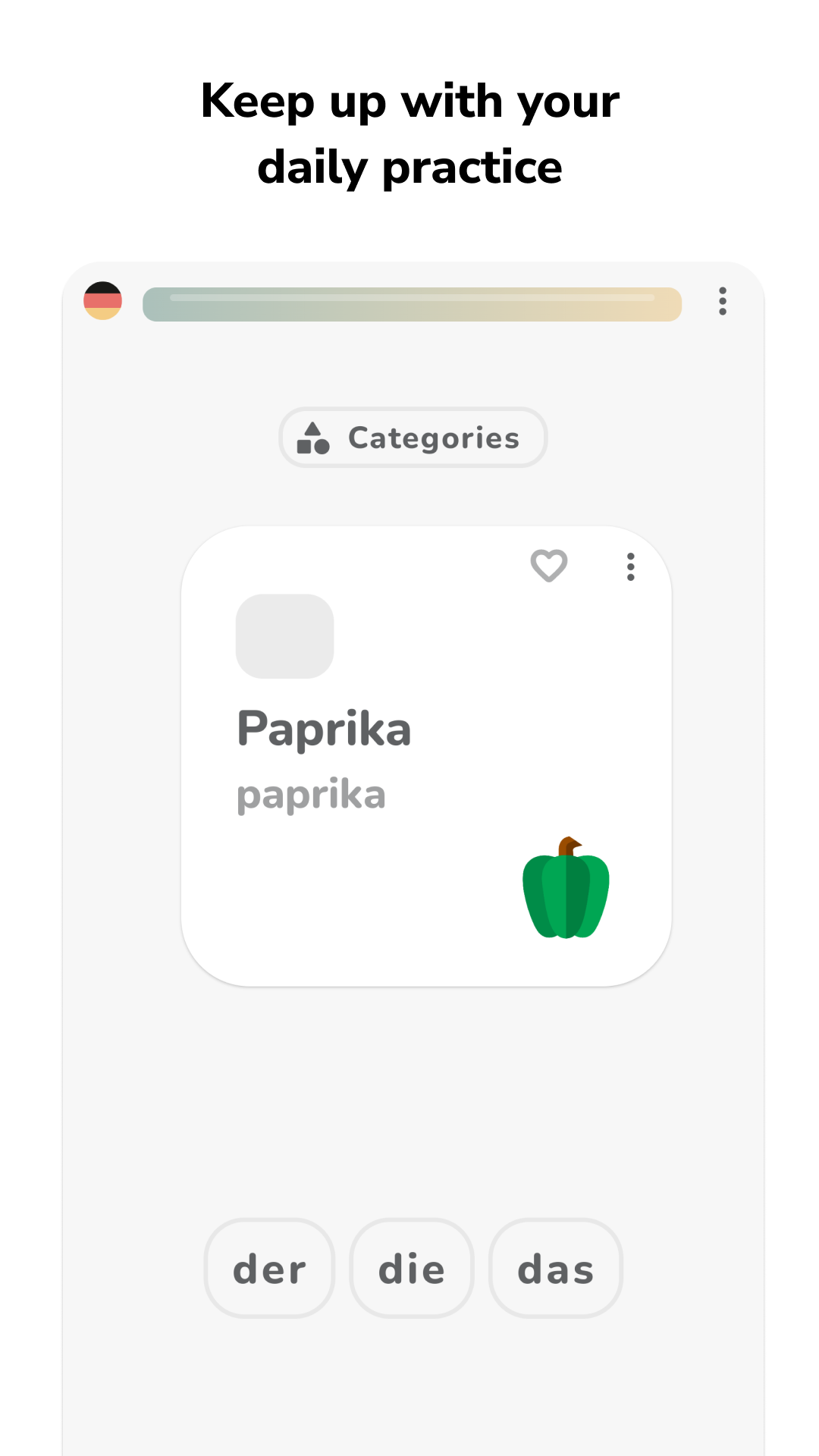 Speaking is crucial! Merely remembering vocabulary is insufficient; it is essential to articulate it. Utilize the speech functionality to pronounce both the article and the noun (e.g., “Der Apfel” 🍎).