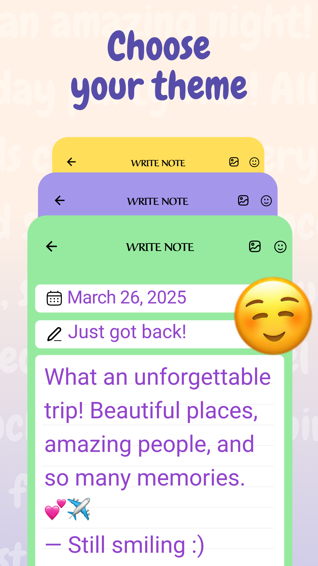 Further enhancing its utility, the app allows for great personalization. You can customize themes according to your mood or the time of day, and select backgrounds that reflect your personal taste. Tagging entries is effortless, helping you organize notes by category, whether they relate to specific personal moments or professional insights.