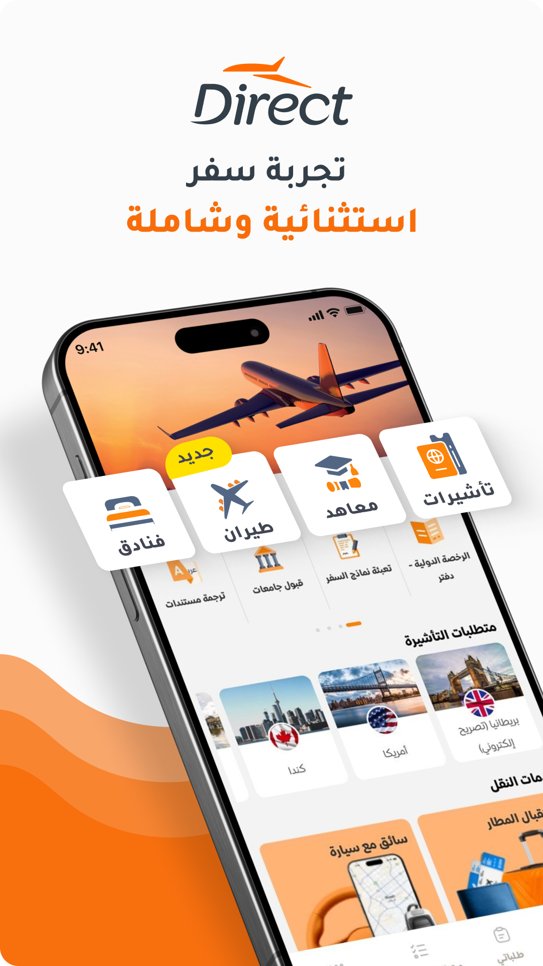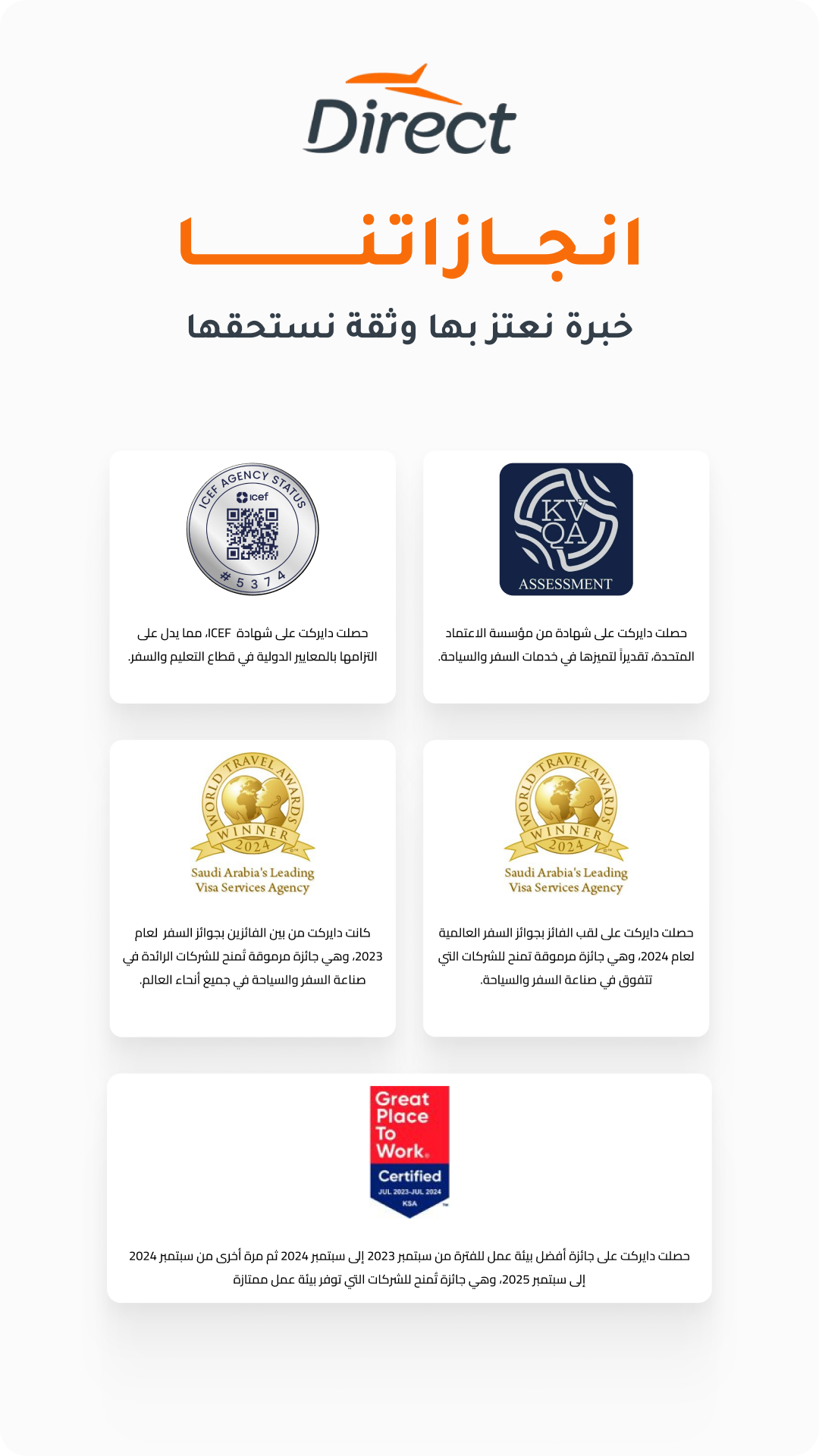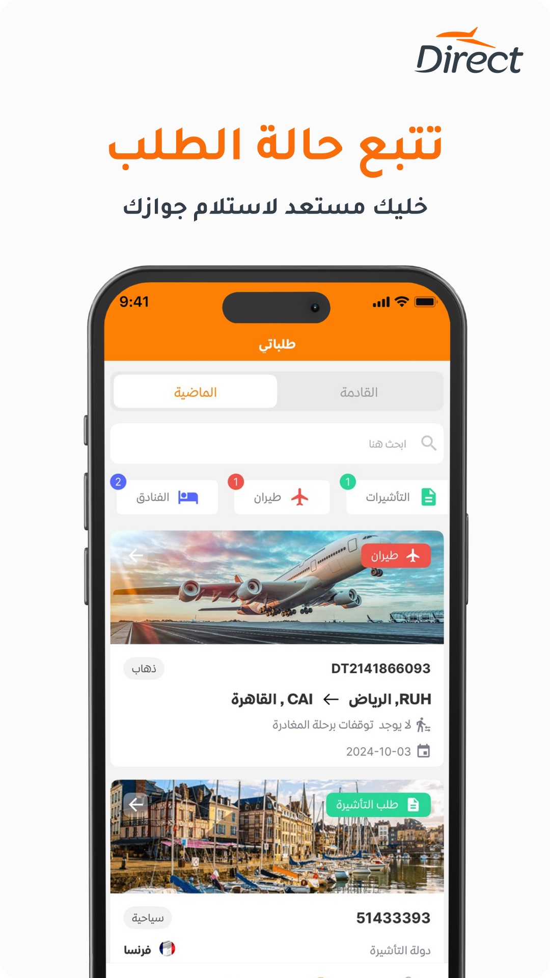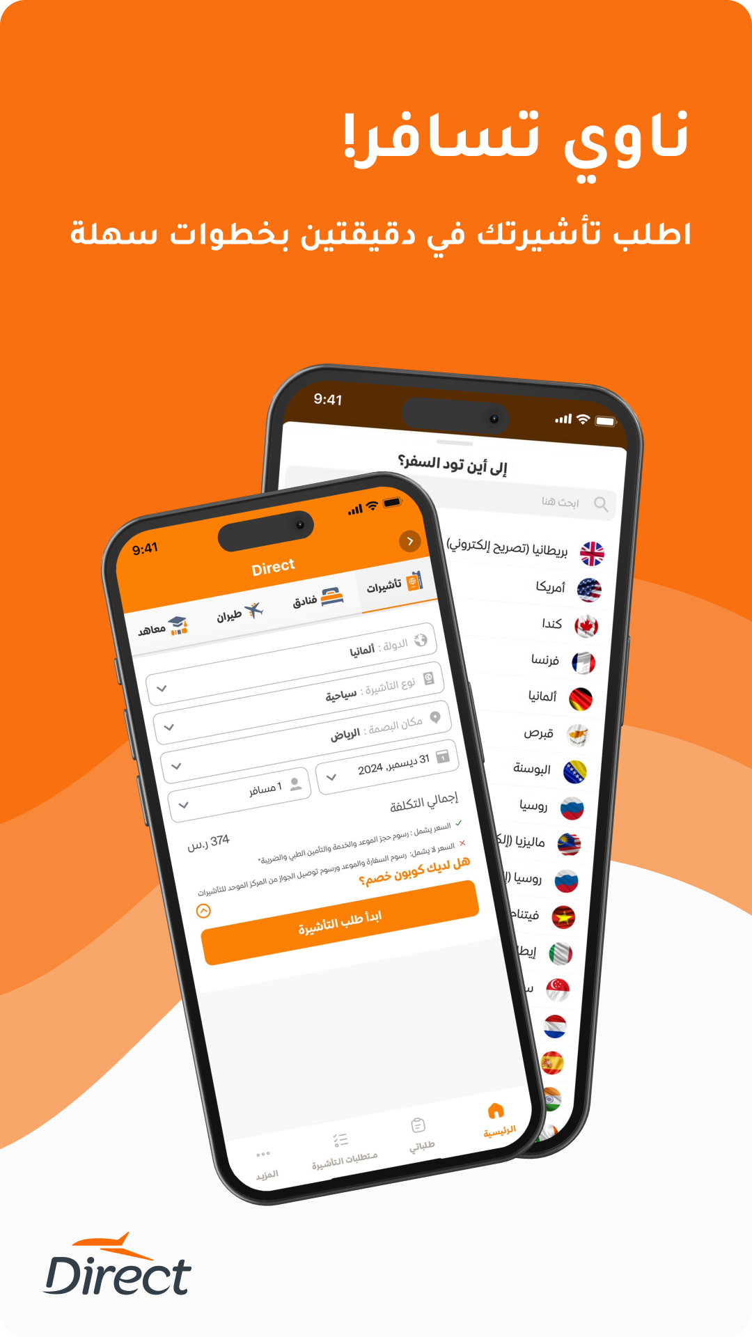 Direct is the first app of its kind designed for Saudi citizens who wish to obtain tourist and study visas for over 20 countries worldwide. You can apply for your visa through the app with easy and straightforward steps or by visiting one of our branches located across the Kingdom.