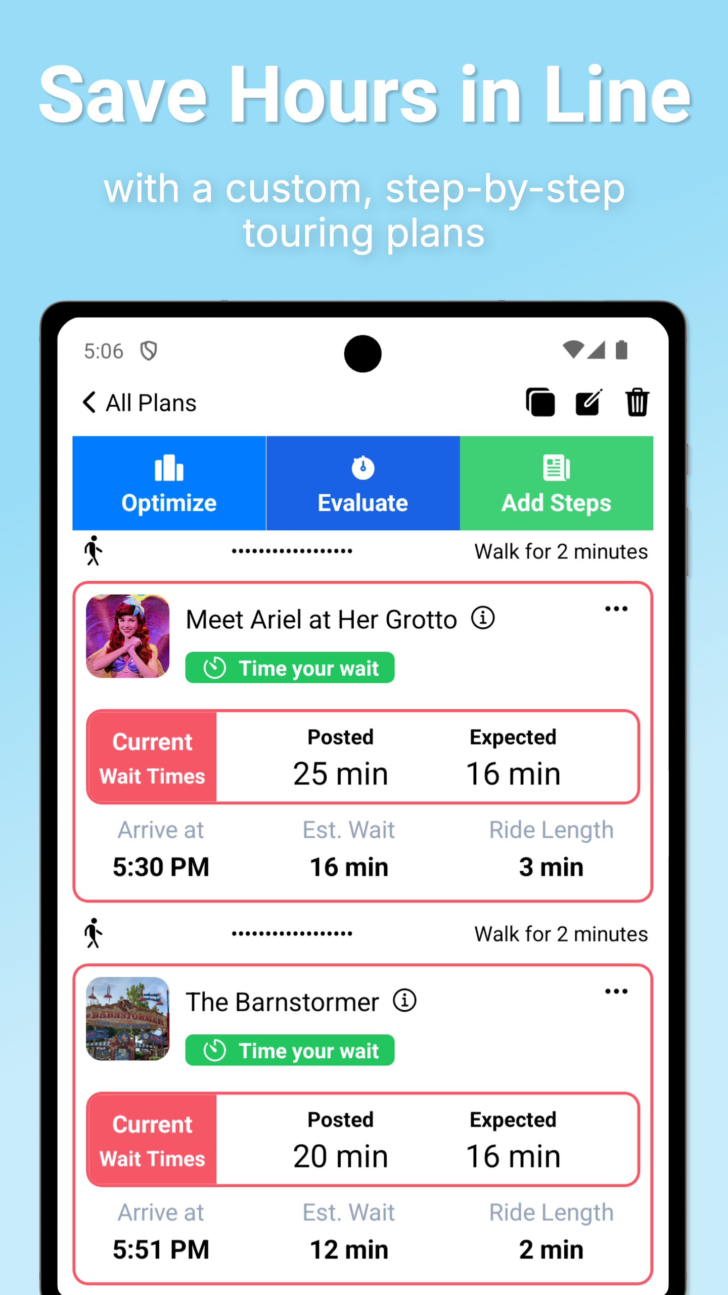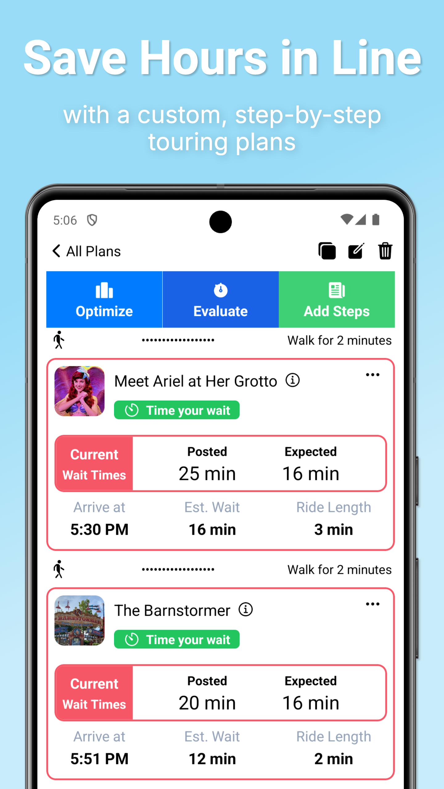 • If crowds shift, tap “Evaluate” to see how the change affects your plan, then “Optimize” again.