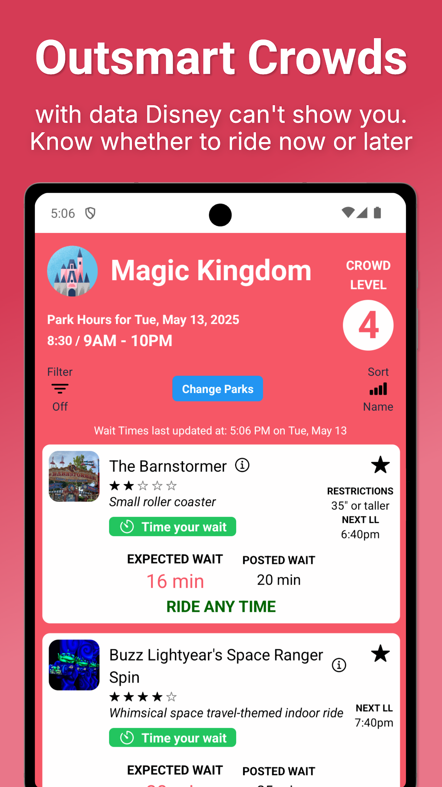 • Each ride lists Posted Wait (Disney’s sign) vs. Expected Wait (app’s prediction).
