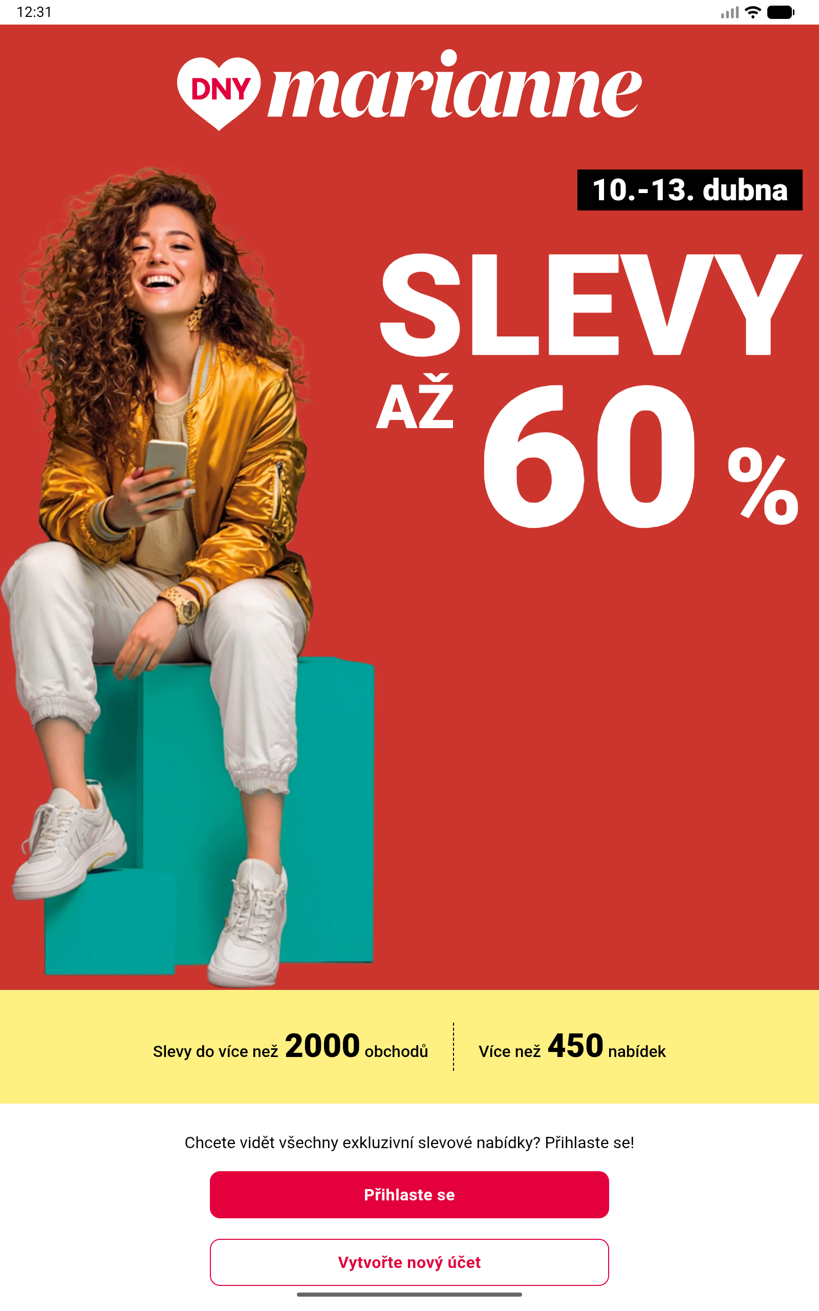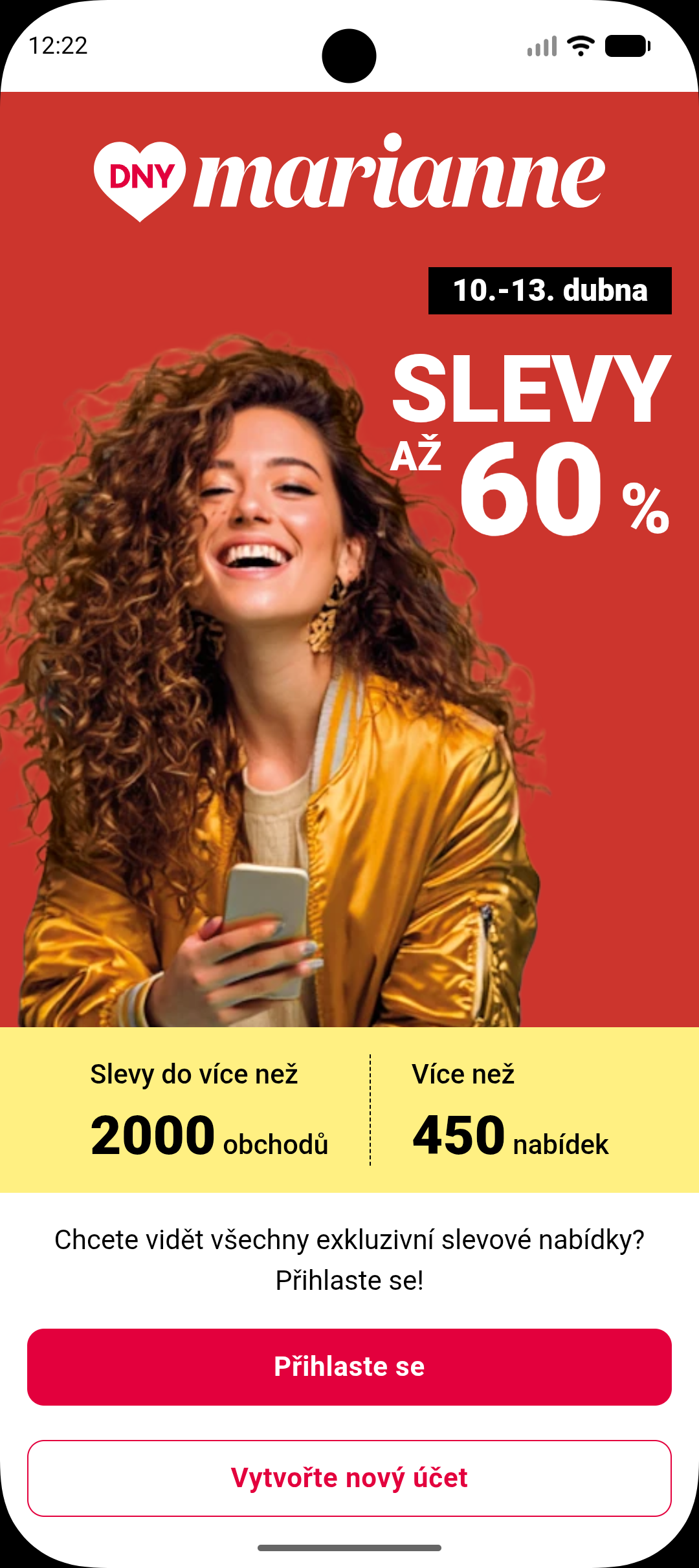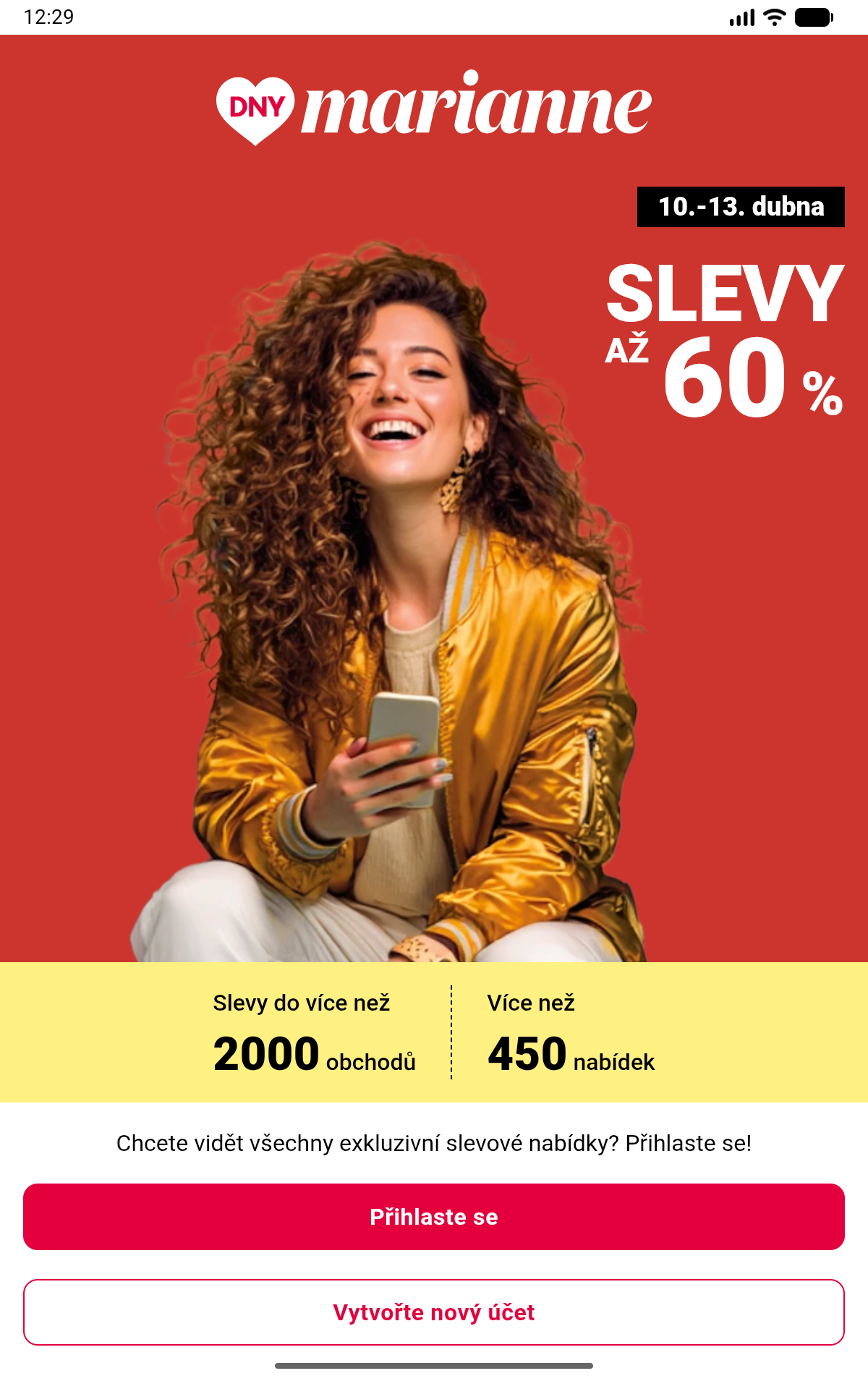 From September 12 to 15, you can explore over 550 offers featuring discounts as high as 60%—a fantastic four-day experience filled with shopping, savings, and amazing gifts! The DNY MARIANNE mobile app keeps you informed about the event. You can compile a list of your favorite deals within the app, utilize geolocation to find the nearest participating stores, ensuring you don't miss any opportunities for discounts. Additionally, we have special rewards and gifts available for you directly through the app in the new Marianne E-lounge. You can activate electronic coupons that can be used like traditional printed ones, priced at 120 CZK.