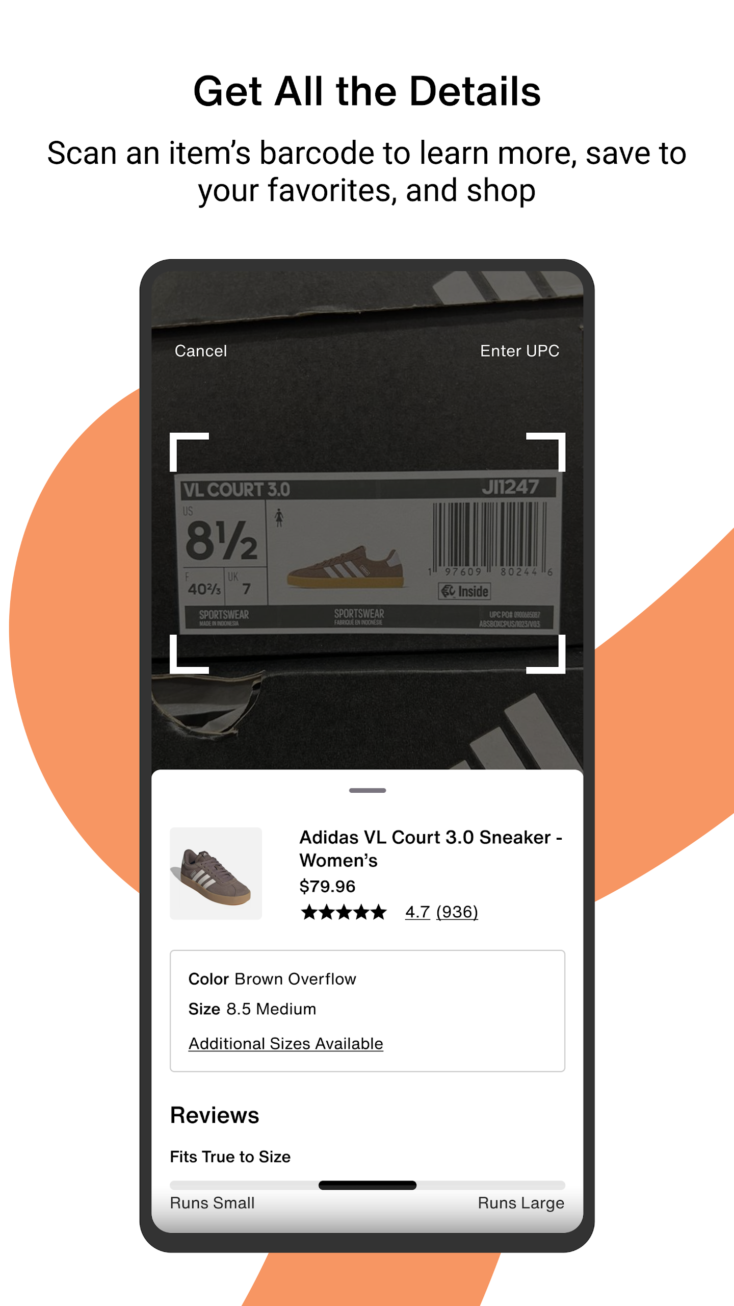 Expand Your Search: If your preferred size or color isn't available in-store, scan the barcode to explore options on dsw.com, read reviews, and get product details.